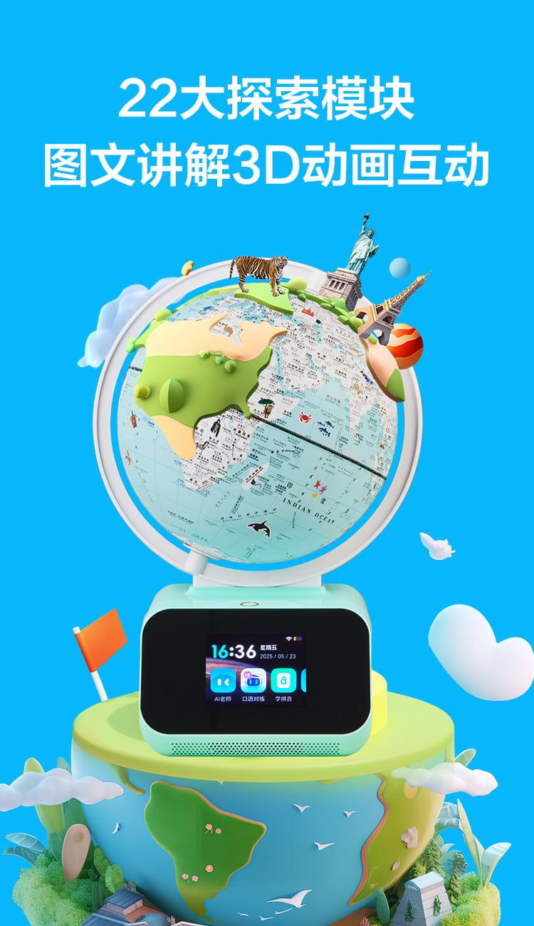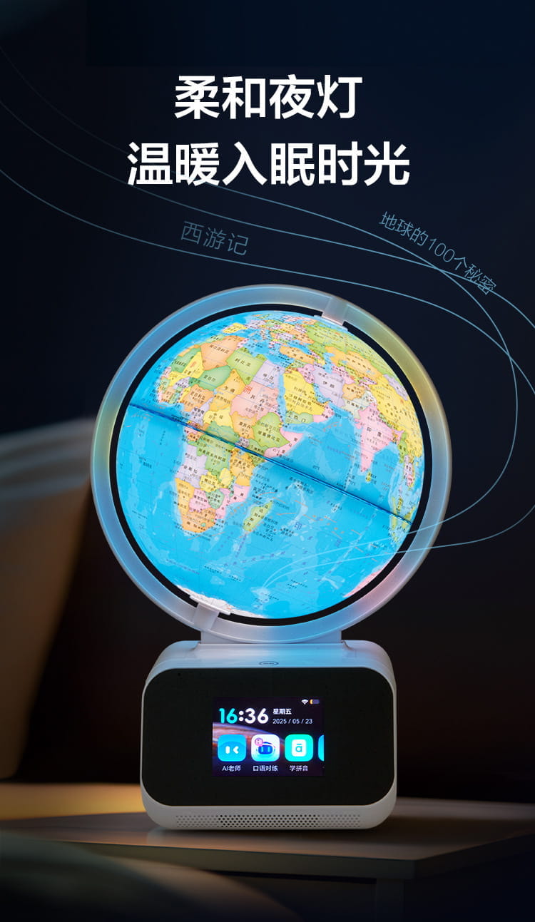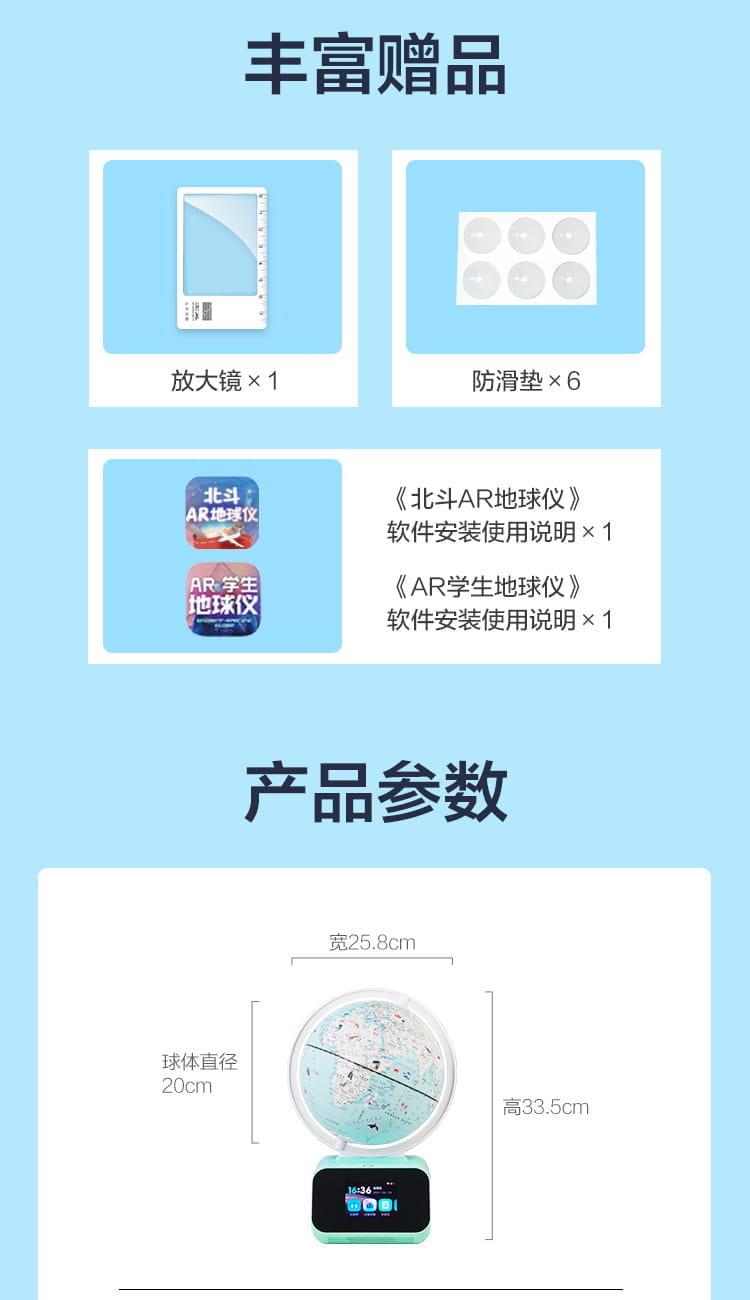 球体大小:20cm 产品尺寸:33.5*25.8*20cm 产品重量:1580g 产品构成:主机*1、中国地图1、世界地图*1、放大镜*1 AR互动地理学习,AI大模型智能语音互动,桌面智能学习工具,番茄智能时间管理,海量学习资源,温馨灯光