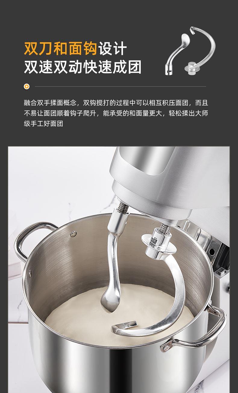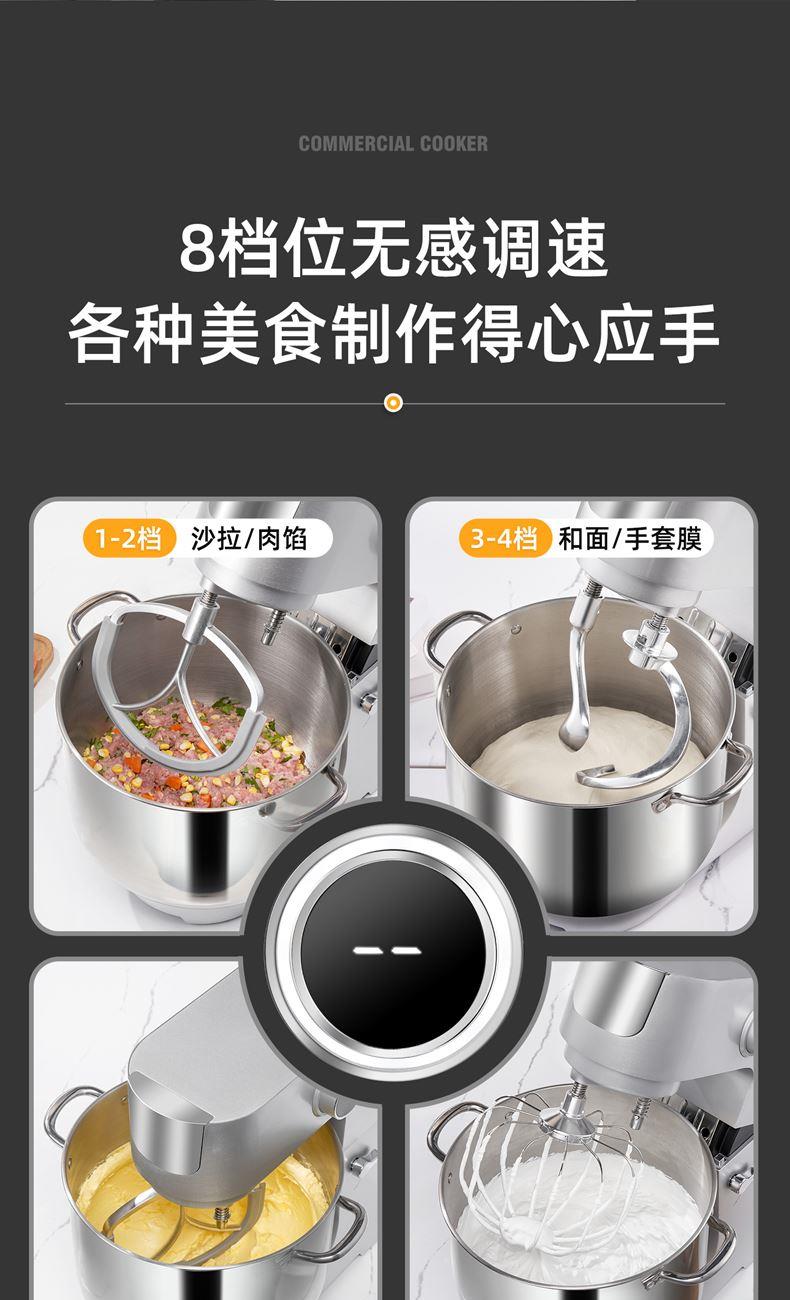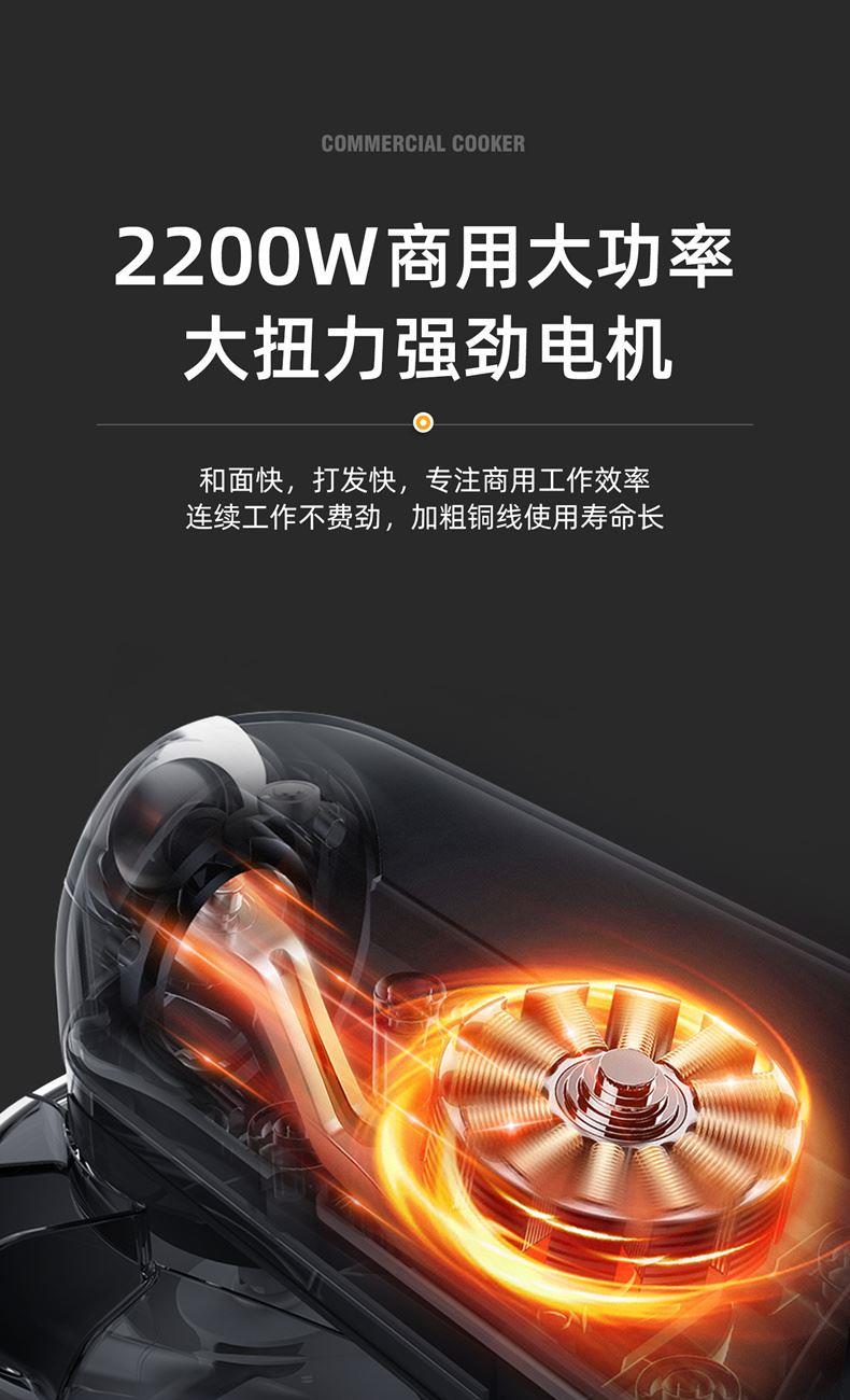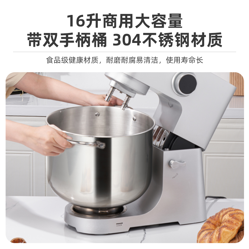 16L大容量,2200w商用大功率,大扭力强劲电机; 金属拉丝机身,不易刮花使用寿命长; IC芯片控制,保证揉面运行速度匀速稳定; 升级双刀和面钩,快速15分钟出膜,面团薄滑柔韧; 8档位无感调速,清晰数显大屏; 双重自冷散热装置保护电机寿命硅胶吸盘底座运行稳定不摇晃; 可选配拓展配件,新增更多玩法,一机多用;