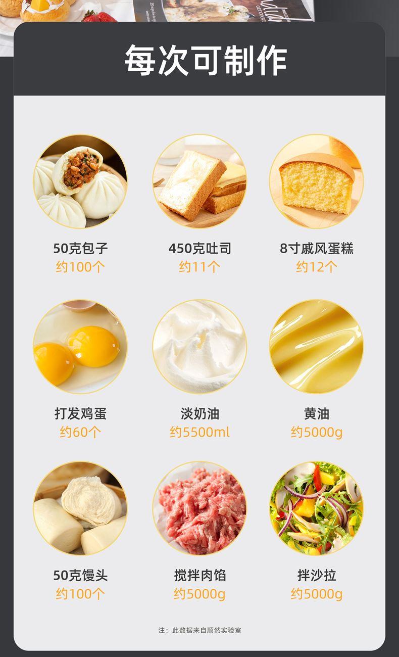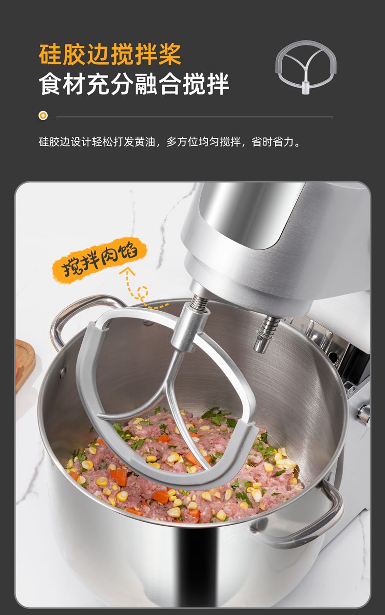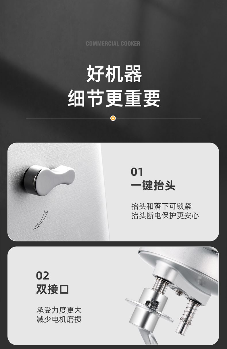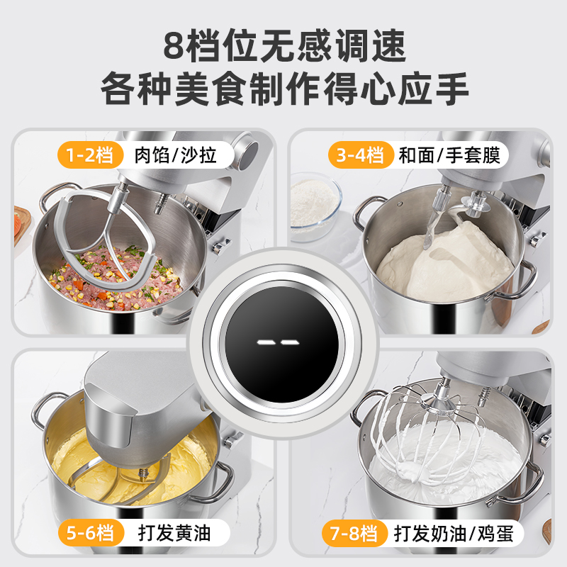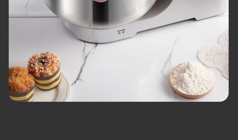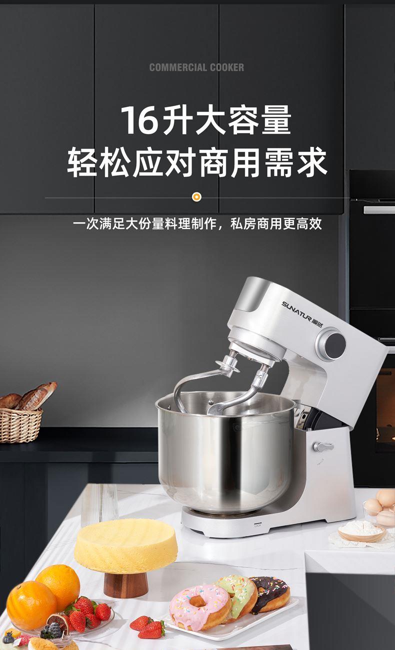 16L大容量,2200w商用大功率,大扭力强劲电机; 金属拉丝机身,不易刮花使用寿命长; IC芯片控制,保证揉面运行速度匀速稳定; 升级双刀和面钩,快速15分钟出膜,面团薄滑柔韧; 8档位无感调速,清晰数显大屏; 双重自冷散热装置保护电机寿命硅胶吸盘底座运行稳定不摇晃; 可选配拓展配件,新增更多玩法,一机多用;
