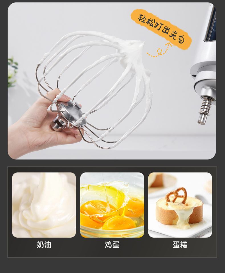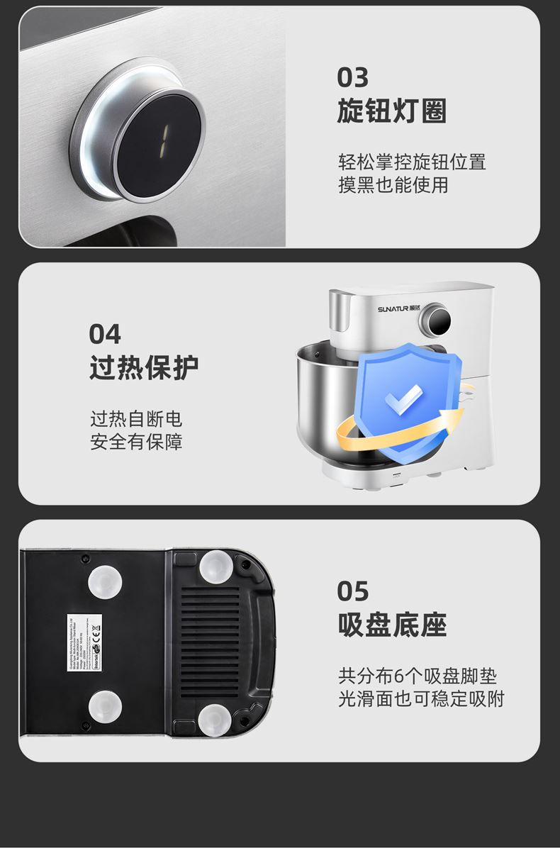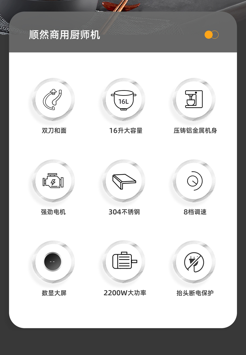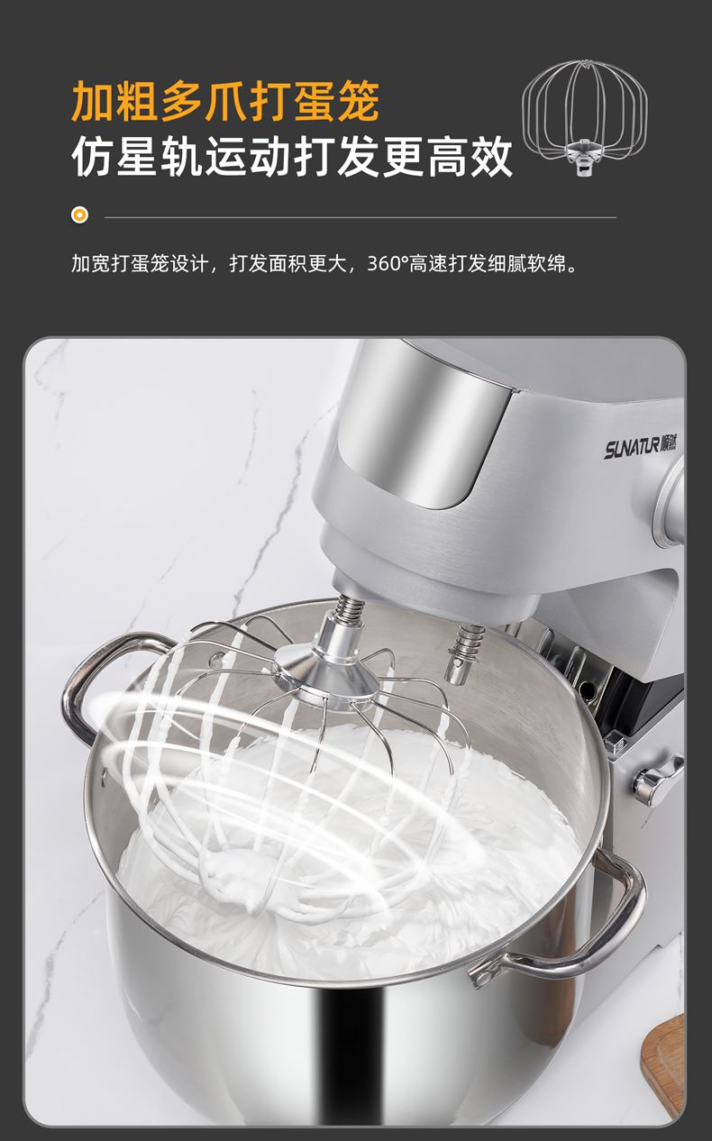 16L大容量,2200w商用大功率,大扭力强劲电机; 金属拉丝机身,不易刮花使用寿命长; IC芯片控制,保证揉面运行速度匀速稳定; 升级双刀和面钩,快速15分钟出膜,面团薄滑柔韧; 8档位无感调速,清晰数显大屏; 双重自冷散热装置保护电机寿命硅胶吸盘底座运行稳定不摇晃; 可选配拓展配件,新增更多玩法,一机多用;