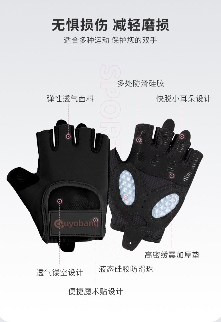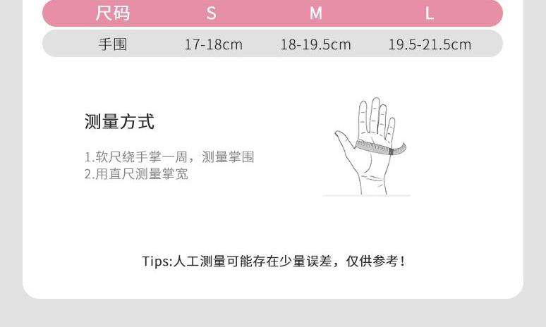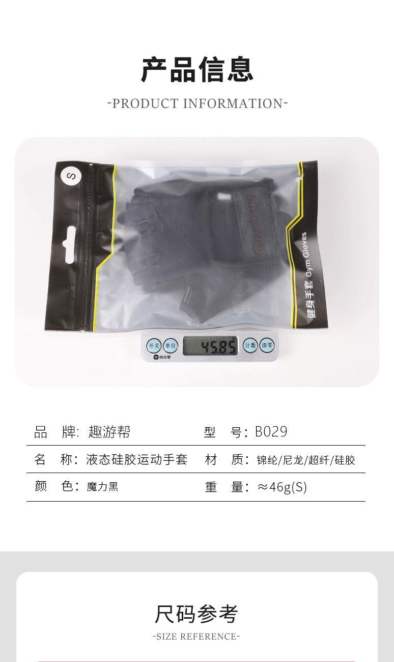 材质 锦纶/尼龙/超纤/硅胶 颜色 魔力黑 尺寸 S:17-18cm/M:18-19.5cm/L:19.4-21.5cm 重量 约46g/副(两只) 防滑耐磨,透气轻盈,适合多种运动,保护您的双手 弹性透气面料,液态硅胶防滑珠,快脱小耳设计 立体掌垫,紧致贴合,强力抓握,弯曲自如 轻量无感,全掌透气,无负重 液态硅胶防滑掌垫,3MM加厚按摩点式液态硅胶护垫,减震按摩,有效防滑