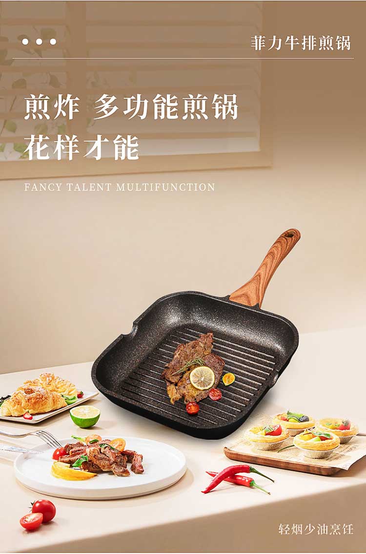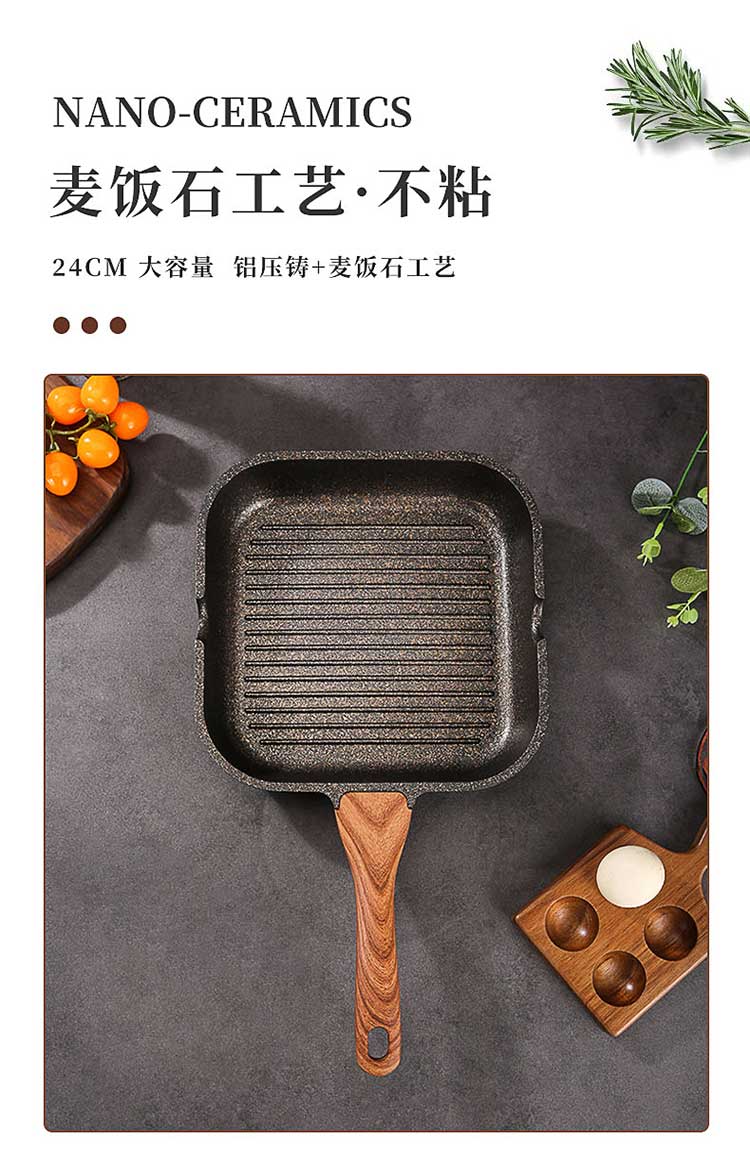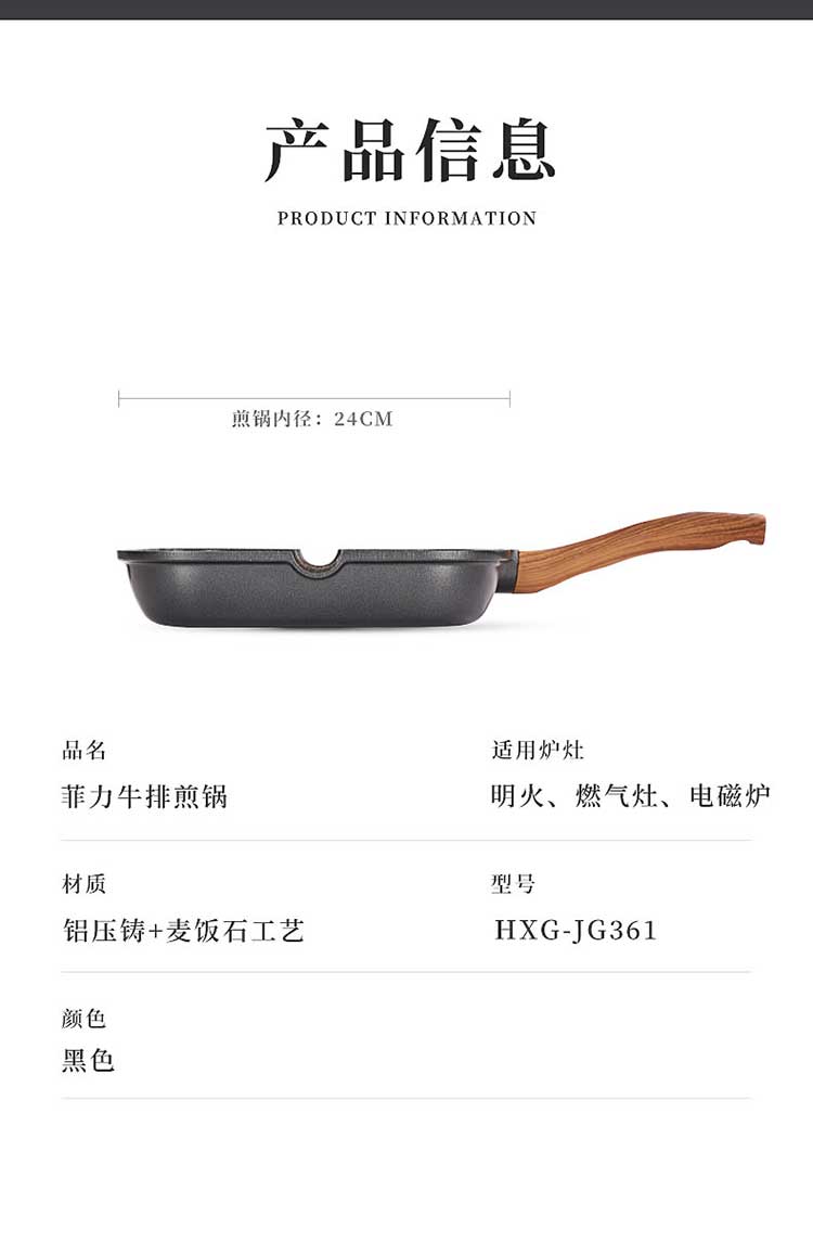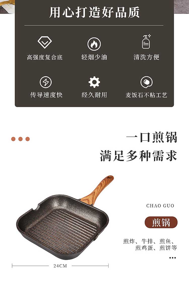 规 格:煎锅内径:24cm 材 质:铝压铸+麦饭石工艺 彩 盒 尺 寸:L46*W7.7*H26.5CM 外 箱 尺 寸:L63.6*W47.5*H55CM 1、一体成型的铝质锅身,导热均匀,受热快,少油烟,节能环保。 2、高强度复合底结构,加热更快更均匀,不易变形,不挑灶具,打造低碳节能新生活。 3、采用麦饭石不粘工艺,不粘性能优异,长时间使用也能历久弥新。 4、选用胶木手柄,隔热性能优异,握感舒适,增添厨房温馨自然气息,同时保障用户在烹饪过程中的安全与便利。