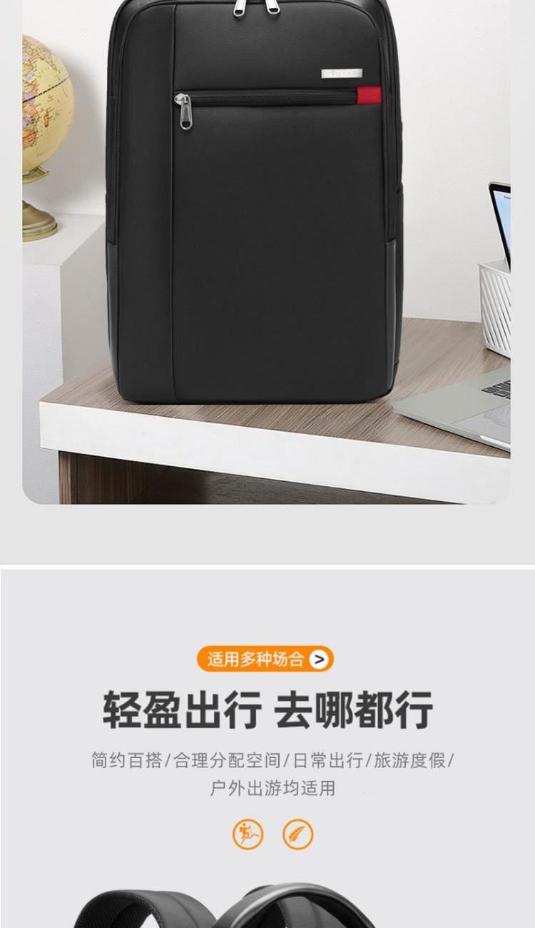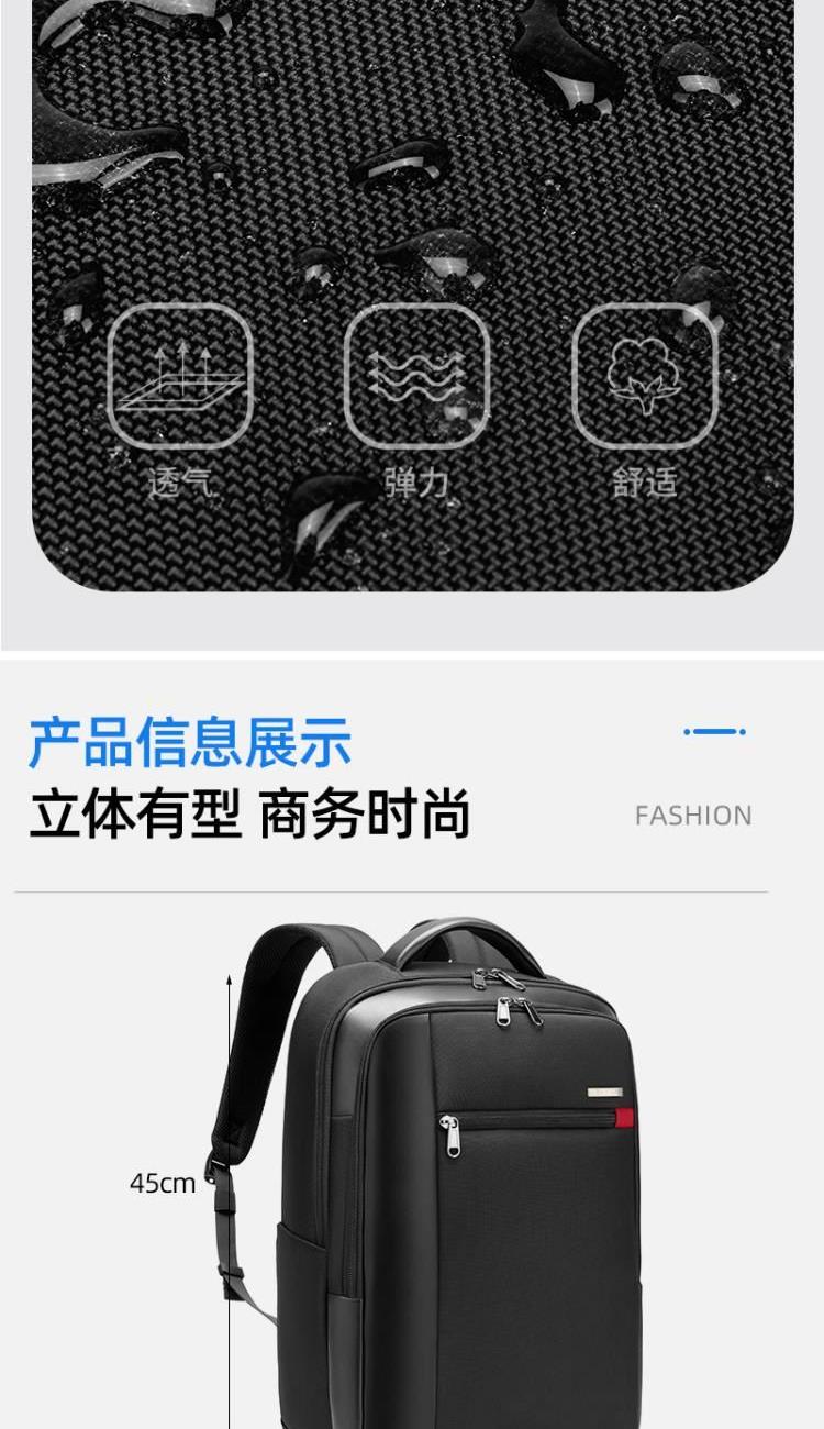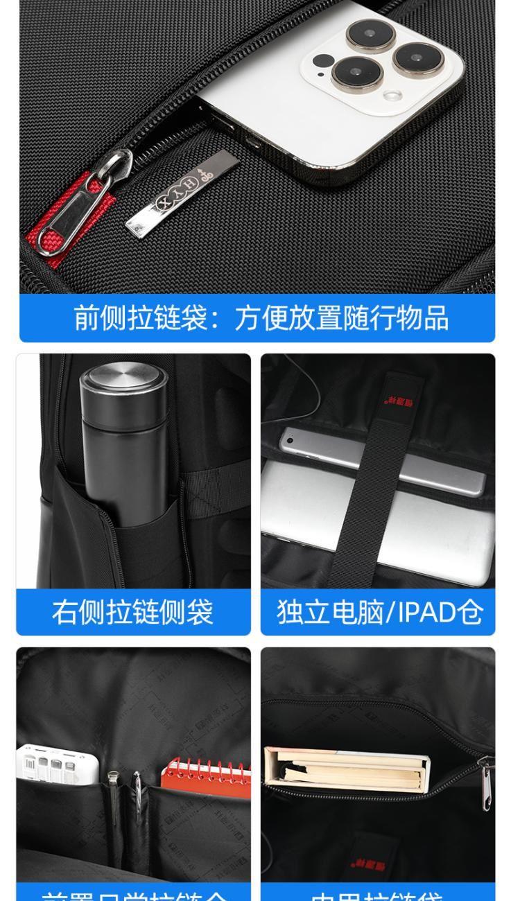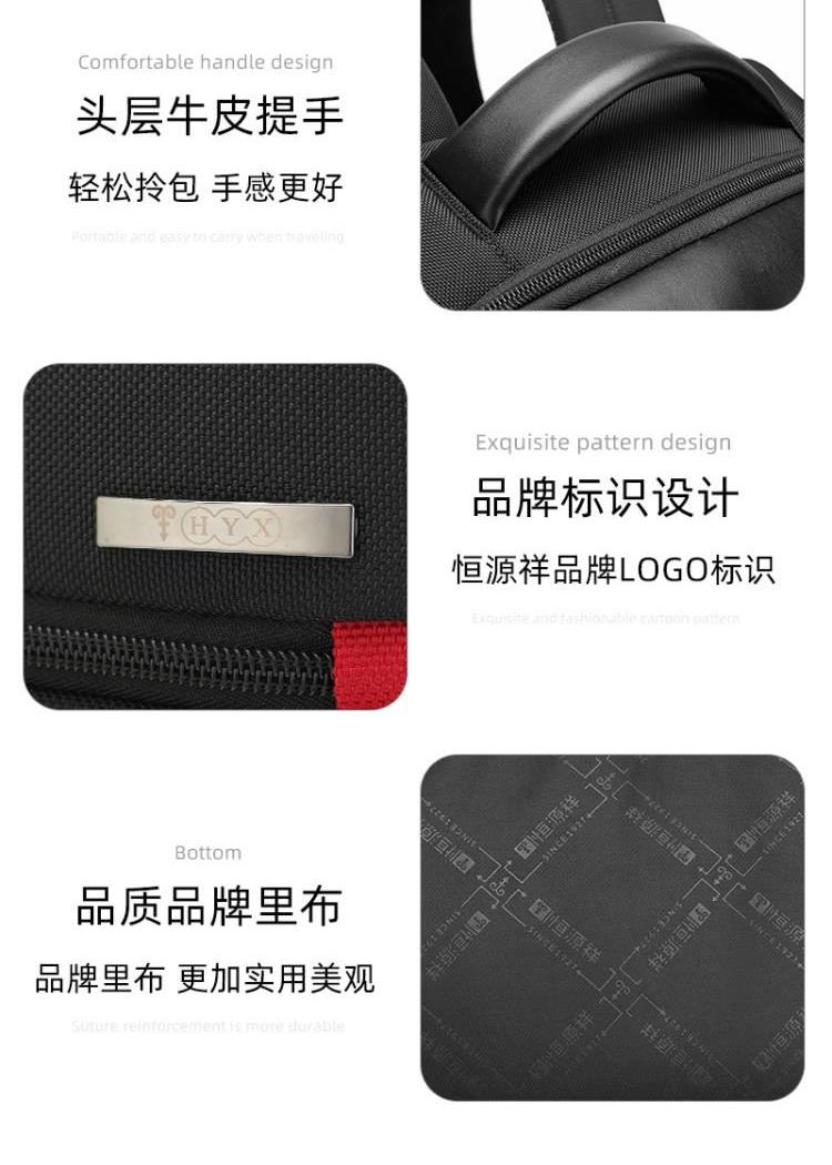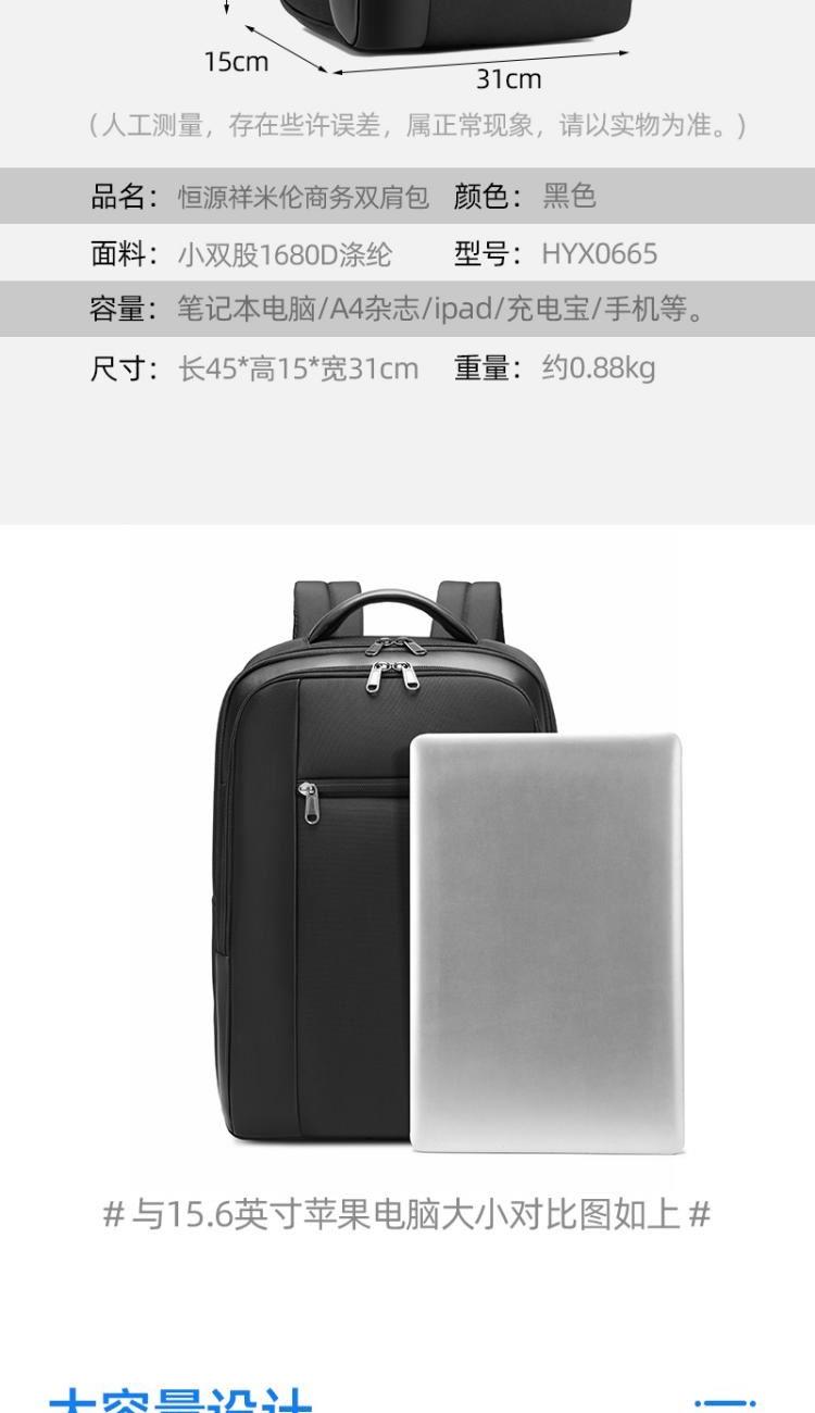 型号:HYX0665 颜色:黑色 材质:小双股1680D涤纶 规格:45*31*15cm 净重 :0.88kg 卖点:经典黑色立体融合,商务时尚范轻松切合场合,彰显商务气质的同时更具备时尚气息; 三层独立空间设计,空间利用率高。 主仓空间满足你的短途出差需求,内设笔记本电脑层、平板层,可同时容纳15.6寸电脑、平板电脑; 前袋可分区放置办公用品、签字笔,商务办公得心应手; 外层小物件拉链袋,零钱票据再也不用大海捞针了; 新款翻盖式USB转接口,双头双接口(含Type-C); 恒源祥专属定制SBS锌合金拉头,顺滑、质感; 恒源祥定制专属LOGO黑色里布,品质感强; 背部EVA一体热压防震透气背负系统,同步配有拉杆便携织带。