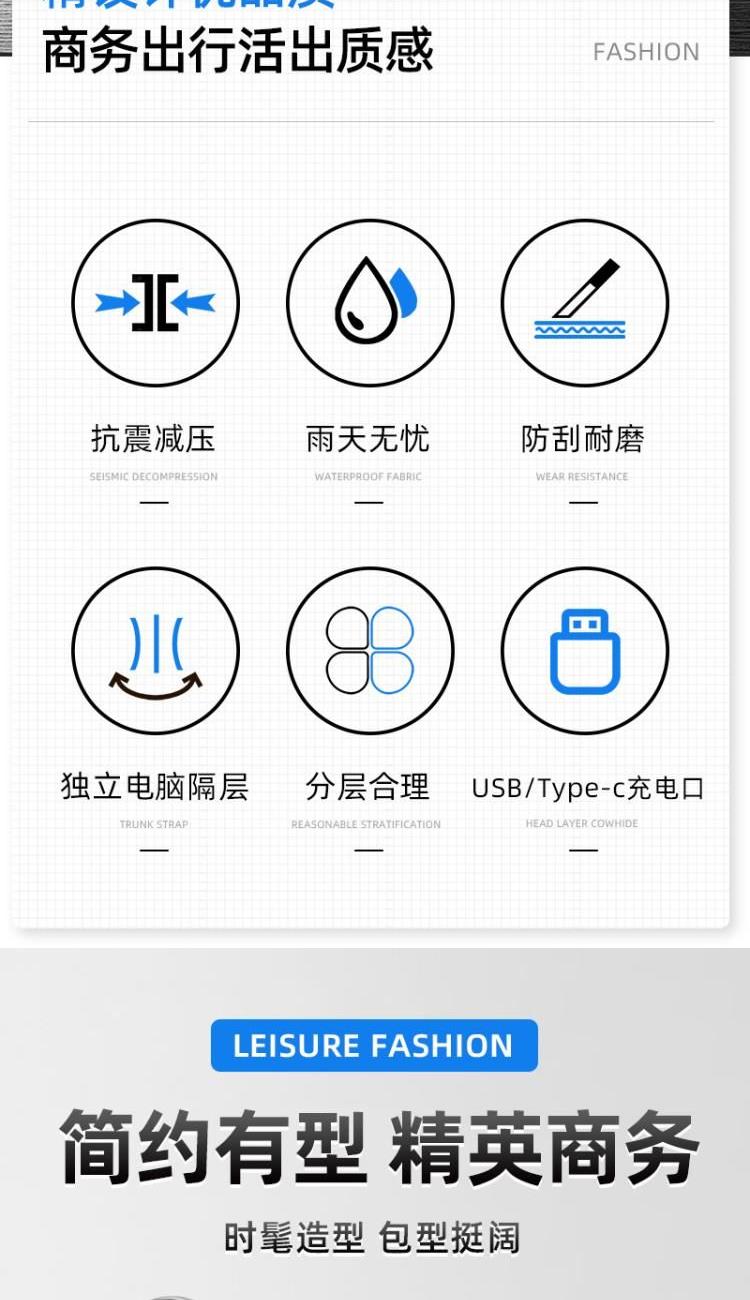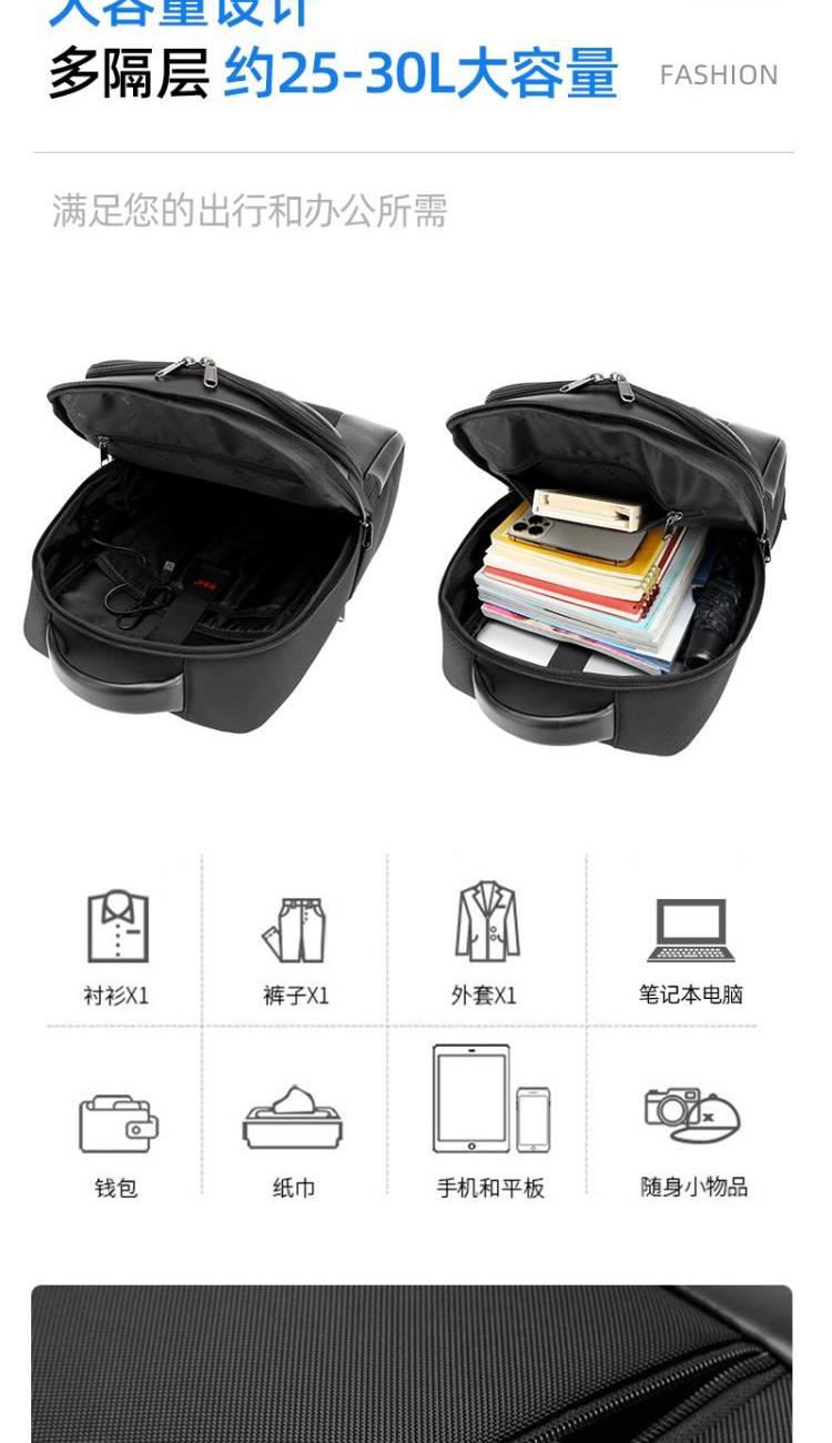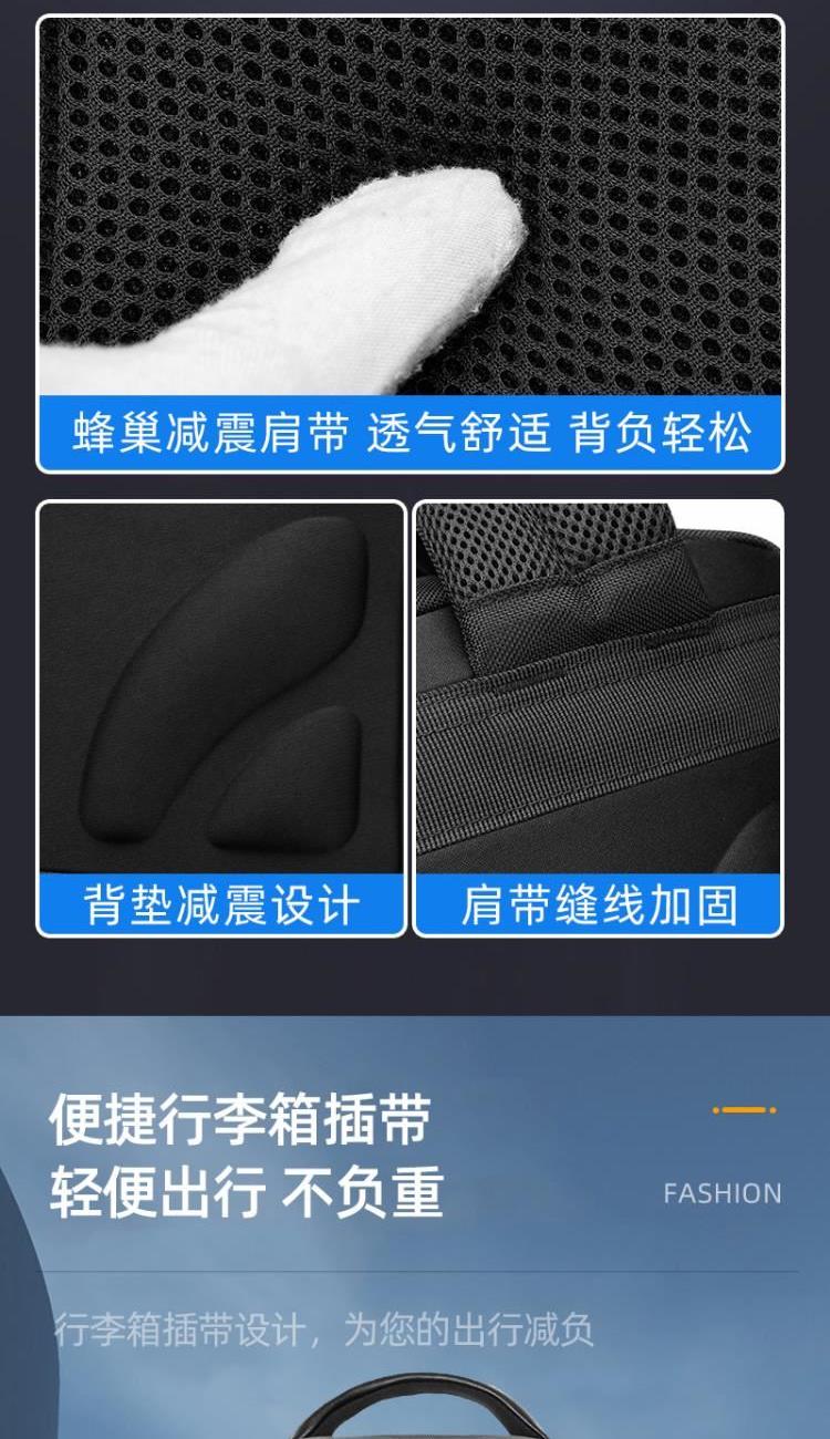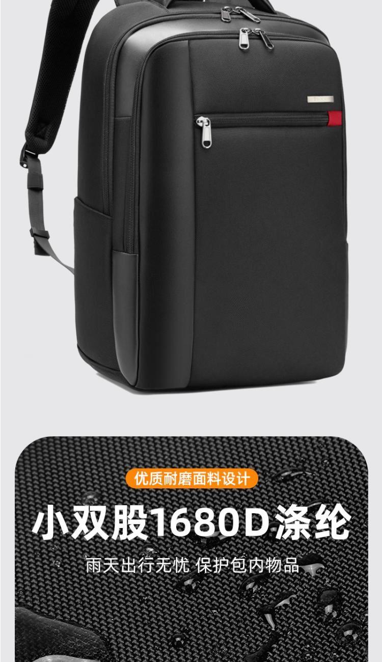 型号:HYX0665 颜色:黑色 材质:小双股1680D涤纶 规格:45*31*15cm 净重 :0.88kg 卖点:经典黑色立体融合,商务时尚范轻松切合场合,彰显商务气质的同时更具备时尚气息; 三层独立空间设计,空间利用率高。 主仓空间满足你的短途出差需求,内设笔记本电脑层、平板层,可同时容纳15.6寸电脑、平板电脑; 前袋可分区放置办公用品、签字笔,商务办公得心应手; 外层小物件拉链袋,零钱票据再也不用大海捞针了; 新款翻盖式USB转接口,双头双接口(含Type-C); 恒源祥专属定制SBS锌合金拉头,顺滑、质感; 恒源祥定制专属LOGO黑色里布,品质感强; 背部EVA一体热压防震透气背负系统,同步配有拉杆便携织带。