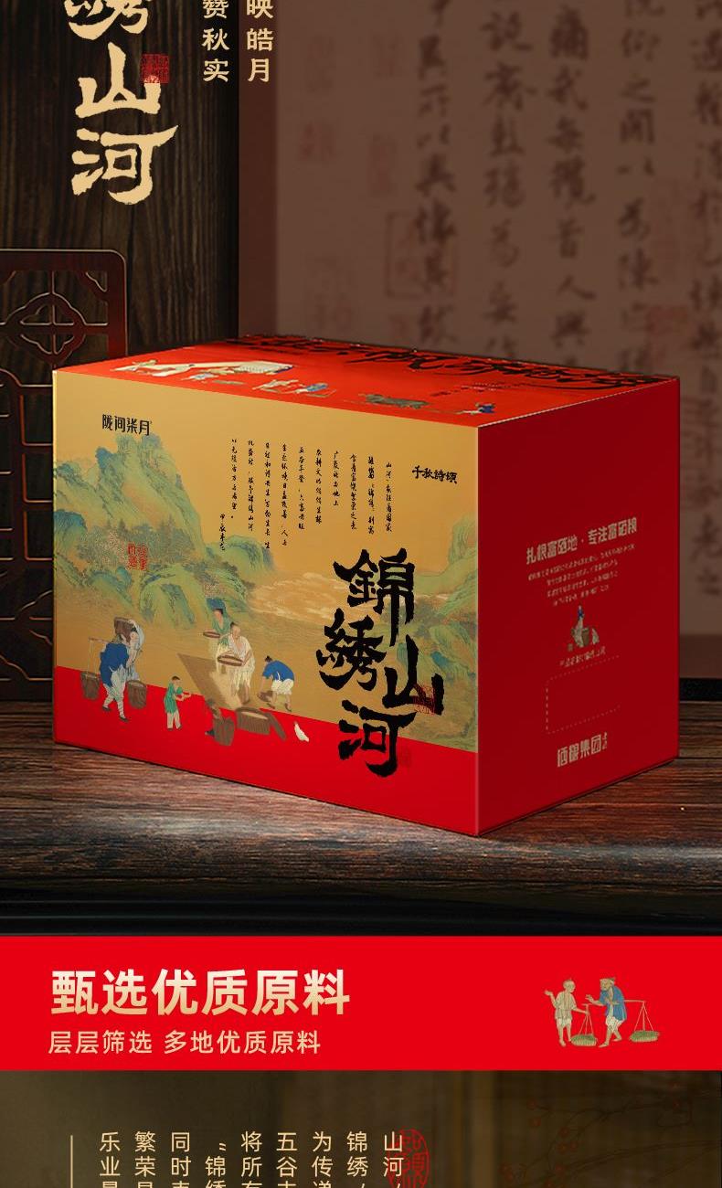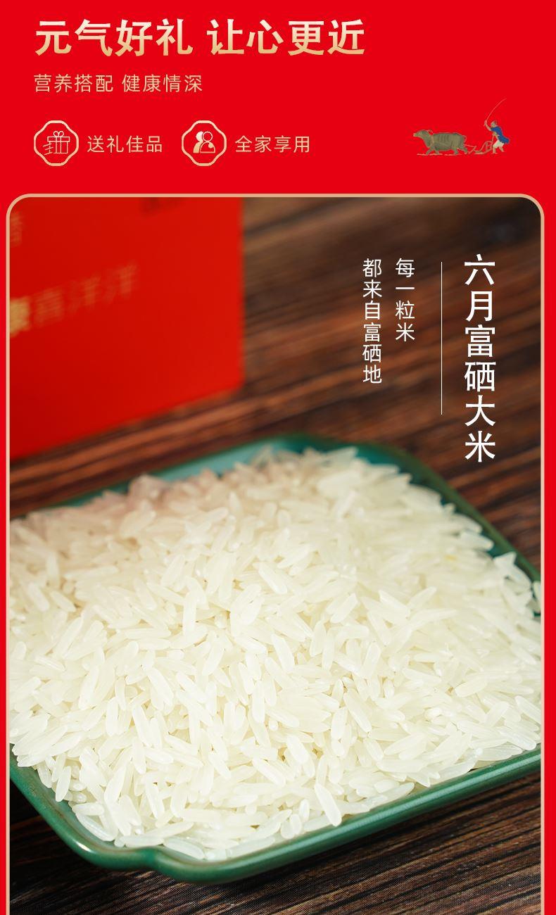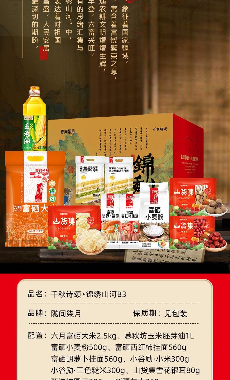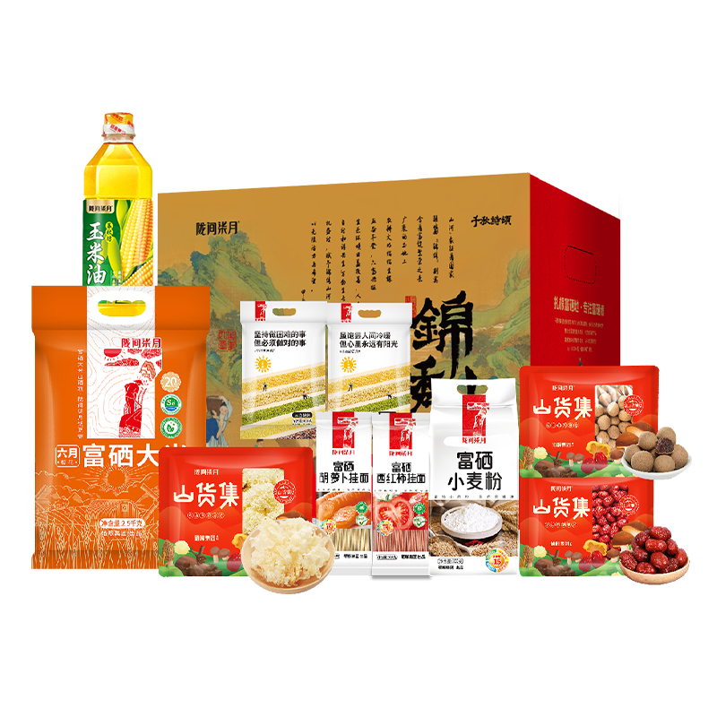 六月富硒大米2.5kg、玉米胚芽油1L、富硒小麦粉500g、富硒西红柿挂面560g、富硒胡萝卜面560g 小谷励小米300g、小谷励三色糙米300g、雪花银耳80g甄选桂圆干200g、新疆灰枣350g 尺 寸:420×260×300mm 1、六月富硒大米源自世界硒都·湖北恩施,南方籼米,鲜稻现碾; 2、桂圆干:肉厚核小、果肉香甜,新疆灰枣:肉质紧实、滋补佳品; 3、御田胭脂红米来自河北丰南,色泽红亮; 4、精选非转基因优质玉米,物理压榨。