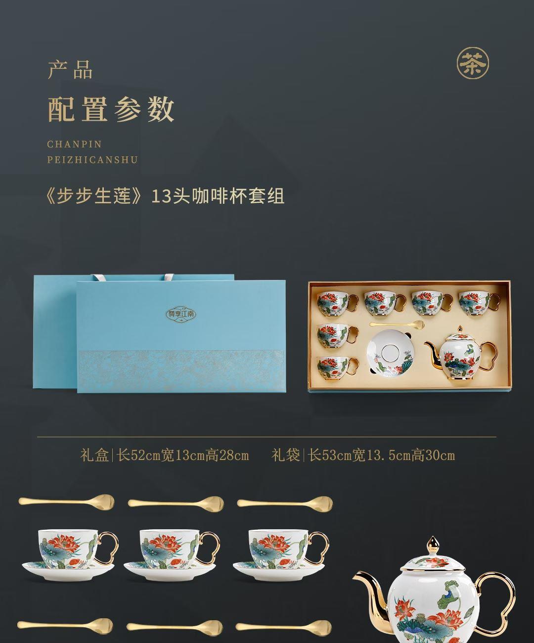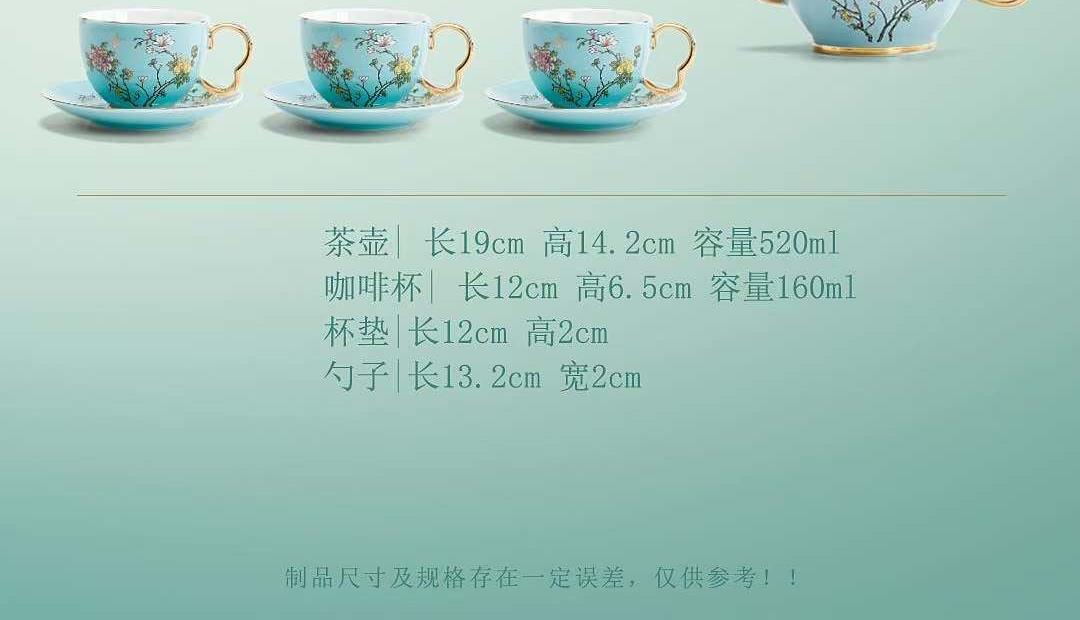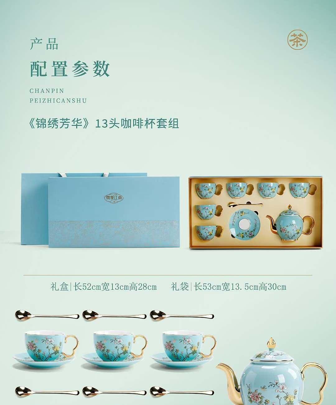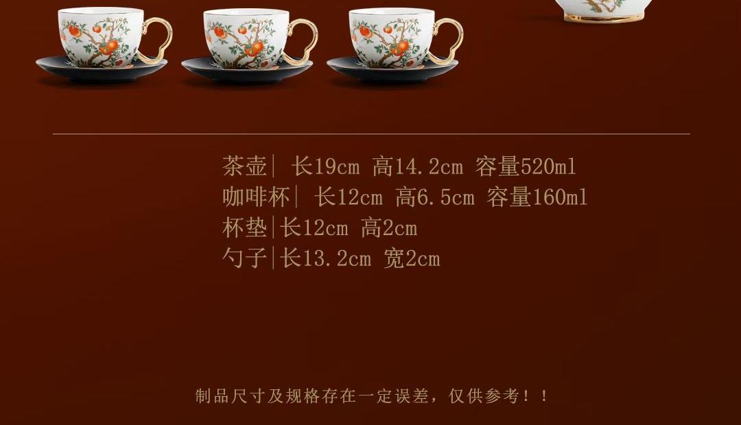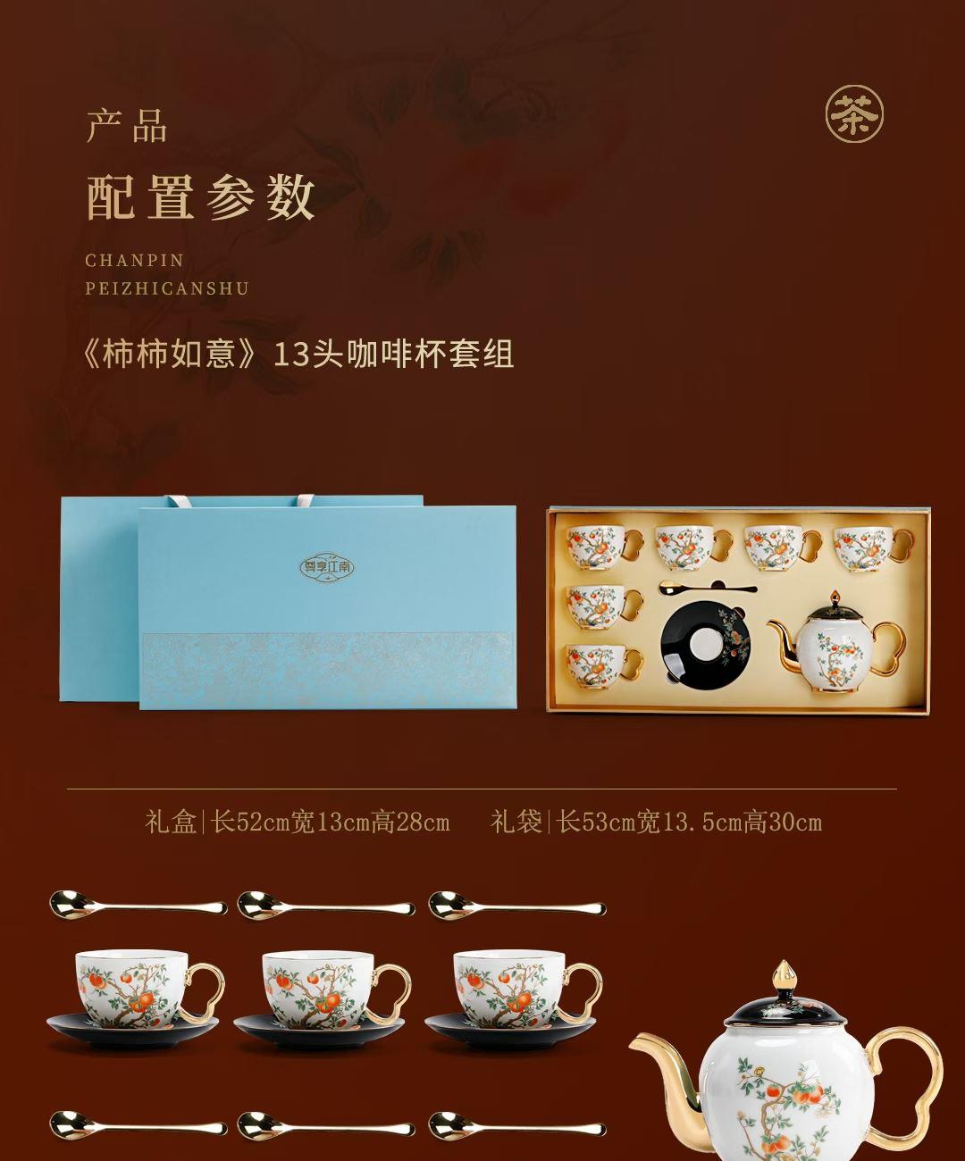 配置:茶壶*1,茶杯*6,茶碟*6,茶勺*6. 尺寸:茶壶长19cm高14.2cm容量520ml, 咖啡杯长12cm高6.5cm容量160ml, 杯垫长12cm高2cm, 勺子长13.2cm宽2cm。 礼盒:长52cm宽13cm高28cm, 礼袋:长53cm宽13.5cm高30cm。 款式:锦绣芳华/柿柿如意/步步生莲。