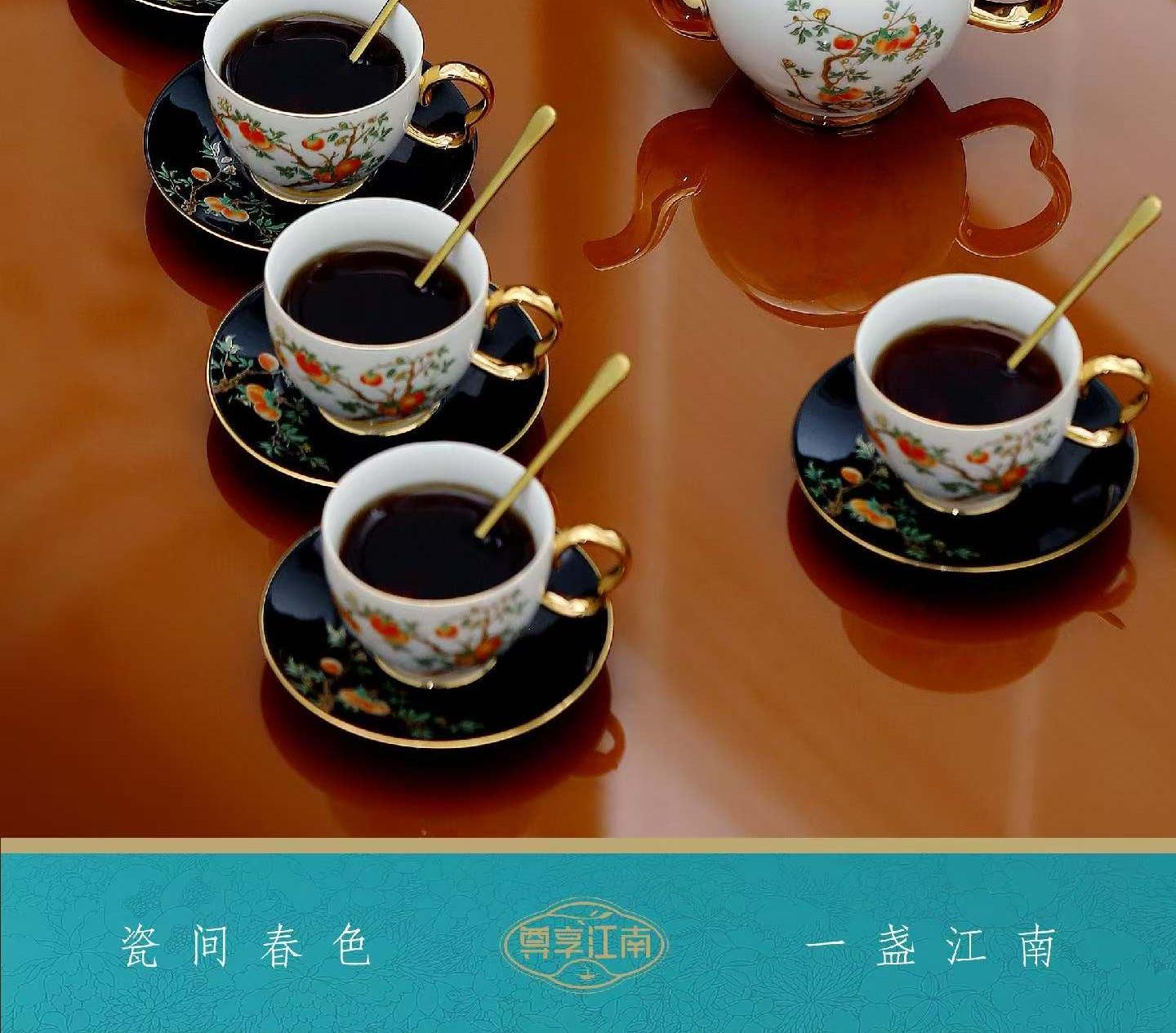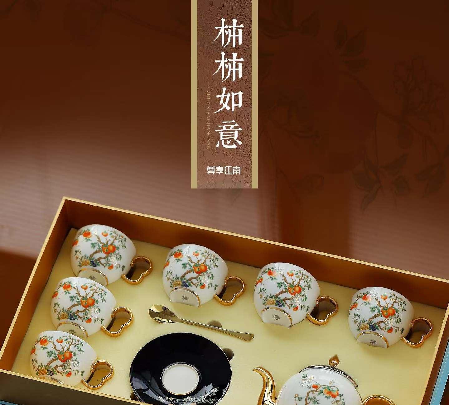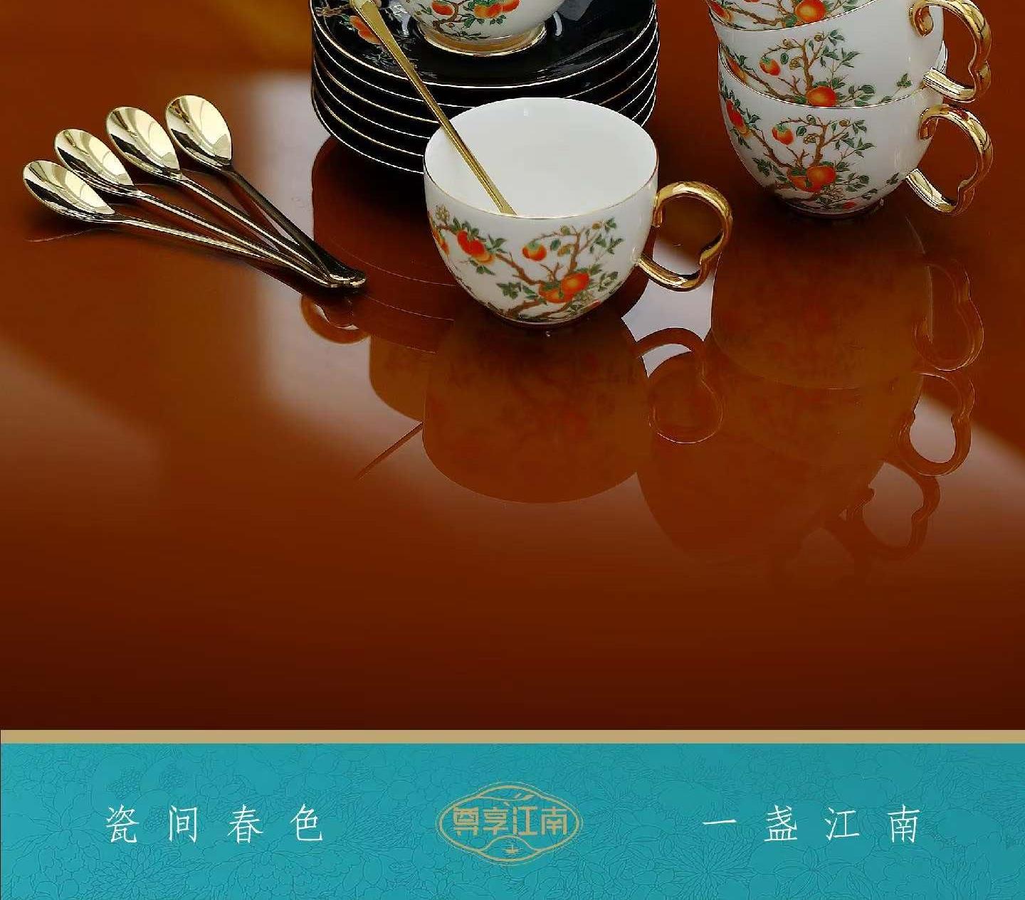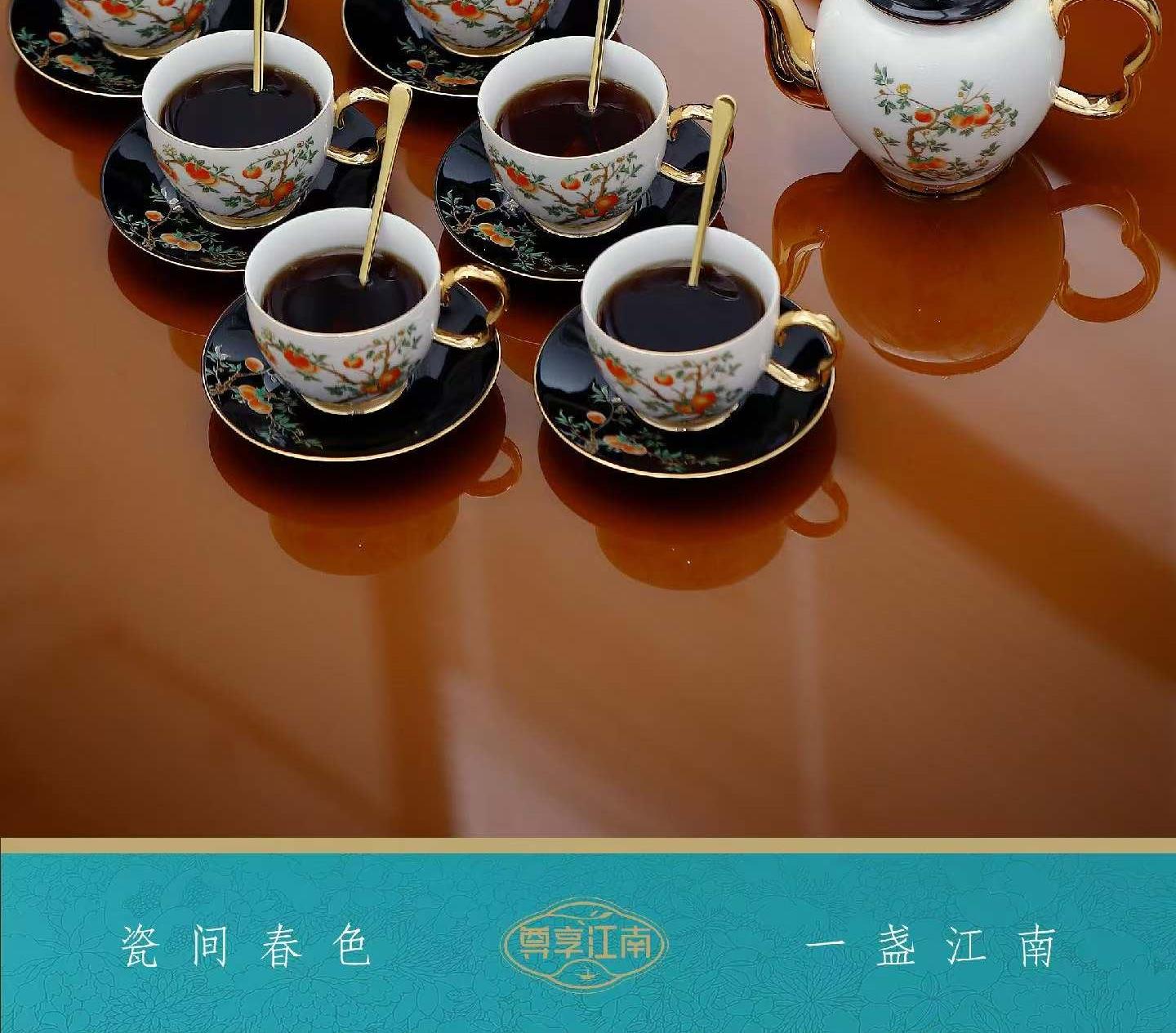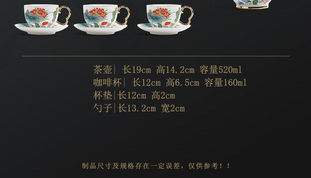 配置:茶壶*1,茶杯*6,茶碟*6,茶勺*6. 尺寸:茶壶长19cm高14.2cm容量520ml, 咖啡杯长12cm高6.5cm容量160ml, 杯垫长12cm高2cm, 勺子长13.2cm宽2cm。 礼盒:长52cm宽13cm高28cm, 礼袋:长53cm宽13.5cm高30cm。 款式:锦绣芳华/柿柿如意/步步生莲。