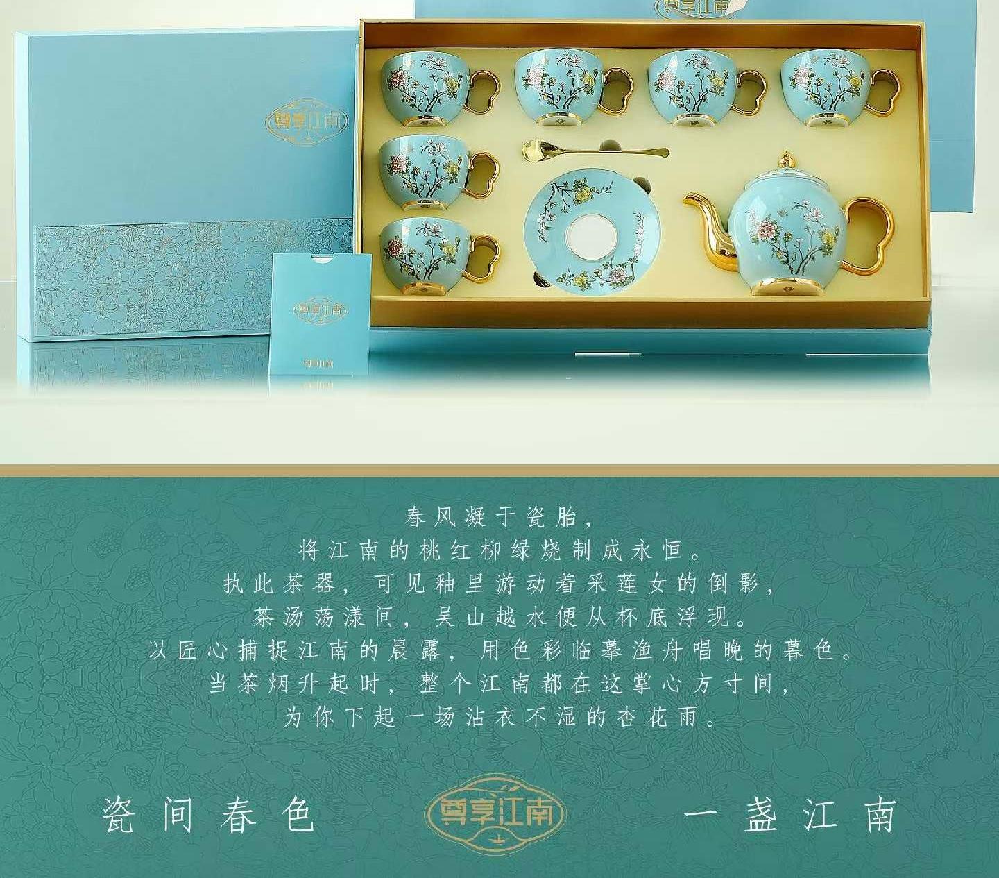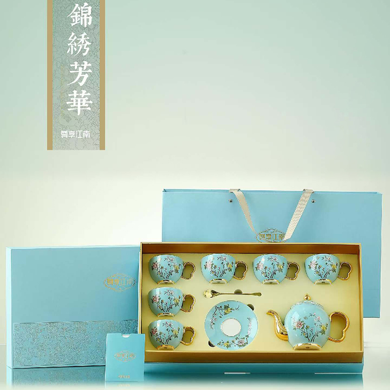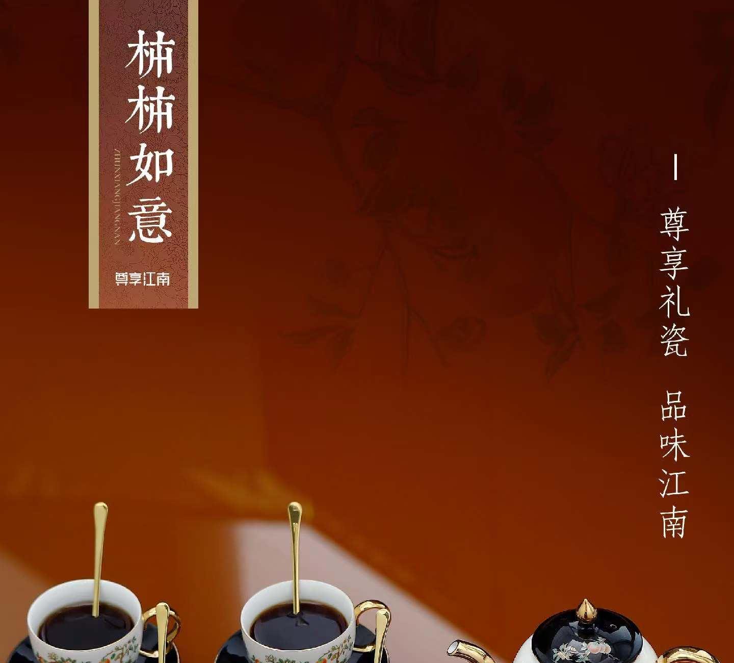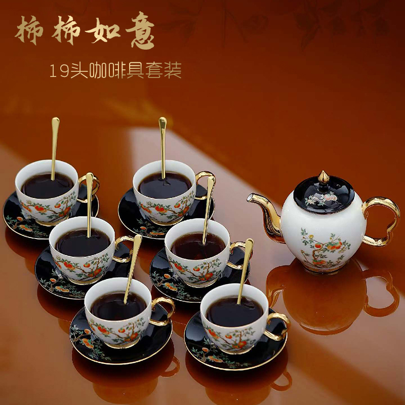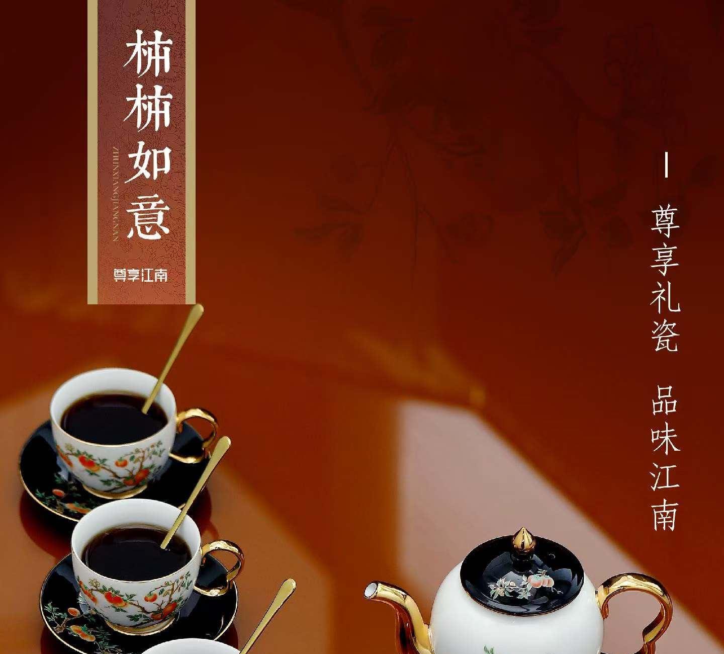 配置:茶壶*1,茶杯*6,茶碟*6,茶勺*6. 尺寸:茶壶长19cm高14.2cm容量520ml, 咖啡杯长12cm高6.5cm容量160ml, 杯垫长12cm高2cm, 勺子长13.2cm宽2cm。 礼盒:长52cm宽13cm高28cm, 礼袋:长53cm宽13.5cm高30cm。 款式:锦绣芳华/柿柿如意/步步生莲。