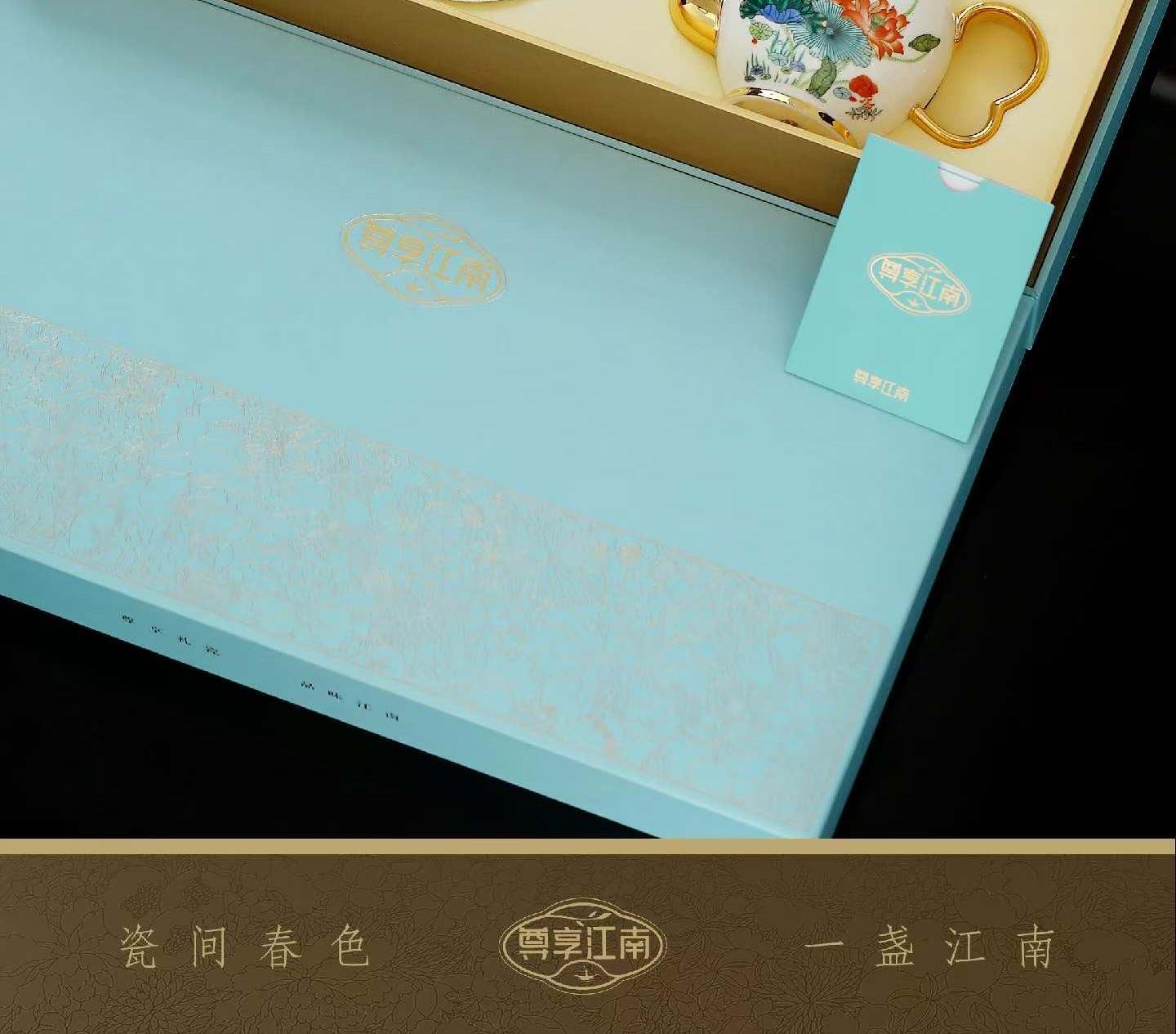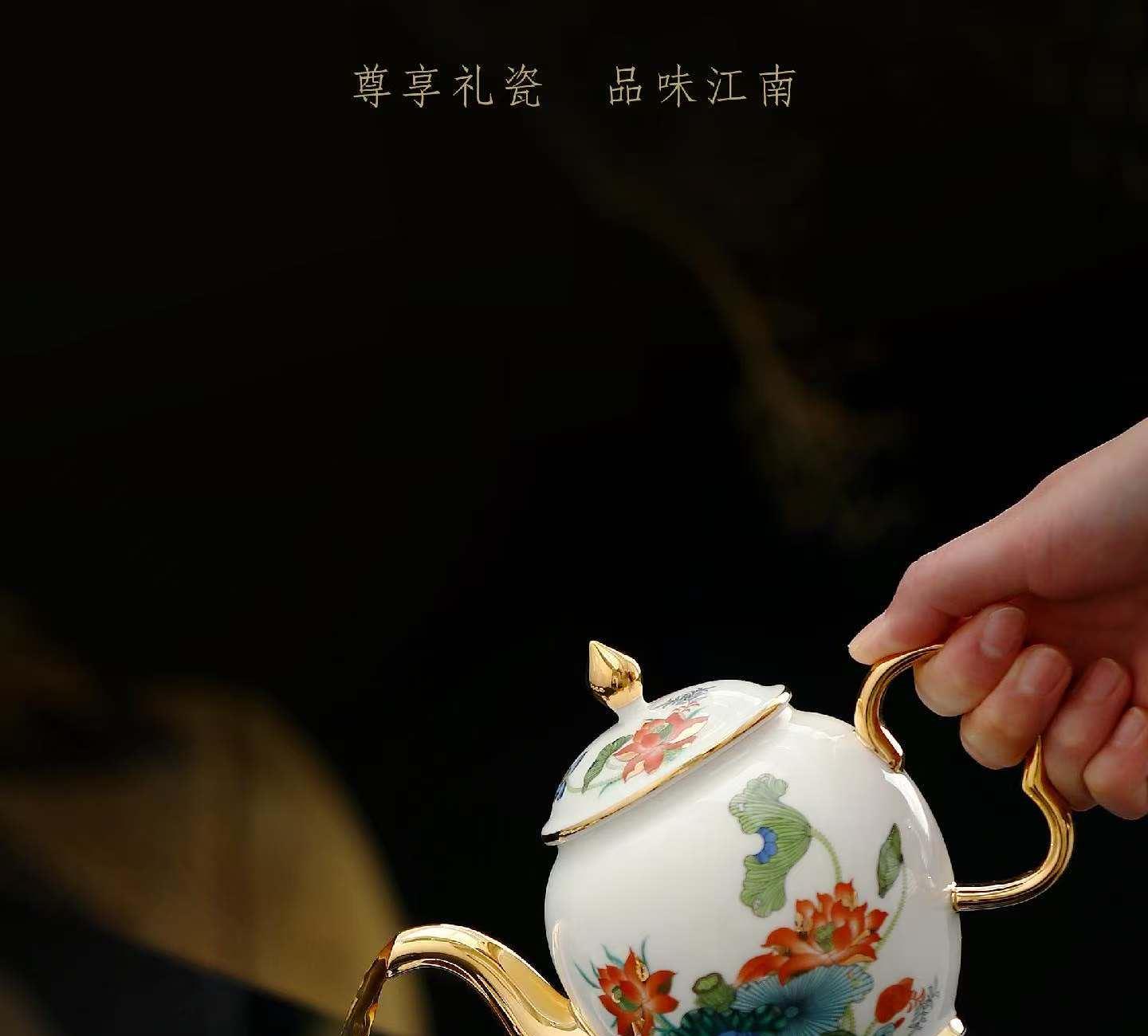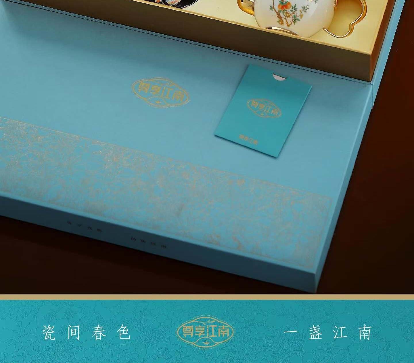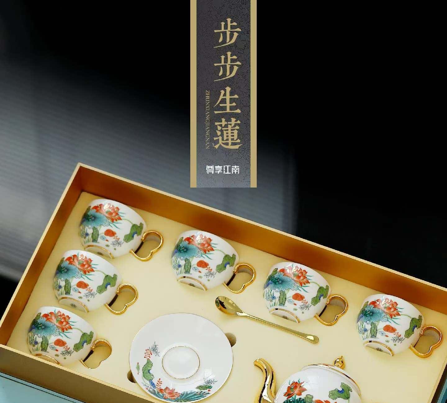 配置:茶壶*1,茶杯*6,茶碟*6,茶勺*6. 尺寸:茶壶长19cm高14.2cm容量520ml, 咖啡杯长12cm高6.5cm容量160ml, 杯垫长12cm高2cm, 勺子长13.2cm宽2cm。 礼盒:长52cm宽13cm高28cm, 礼袋:长53cm宽13.5cm高30cm。 款式:锦绣芳华/柿柿如意/步步生莲。