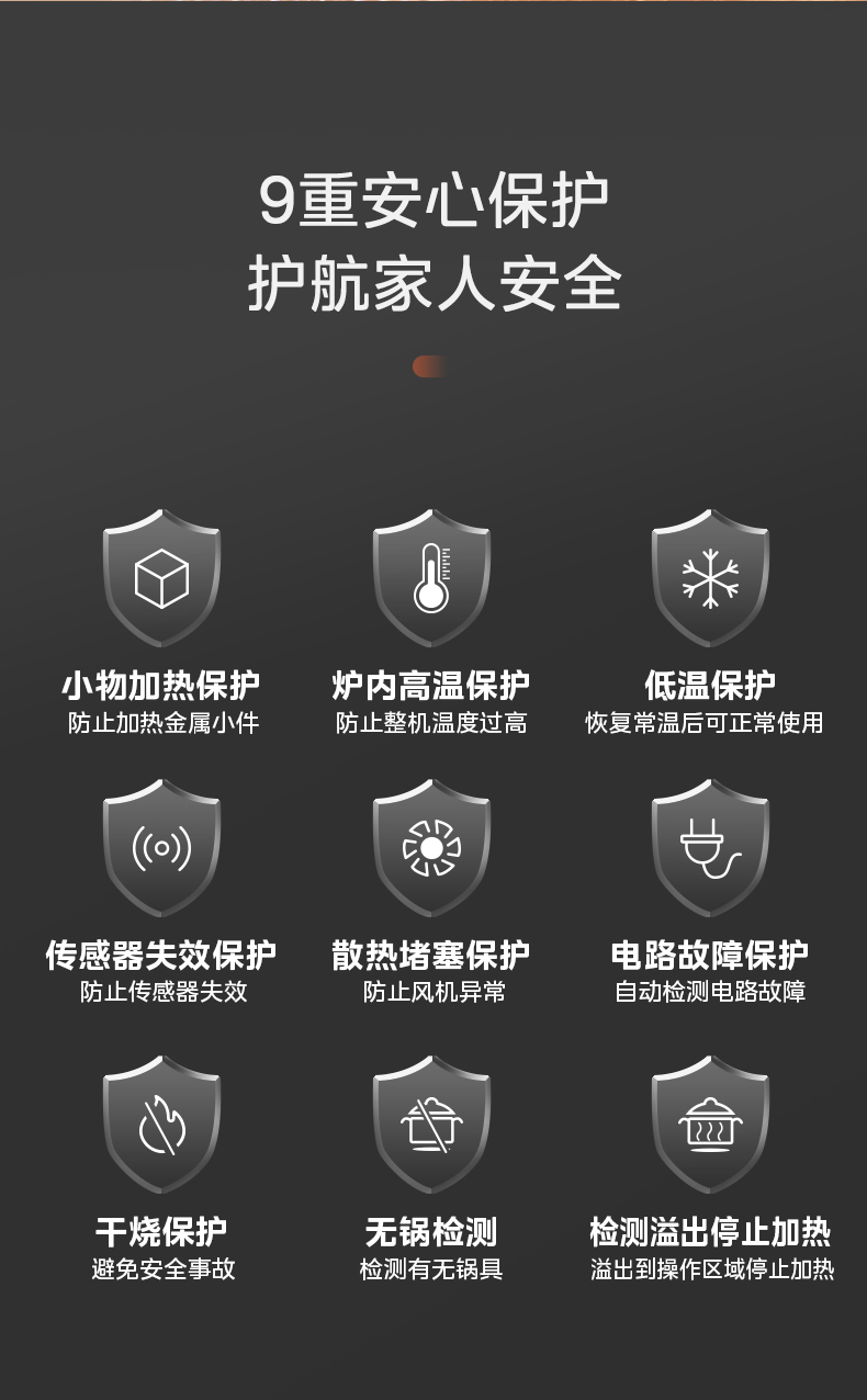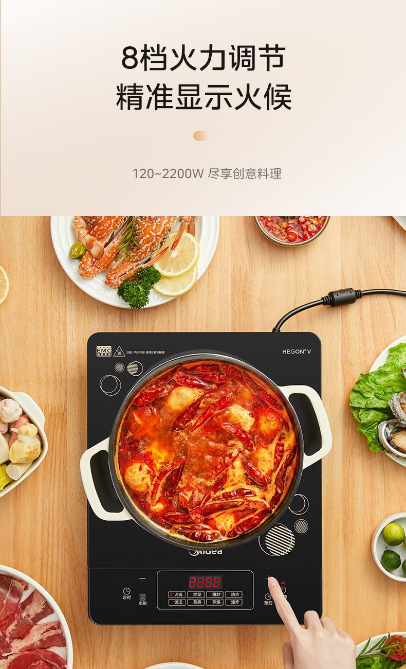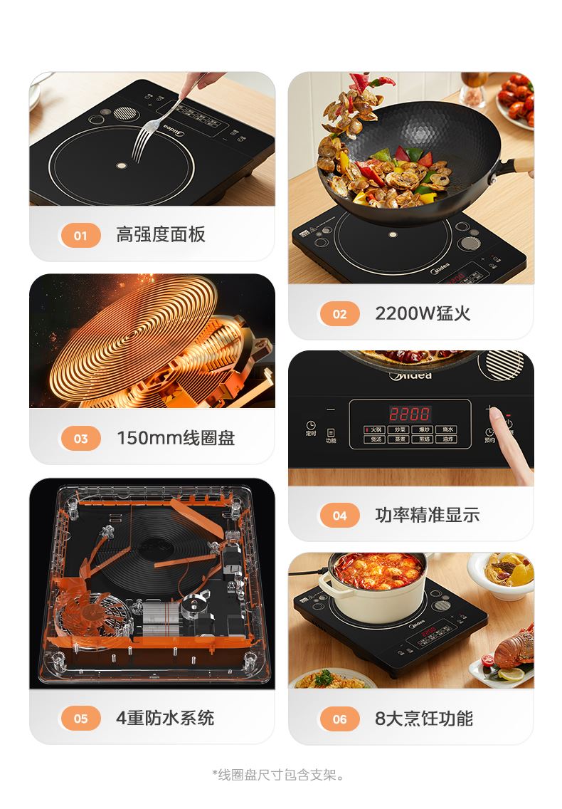 产品规格: 产品尺寸:350 x 280 x 60 mm 包装尺寸:342 x 110 x 477 mm 产品毛重:1.95kg 产品特点: 一体大面板,防刮耐磨耐用 2200W猛火,热效率高达86%,还原爆炒锅气 150mm双层线圈盘,聚能复式线圈盘均匀加热不易焦糊 8档火力调节,可显示火候 8大烹饪功能,美味不重样 3小时定时,24小时预约