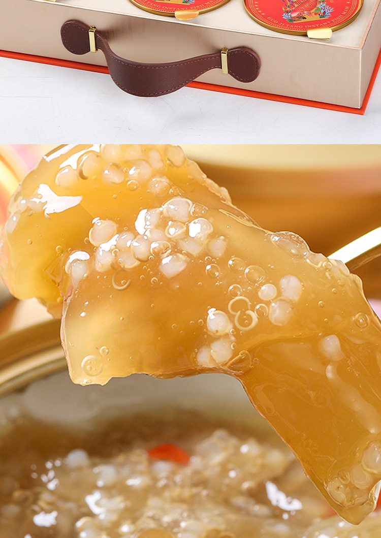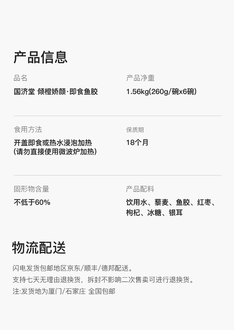 配置:6碗/盒固形物含量≥60% 净含量:260克*6碗 配料:饮用水、藜麦、鱼胶、红枣、枸杞、银耳。 食用方法:开盖即食/加热食用,存放于阴凉干燥处。 产品特点: 国济堂-“T(堂)”系列全新包装设计,采用辨识度极高的亮橙色; 突破传统,开盖即食,滋补养颜;多吃花胶,素颜的你依然很美, 适用于公司福利、银行保险行业中低价段礼品系列,自用送礼俱佳。