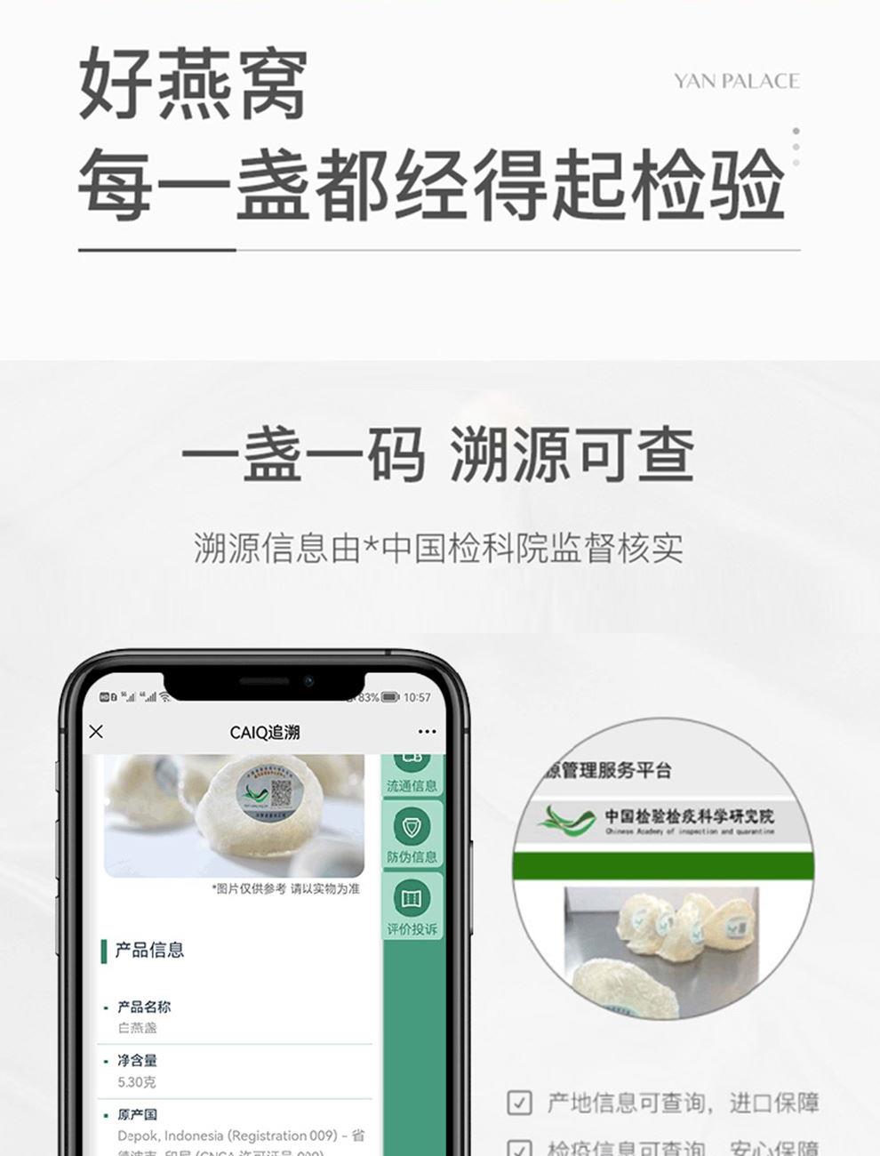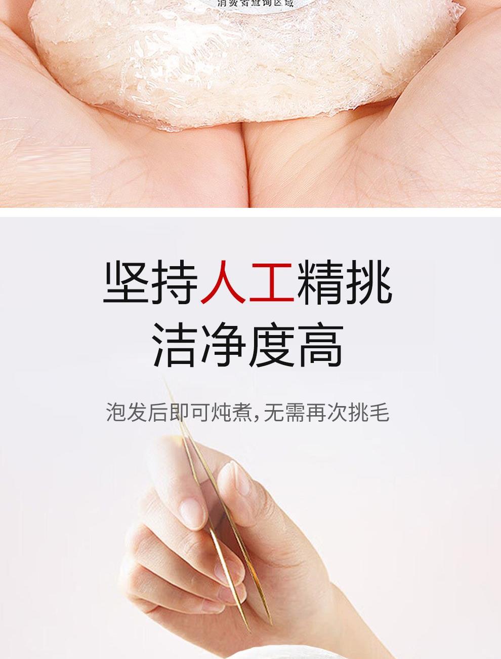 规格:溯源大盏50克 卖点: 1、一盏一码,溯源可查,品质有保障。 2、不刷胶,不补碎,泡发率高达8-10倍。 3、99.9%洁净度,足干足称,不为一滴水分买单。 4、节省时间、免泡发燕盏省去了泡发的时间,可以开始炖煮。 5、免泡发燕盏的加工过程更加标准化,品质更加稳定。