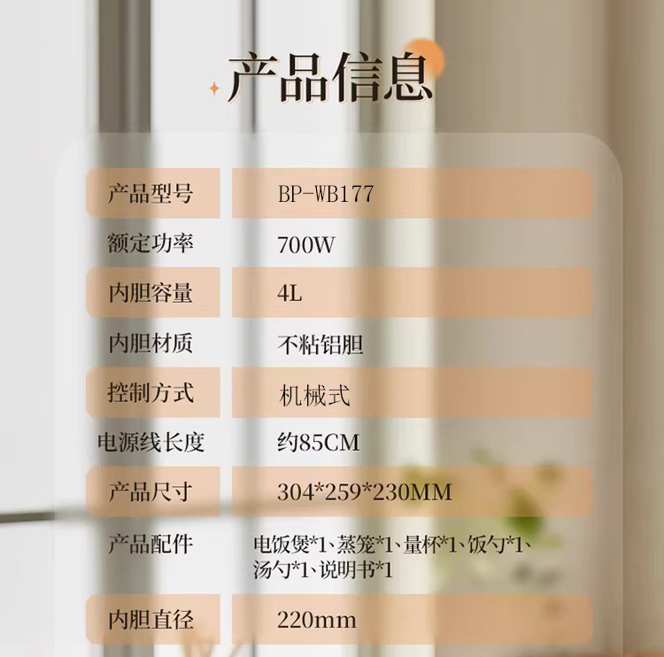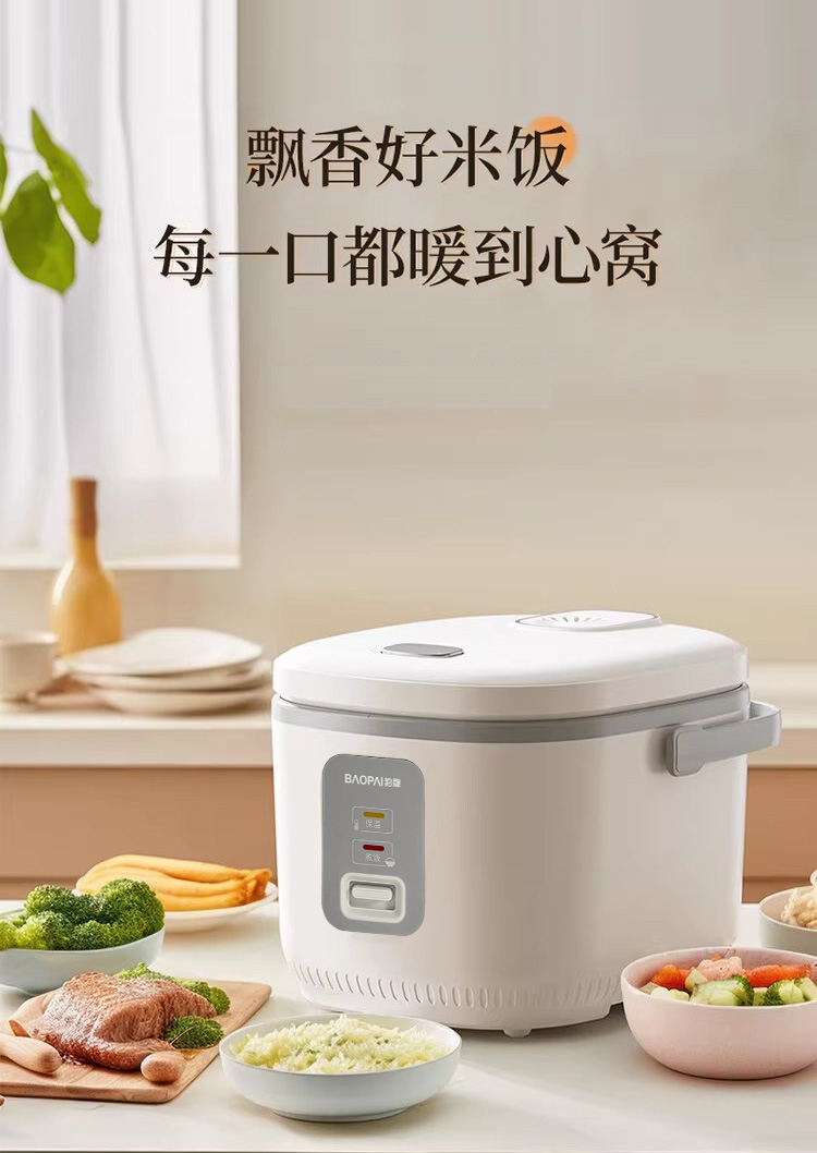 自带提手,方便省力 聚能不粘内胆,激发米饭醇香 4L大容量,适合多种需求 按压弹跳简单操作,使用方便 700W火力,受热均匀 产品材质:不锈钢+铝合金+PP 额定功率:700W 额定电压: 220V~ 额定频率: 50Hz 额定容量:4L 产品毛重:2.85Kg 产品尺寸:313*263*247mm 包装尺寸:328*279*255mm 外箱尺寸:858*345*538mm