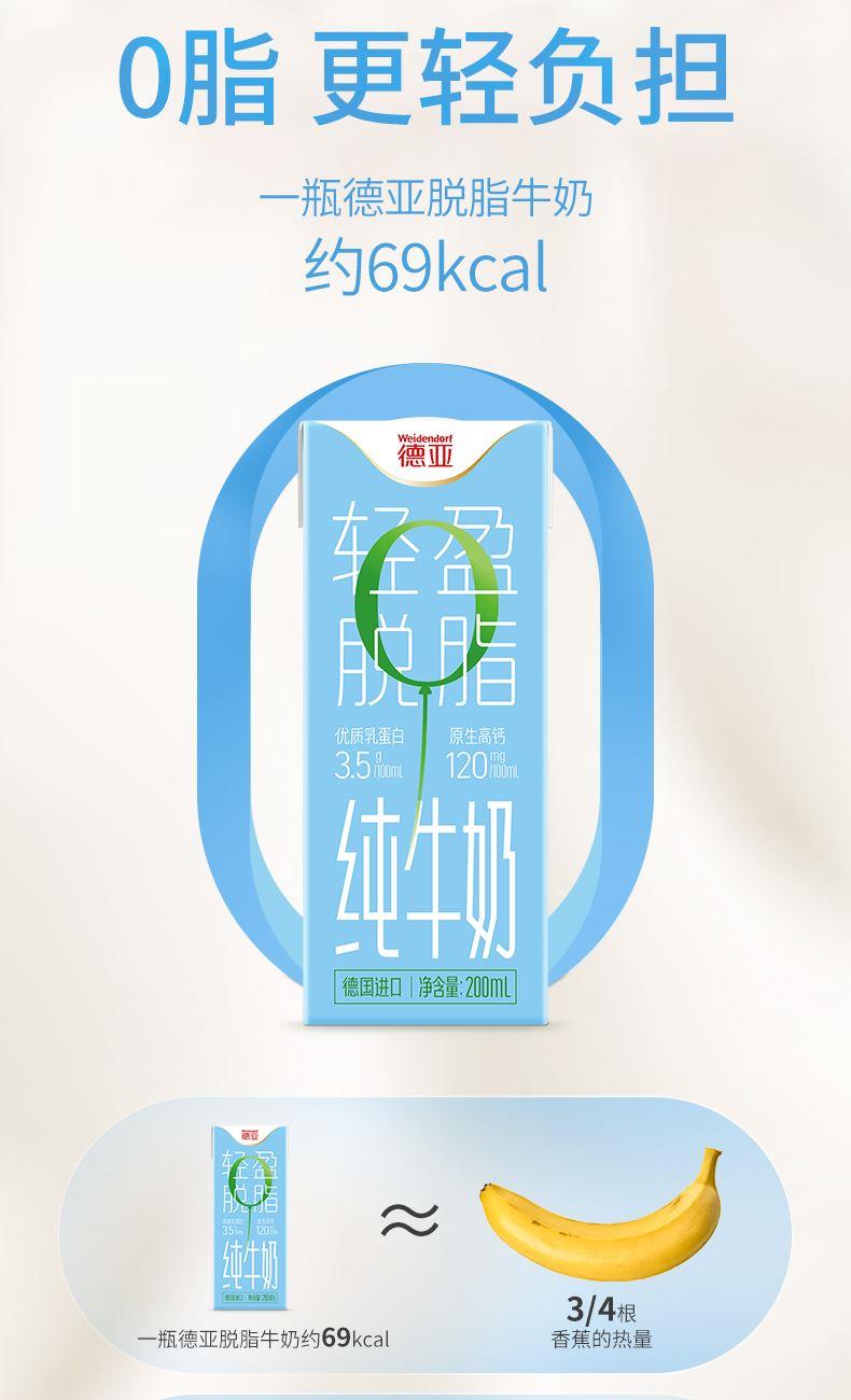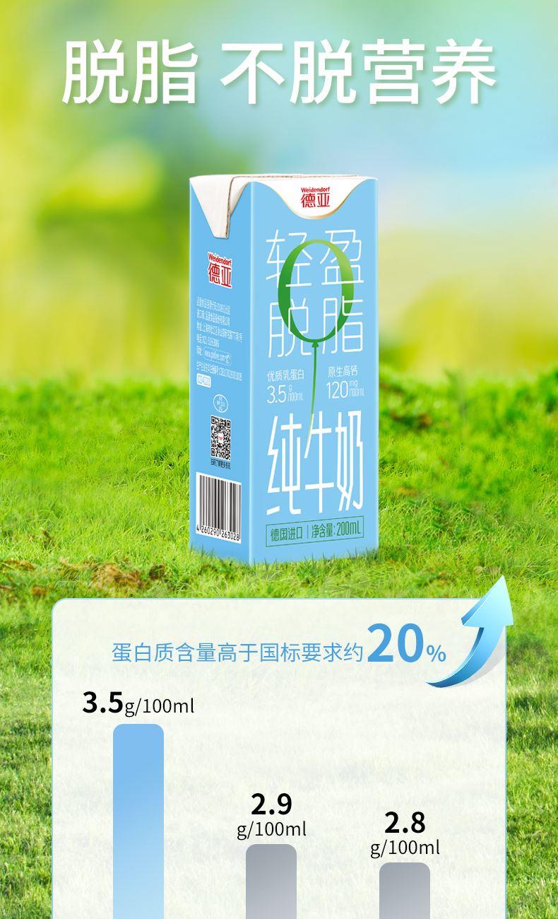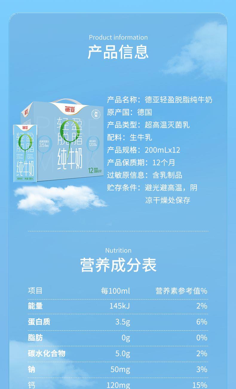 产品:德亚轻盈脱脂纯牛奶 原产国:德国 配料:生牛乳 产品规格:200mLx12 产品保质期:12个月