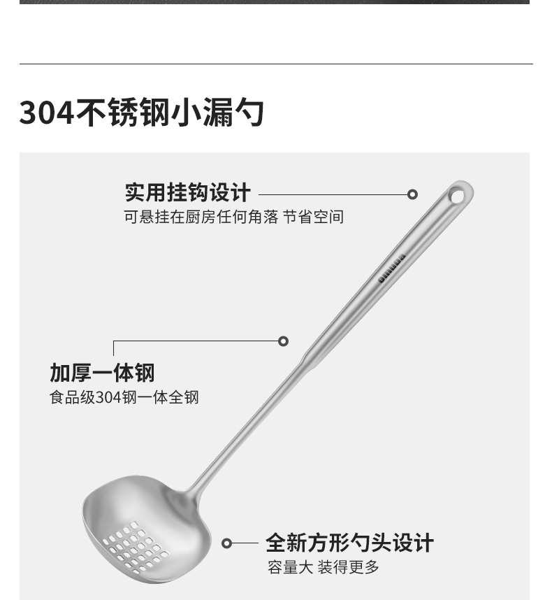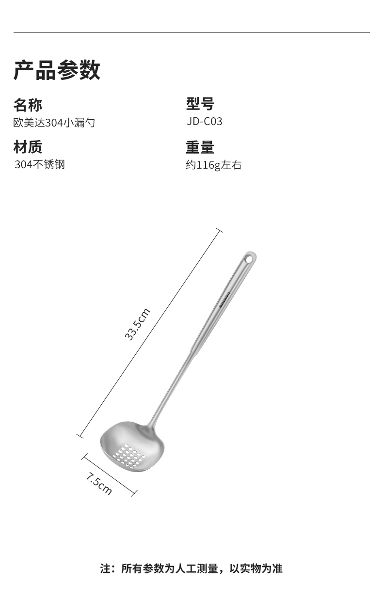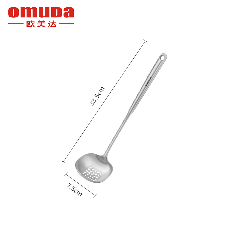 尺寸:33.5cm 净重:0.12kg 材质:304不锈钢 ①采用优质304不锈钢材质,坚固耐用,人体工程学手柄设计,防热隔烫,手感更舒适 ②选砂光工艺处理,不易产生刮痕,圆筒状手柄便于抓握,带给您便捷的烹饪体验 ③整体不锈钢材质,易清洁,无卫生死角,耐腐蚀、安全卫生