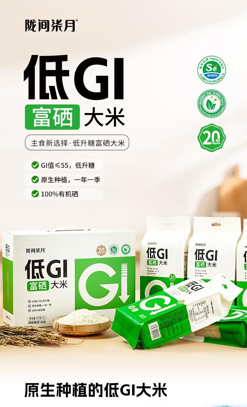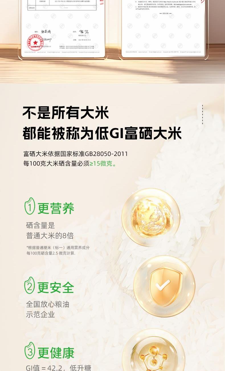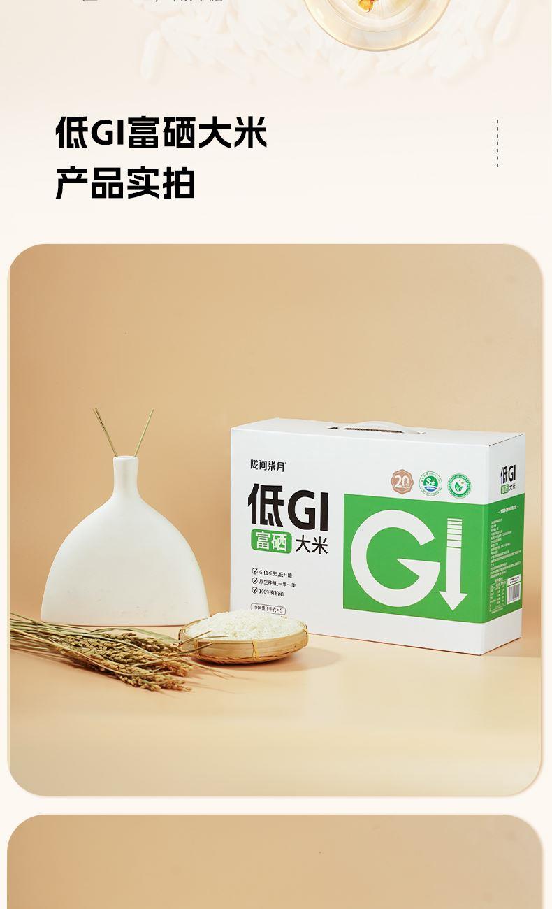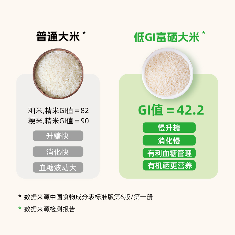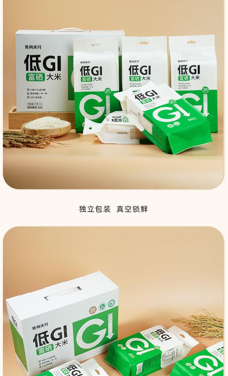 低GI富硒大米 产品配置:低GI富硒大米1kg*5袋 尺 寸:315×125×235mm 包 装:双层真空包装+彩箱 1、GI值≤55,低升糖,高饱腹,更抗饿; 2、原生种植、一年一季; 3、富有机硒认证,每100g平均硒含量≥20ug。