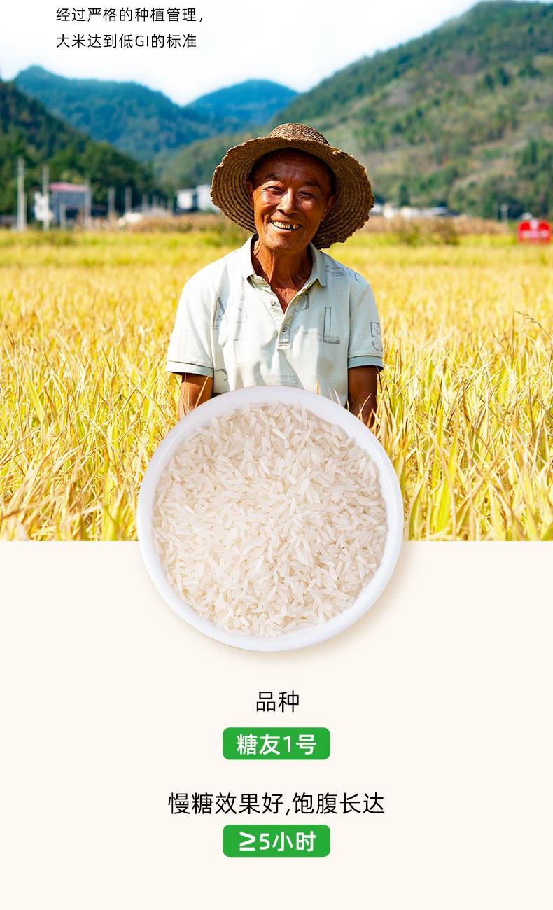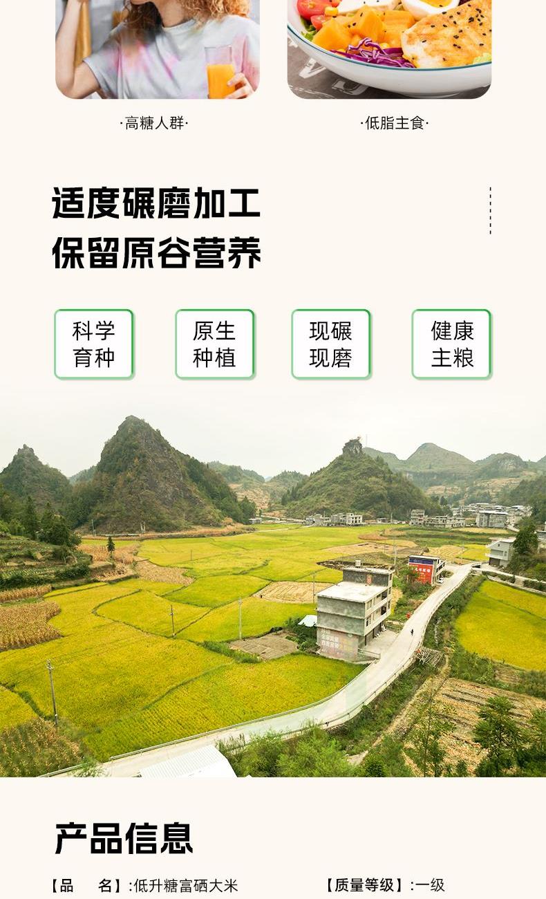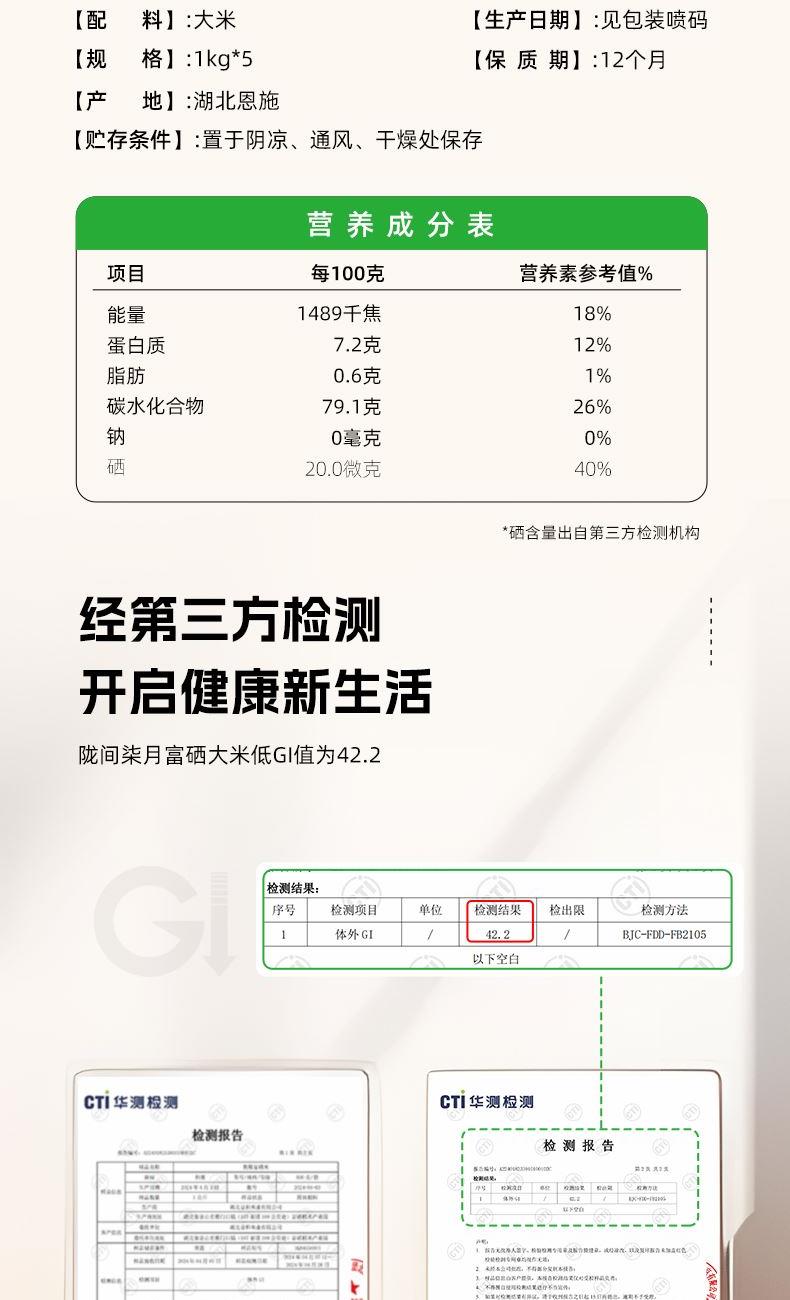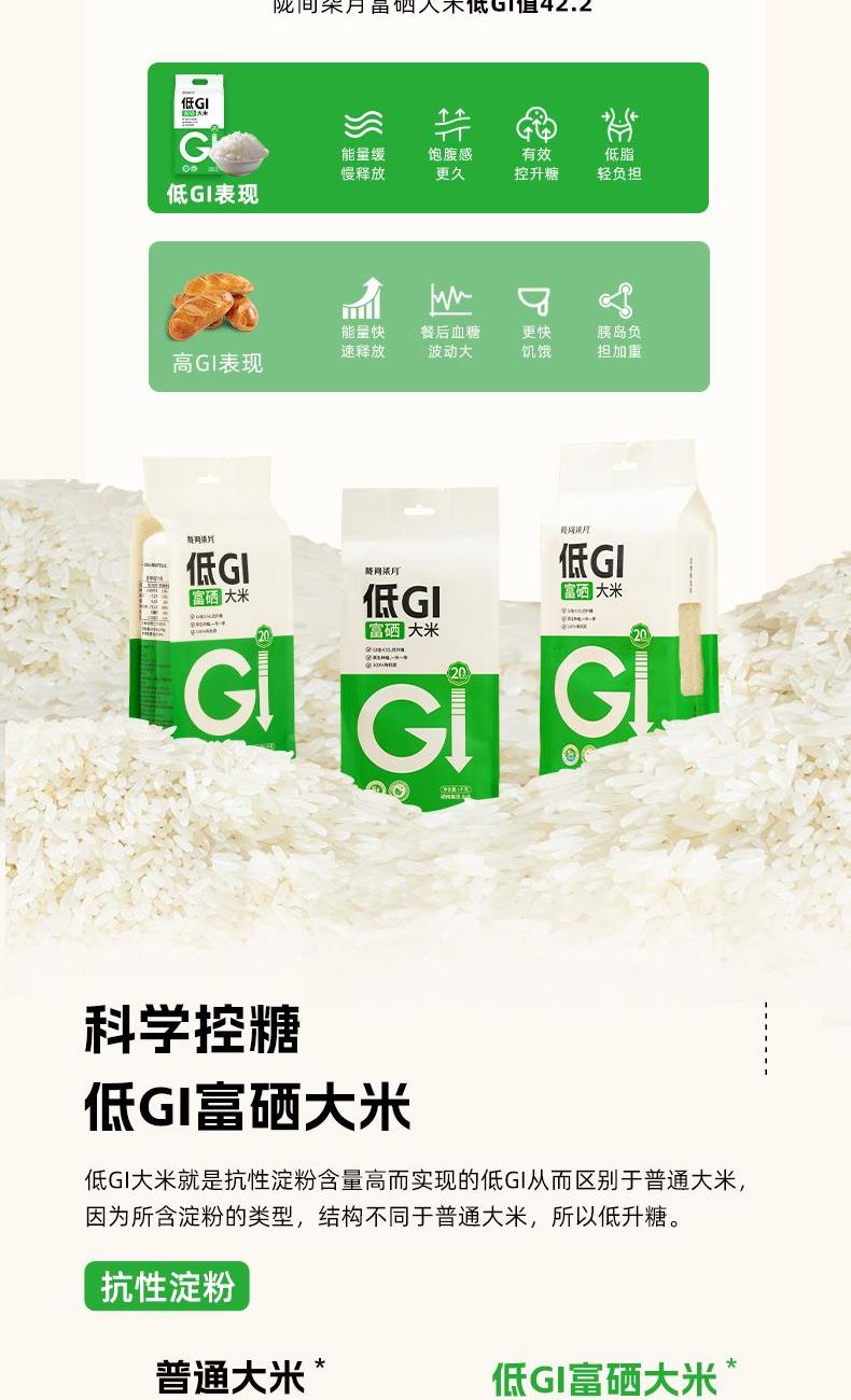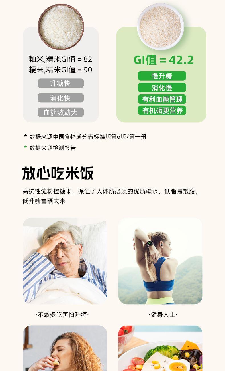 低GI富硒大米 产品配置:低GI富硒大米1kg*5袋 尺 寸:315×125×235mm 包 装:双层真空包装+彩箱 1、GI值≤55,低升糖,高饱腹,更抗饿; 2、原生种植、一年一季; 3、富有机硒认证,每100g平均硒含量≥20ug。