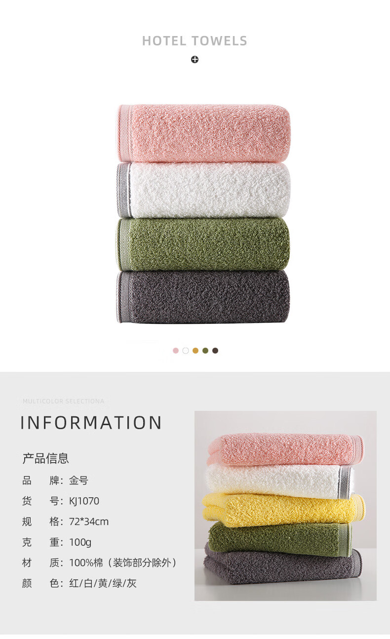 材质:纯棉 货号:KJ1070H颜色:灰 绿 规格: 72*34cm 重量:100g*2产品说明: 1.用心选好棉制成棉纤维,细长而柔软通过生产工艺让棉纤维在纺纱时充分接触空气,。 2.精梳大毛圈蓬松丰盈,加长毛环易吸水储水,轻轻擦拭即刻吸干面部水渍,肌肤悦亨清爽洁净。 3.无甲醛、无荧光剂、无致癌香胺,严选好材,纤长细软,蓬松柔韧。