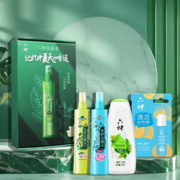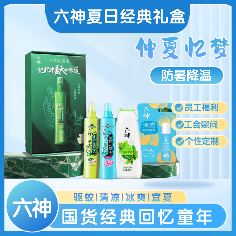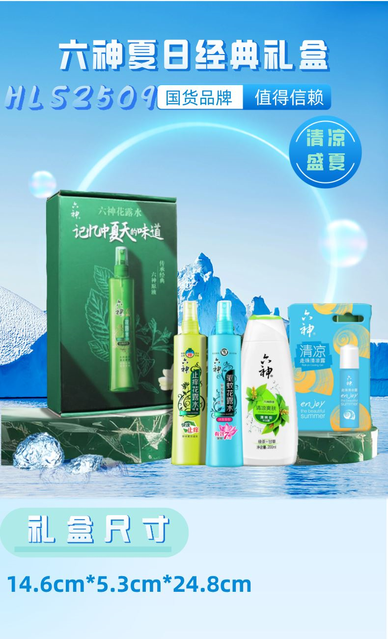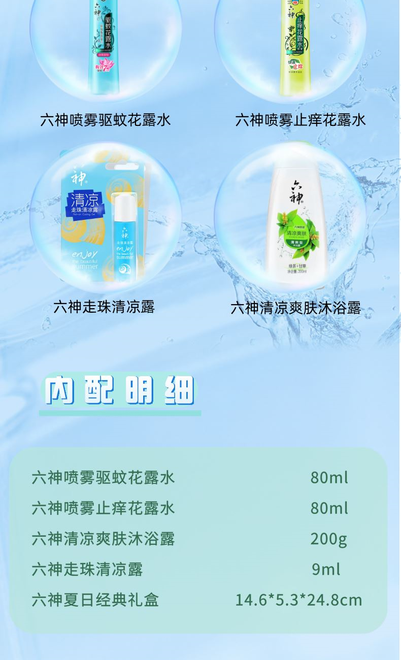 套装配置: 六神喷雾驱蚊花露水 80ml 六神喷雾止痒花露水 80ml 六神清凉爽肤沐浴露 200g 六神走珠清凉露 9ml 六神夏日经典礼盒 礼盒重量:572g 礼盒尺寸:14.6*5.3*24.8cm