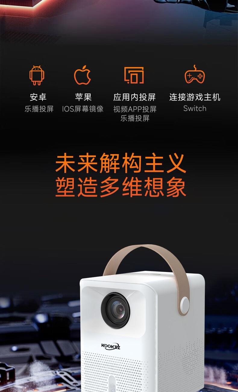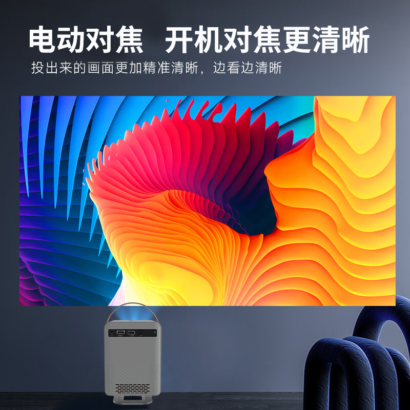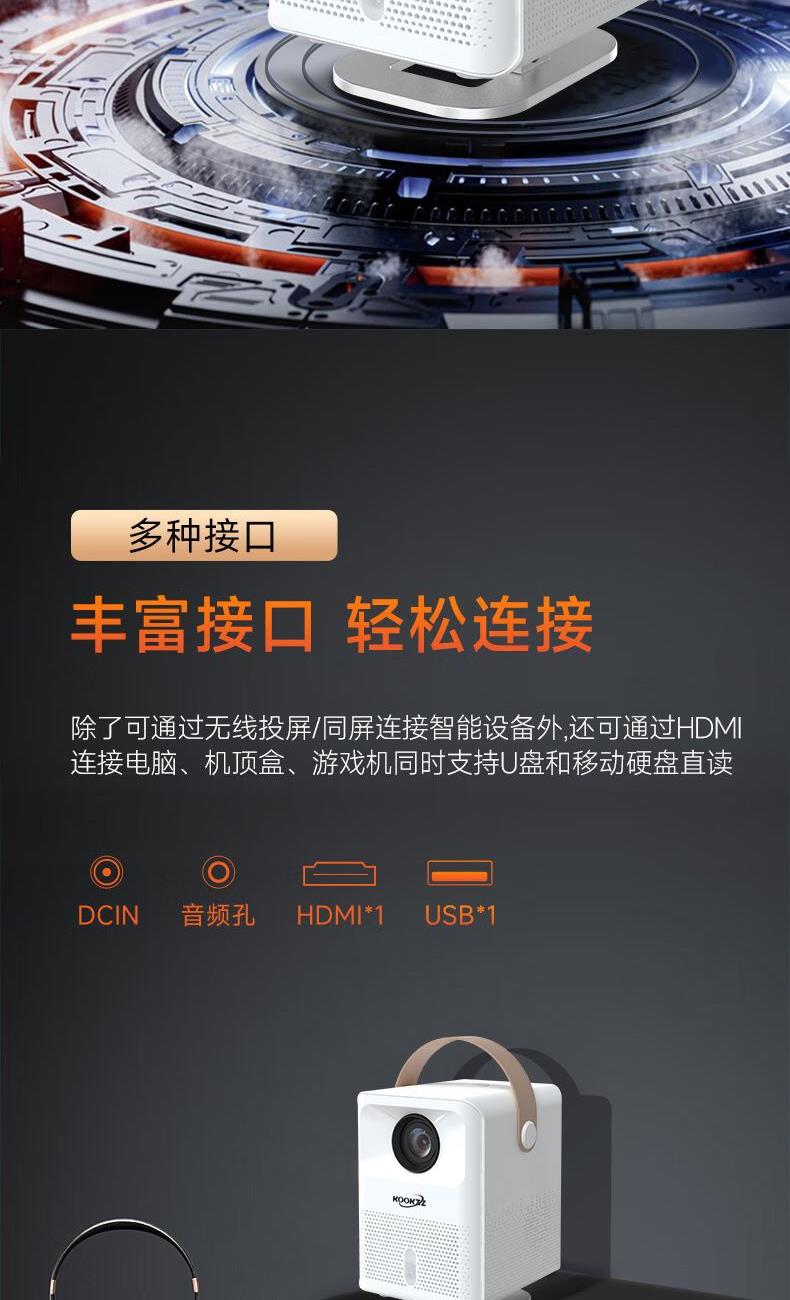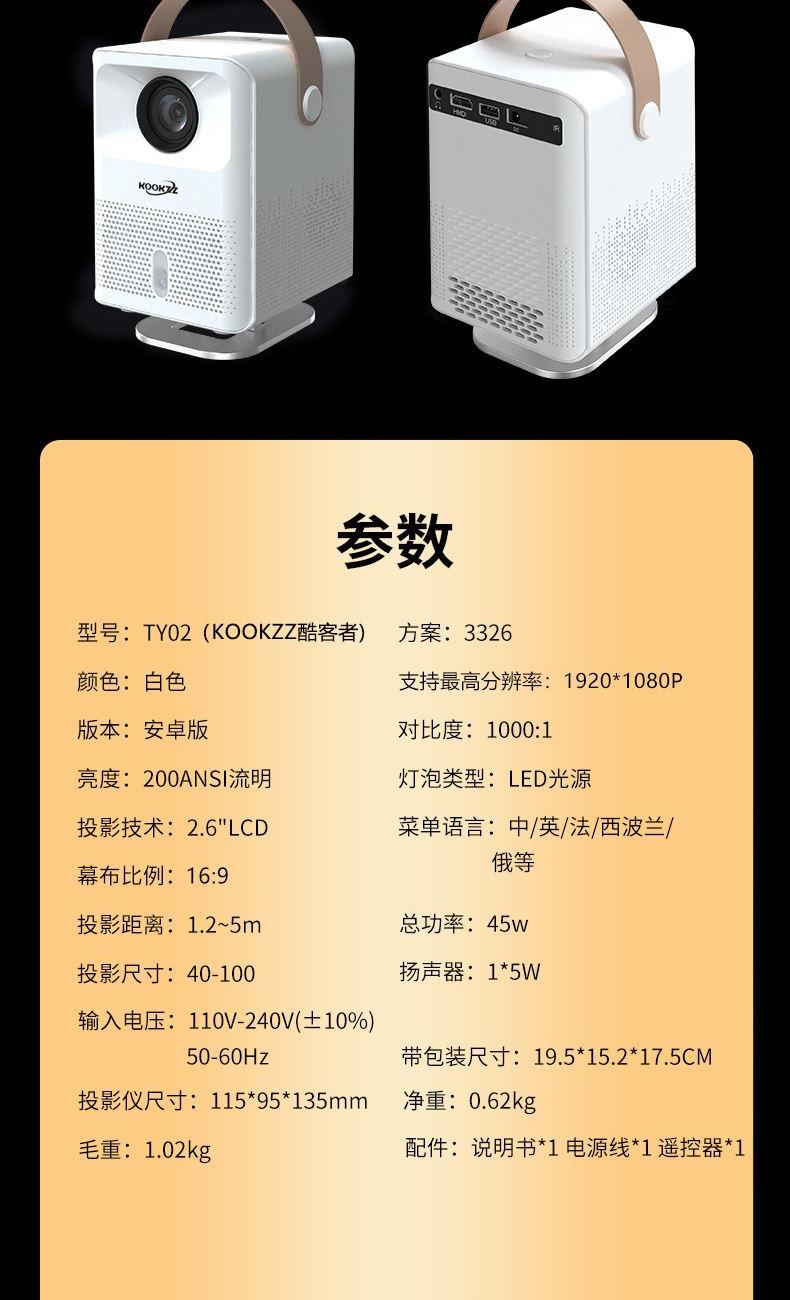 型 号 :TY02 颜 色 :白色 扬声器: 5W 系统版本:安卓语音版 蓝 牙:5.0 投影技术:2.6“LCD显示 投影比:16:9 支持高分辨率:1920*1080P 梯形矫正:支持 亮度: 200ANSI 流明 对比度:1000:1 投影尺寸:40-100英寸 对焦:电动对焦 输入电压:100V-240V(±10%) 毛重:1150g 产品尺寸:115*95*135mm 一箱 :12/件 Ai智能语音控制系统,老人孩子都可操作 支持苹果安卓手机同屏/投屏,内置安卓系统海量影片可在线观看,便携设计,携带无负担,支持1080高清播放,内置独立音箱,多种设备链接,手机/平板/U盘/移动硬盘/网络盒子等,漫反射原理,呵护眼睛健康