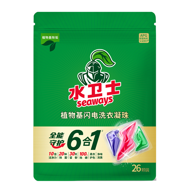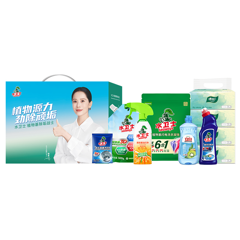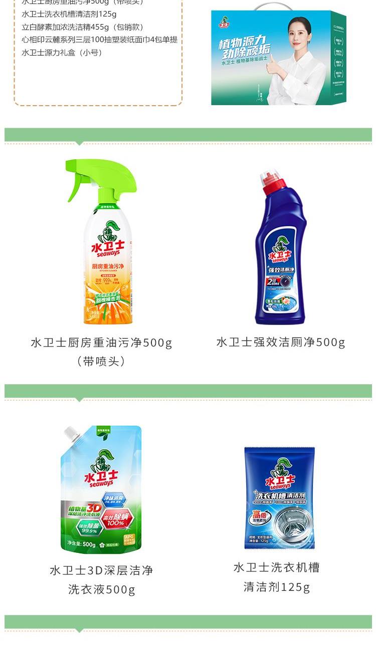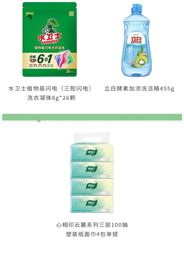 水卫士植物基闪电(三腔闪电)洗衣凝珠8g*26颗 水卫士3D深层洁净洗衣液500g 水卫士强效洁厕净500g 水卫士厨房重油污净500g(带喷头) 水卫士洗衣机槽清洁剂125g 立白酵素加浓洗洁精455g 心相印云麓系列三层100抽塑装纸面巾4包单提 思珀莱源力礼盒(净含量2788g 小号)