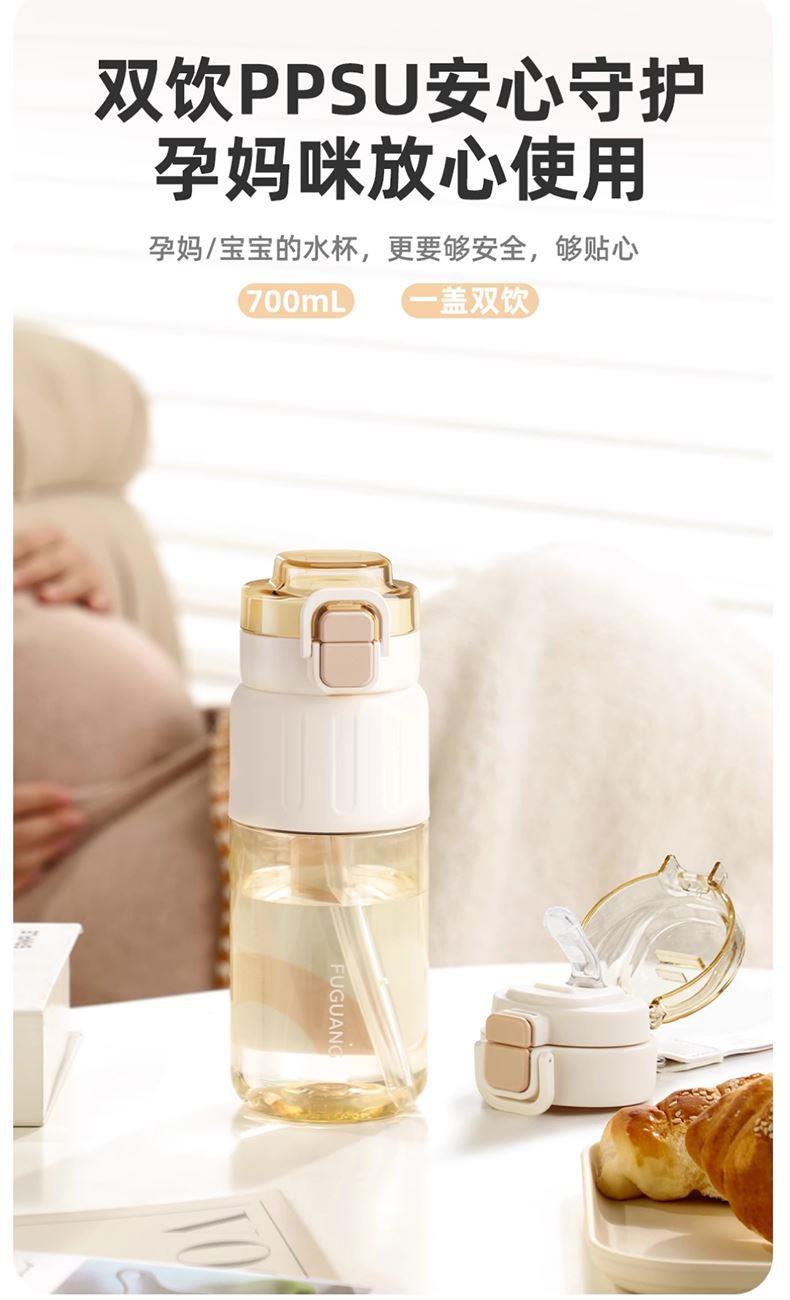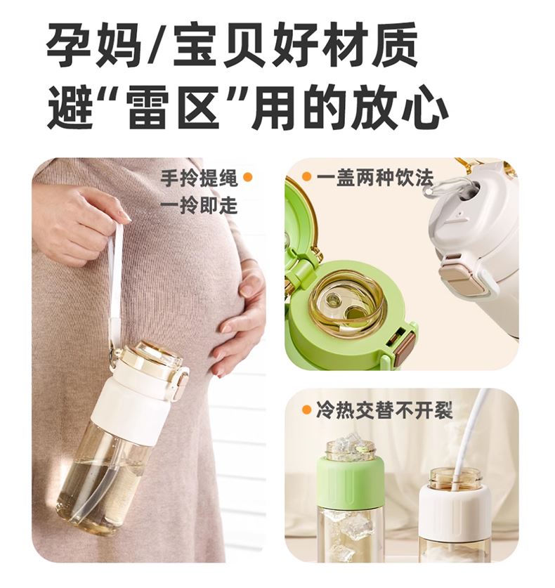 · 双饮PPSU材质安心守护,孕妈/宝宝放心使用。 · 无需换杯盖;吸管&直饮一盖双饮,自由切换。 · 软硅胶吸嘴口,低头即饮,好吸防呛耐啃咬。 · 一秒单手开盖,防误触安全锁扣。 · 柔软舒适提手&背带。