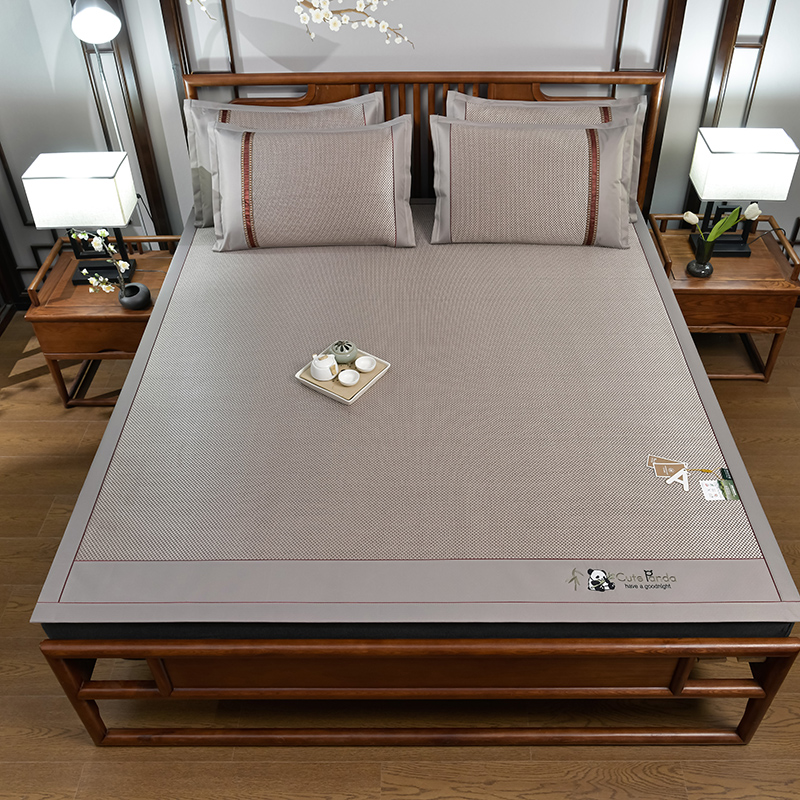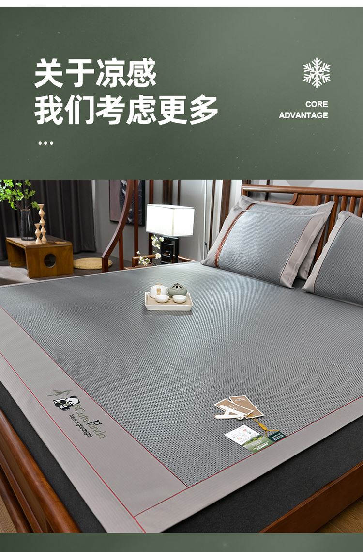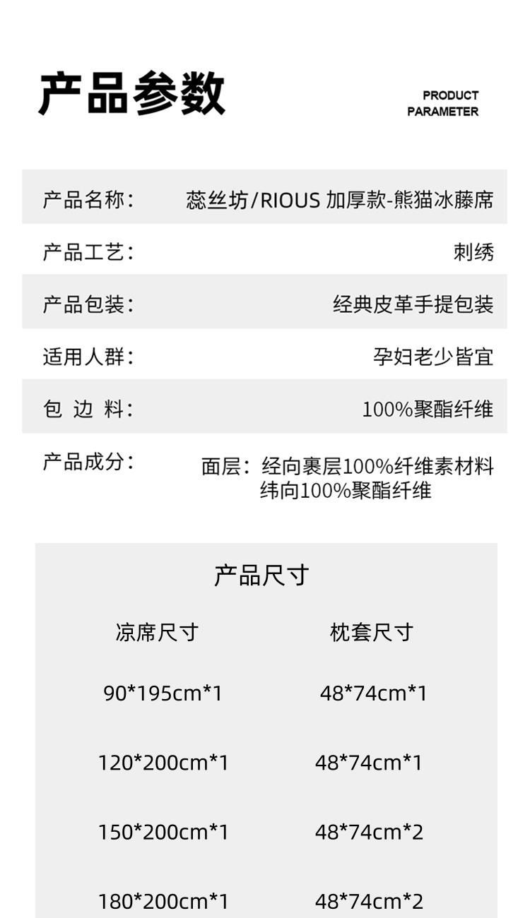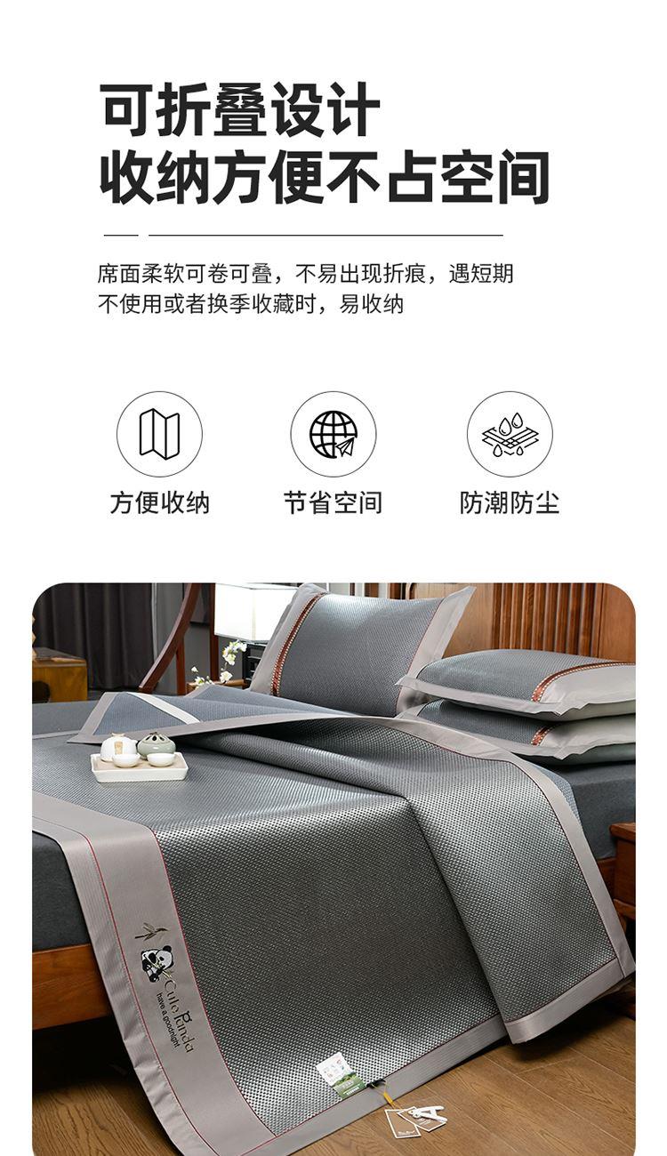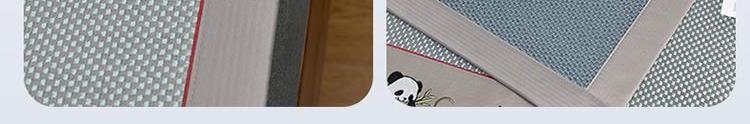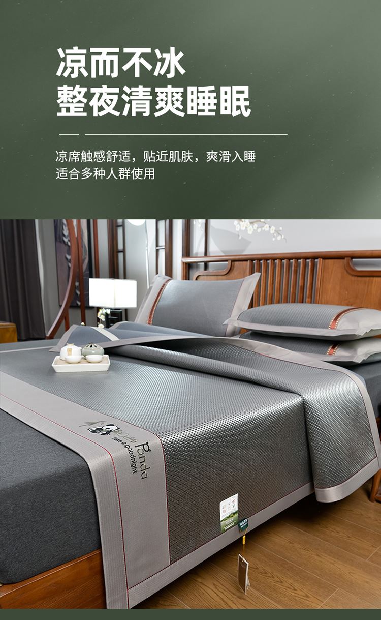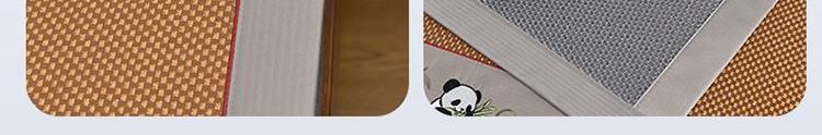 规 格:席150*200cm*1 枕套48*74cm*2 花 型:黑咖/咖色/蓝色/绿色/香槟/银灰 材 质:经向裹层纤维素材料 纬向聚酯纤维;包边料聚酯纤维 加厚高密度编织工艺,席面光滑无毛刺,擦拭不脱色, 睡醒身上没有压痕 出门不尴尬,老少皆宜;席子背面采用华夫格透气网,透气性更好,清凉不黏腻;精致经典熊猫卡通刺绣,点缀品质家居;席面柔软可卷可折叠设计,收纳方便不占空间。搭配信封枕套,光滑不夹头发, 加宽包边设计,针脚细密,耐磨而用,四角绑带设计,固定不滑动。