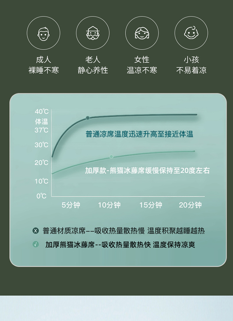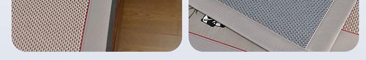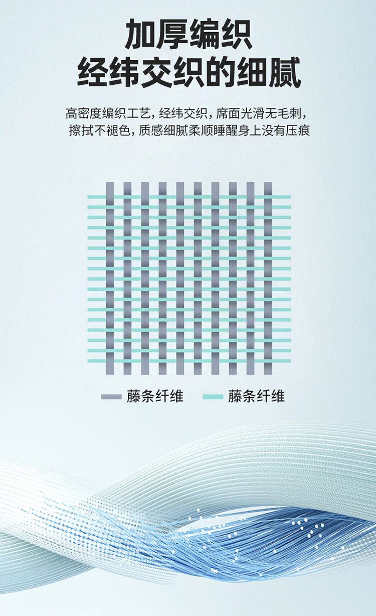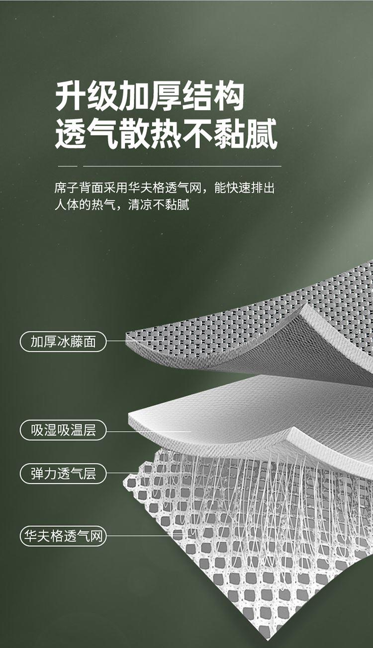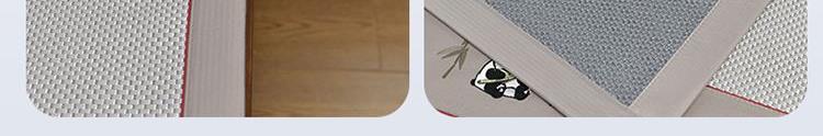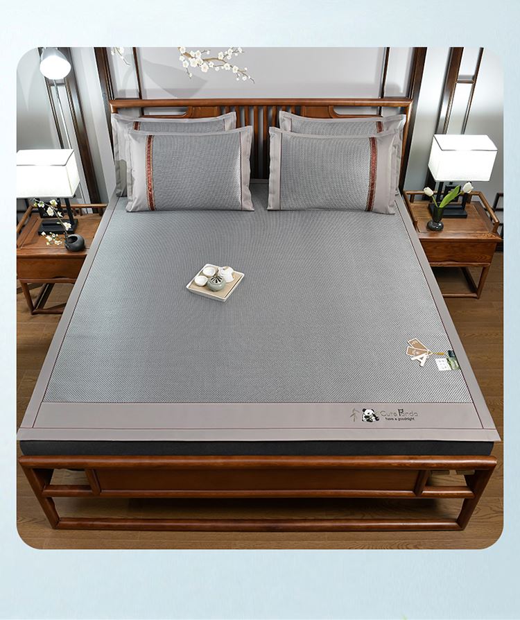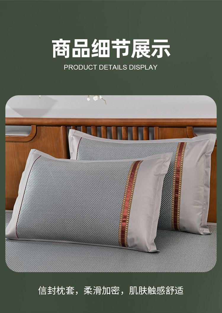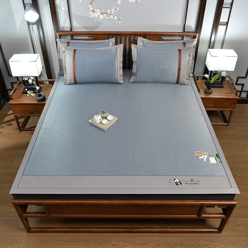 规 格:席150*200cm*1 枕套48*74cm*2 花 型:黑咖/咖色/蓝色/绿色/香槟/银灰 材 质:经向裹层纤维素材料 纬向聚酯纤维;包边料聚酯纤维 加厚高密度编织工艺,席面光滑无毛刺,擦拭不脱色, 睡醒身上没有压痕 出门不尴尬,老少皆宜;席子背面采用华夫格透气网,透气性更好,清凉不黏腻;精致经典熊猫卡通刺绣,点缀品质家居;席面柔软可卷可折叠设计,收纳方便不占空间。搭配信封枕套,光滑不夹头发, 加宽包边设计,针脚细密,耐磨而用,四角绑带设计,固定不滑动。