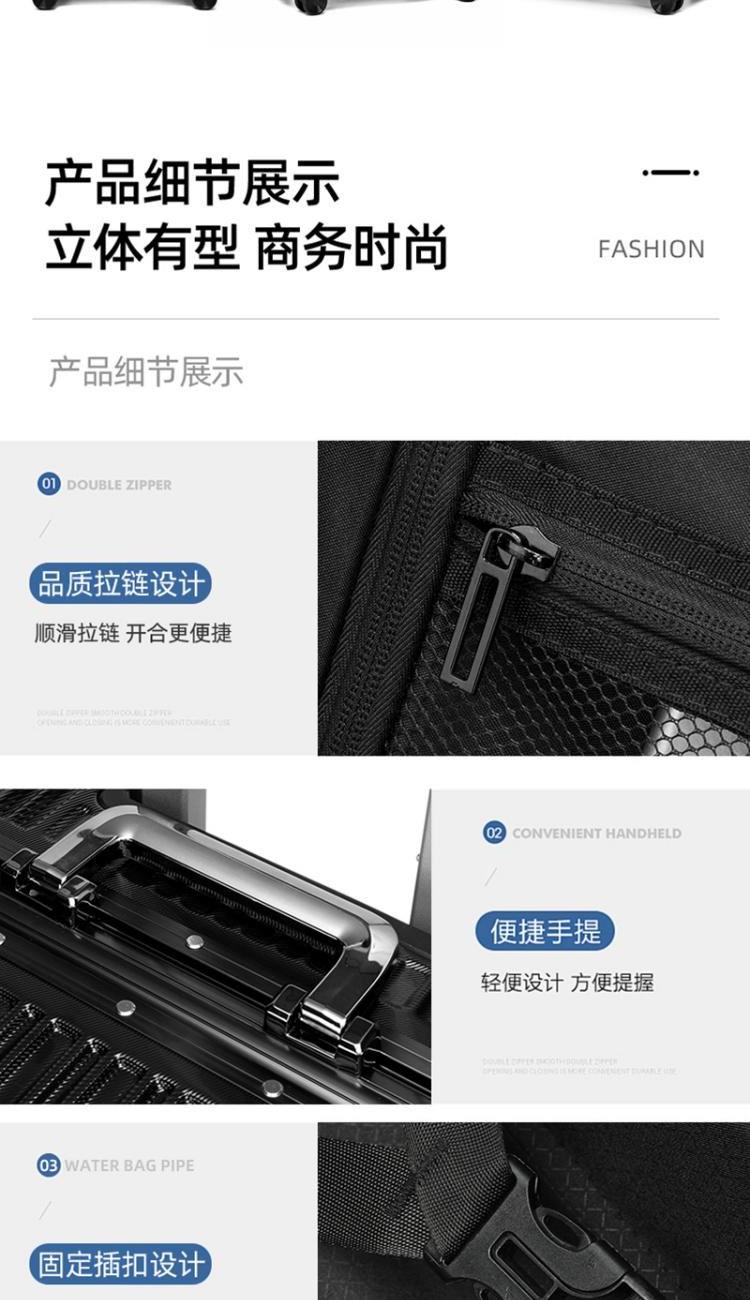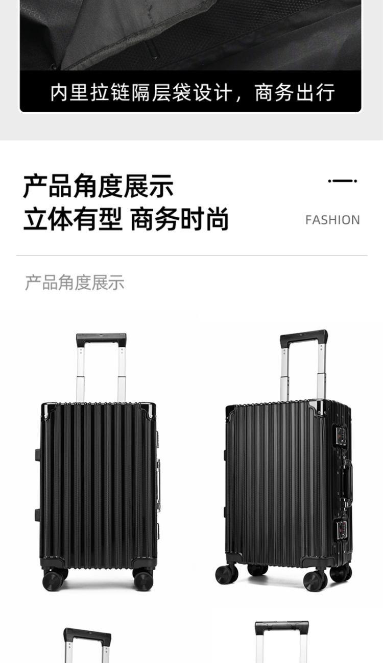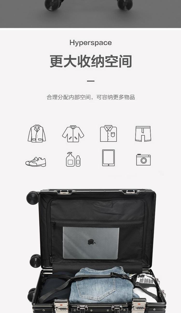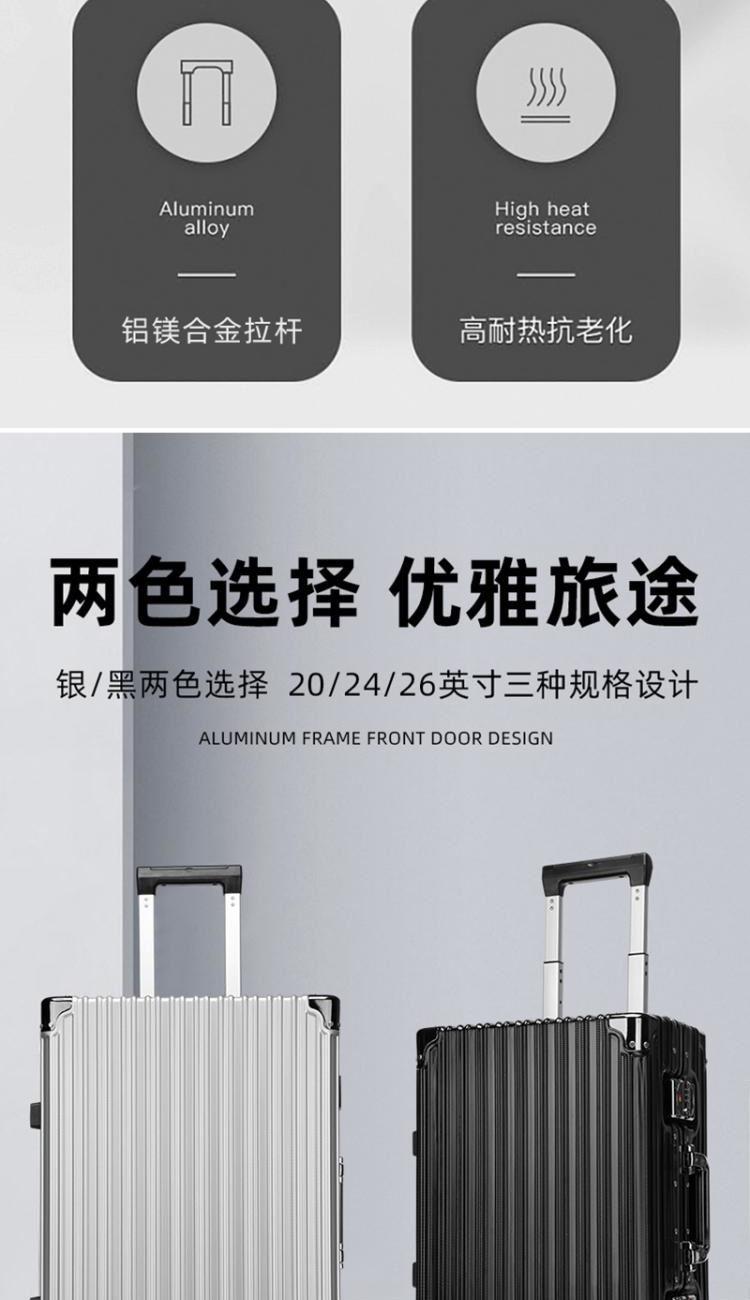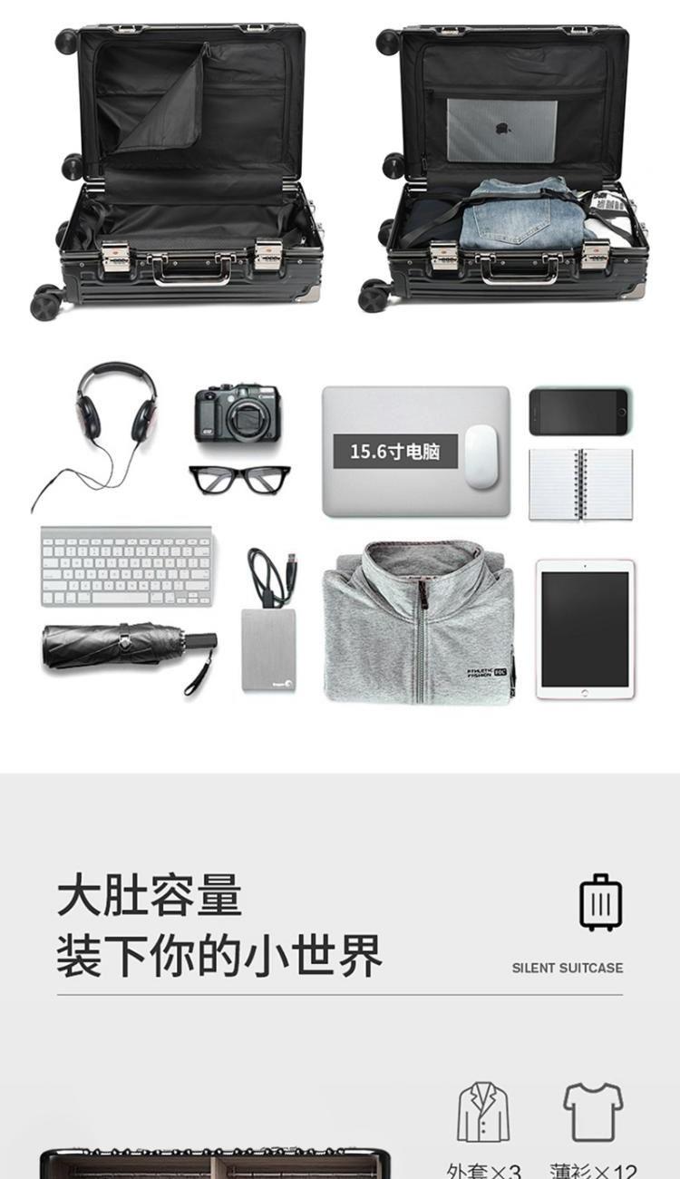 材质:PC 颜色:黑色/银色 规格:26寸 重量:5.2kg 包装方式:无纺布袋+纸箱 德国拜耳PC材质,质地轻盈,高耐热、抗冲击、阻燃、刚硬、柔韧(可踩、摔不变形),犹如护盾般保护着箱内物品;铝合金拉杆,航空铝材,美观耐用;海关密码锁,标准海关开箱检查锁具;全配色耐磨万向静音轮,运用跑车车轮的设计原理,采用静音材质包裹,360度自由旋转,降噪减震灵动自如,耐磨高弹性TPE材料,触感柔软,负重与减震能力俱佳; 采用苹果CNC边框工艺,贴合箱体的U型金属弧形框架,安全稳固经久耐用。