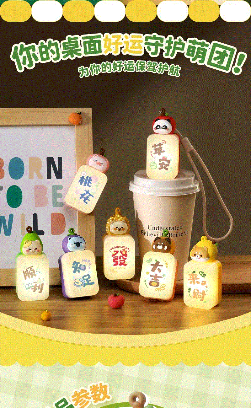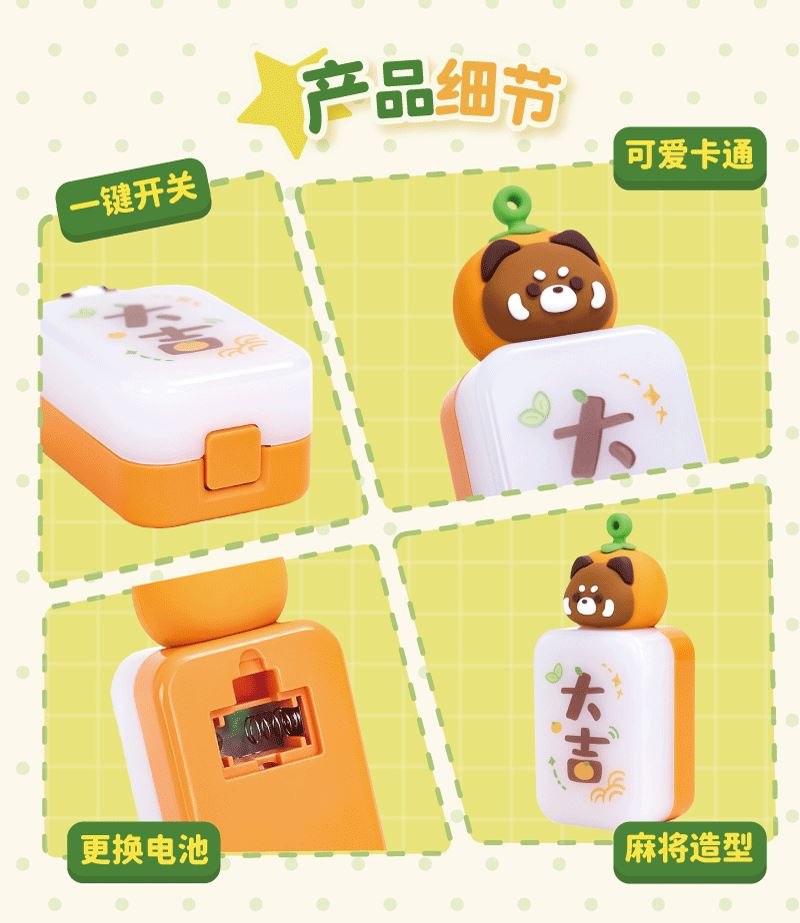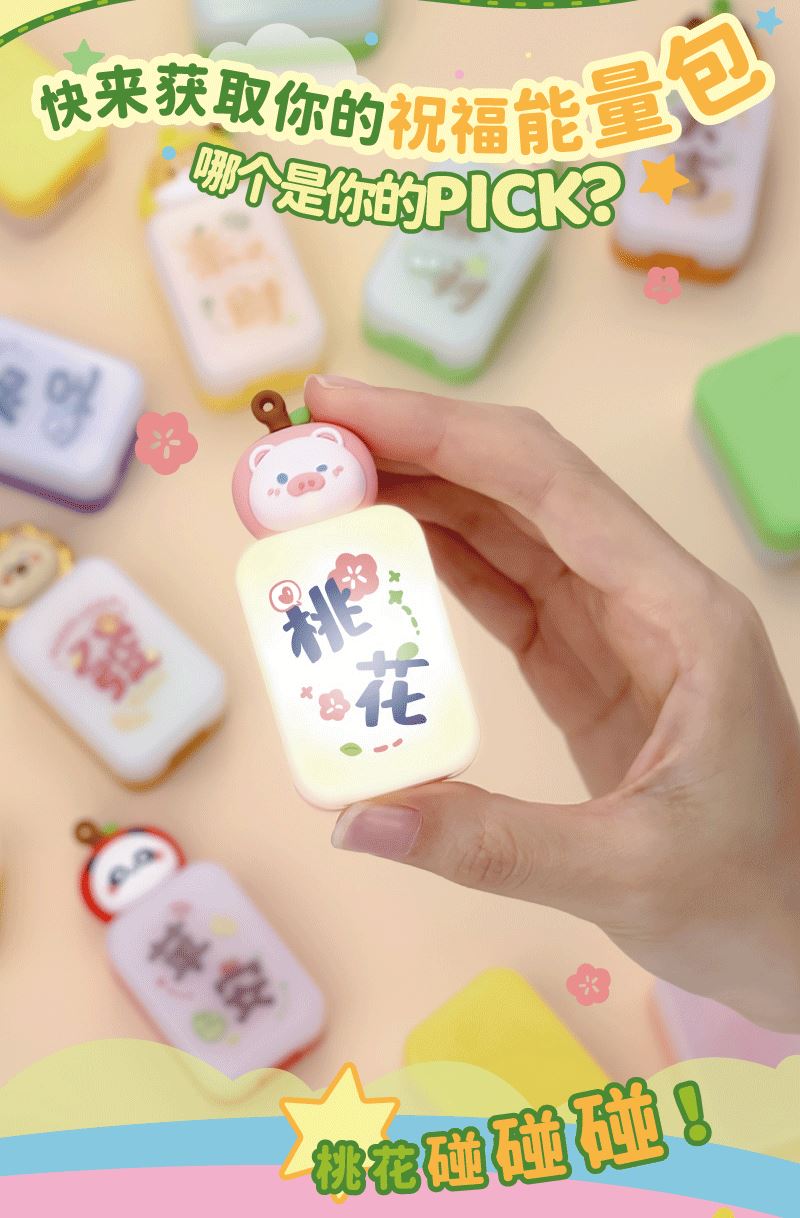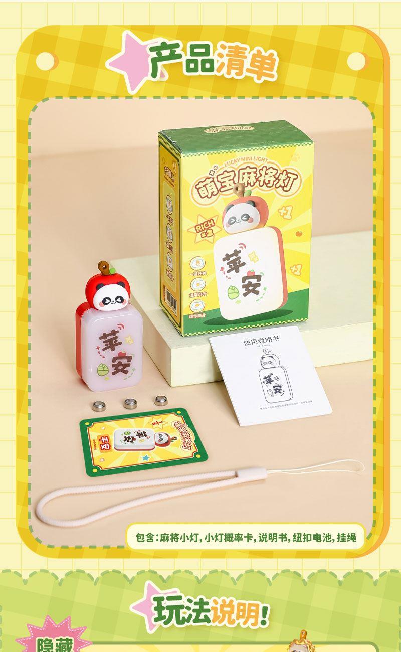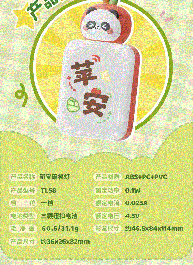 产品材质:ABS+PC+PVC 产品型号:TL58 出货方式:盲盒 款式:苹安,桃花、顺利、知足、大吉、来财、发(隐藏款) 额定功率:0.1W 档位:一档 额定电流:0.023A 电池类型:三颗纽扣电池 额定电压:4.5V 产品重量:约35g 产品尺寸:约36x26x82mm 彩盒尺寸:约46.5x84x114mm 毛净重:60.5/31.1g 整箱毛净重18.2/16.5KGS 备注:本产品半箱起发