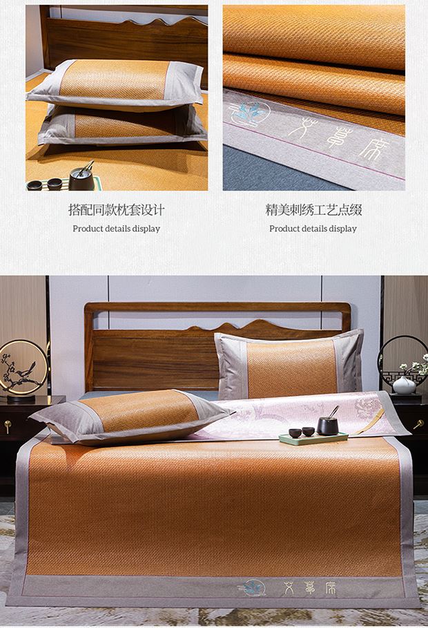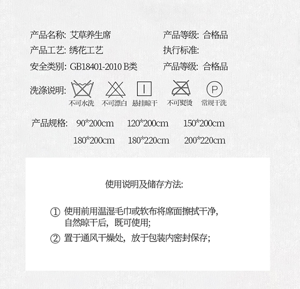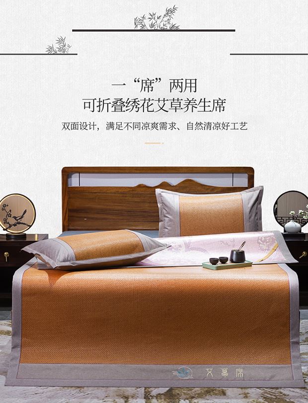 1:一“席"两用可折叠绣花艾草养生席双面设计, 2:正反可用带来不一样的肌肤体验 双面材质倍感舒适, 3:“艾草席”匠心字样设计,美观大方,彰显您的优雅品味 尺寸:180*200cm*1 枕套:48*74cm*2 包装:彩盒