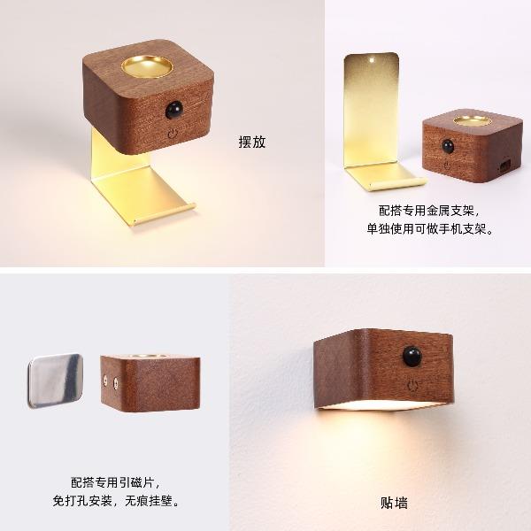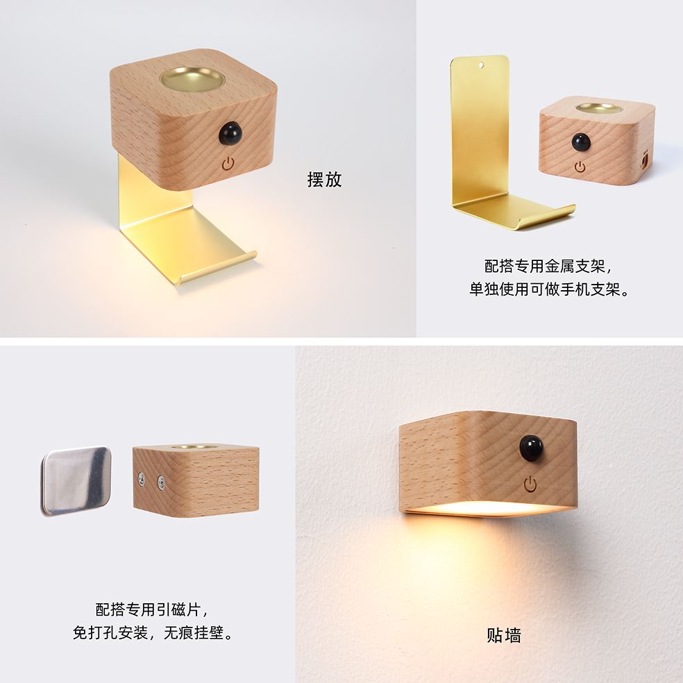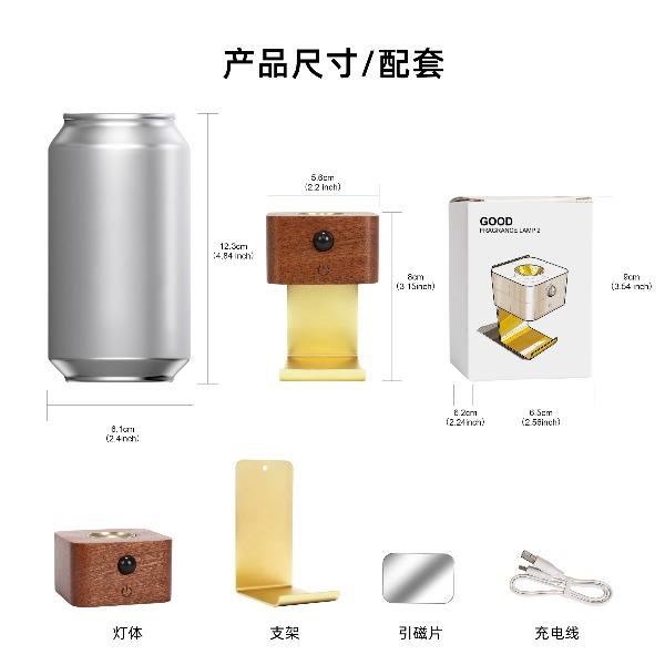 香薰灯2 产品型号:NO-HB059原木色,NO-HB060胡桃木色 灯光光源:LED灯 灯光色温:2700K~3000K 暖白光 额定功率:1.8W 亮灯延迟:15秒 感应距离:3米 加热时间:30分钟 电池容量:750mAh 充电时间:约4小时 产品材质:实木、塑料、金属、电子元件 产品标配:灯体×1、金属支架×1、引磁片×1、充电线×1 产品尺寸:56×57×81mm 包装尺寸:65×62×90mm 产品净重:约110克