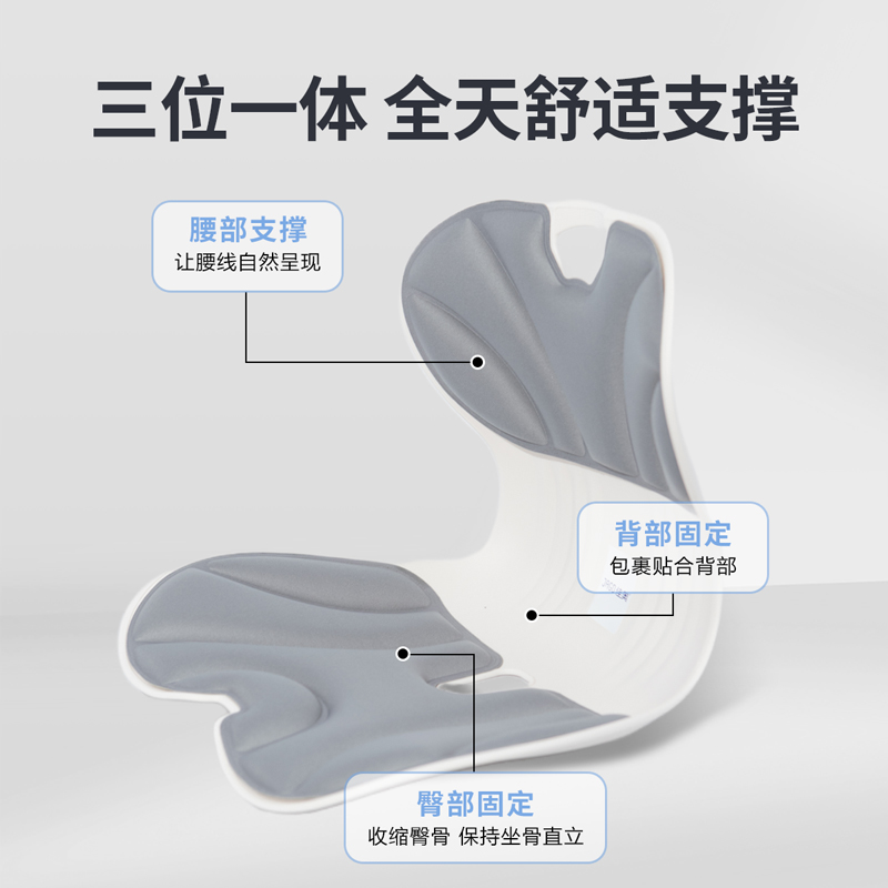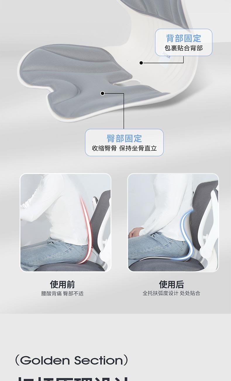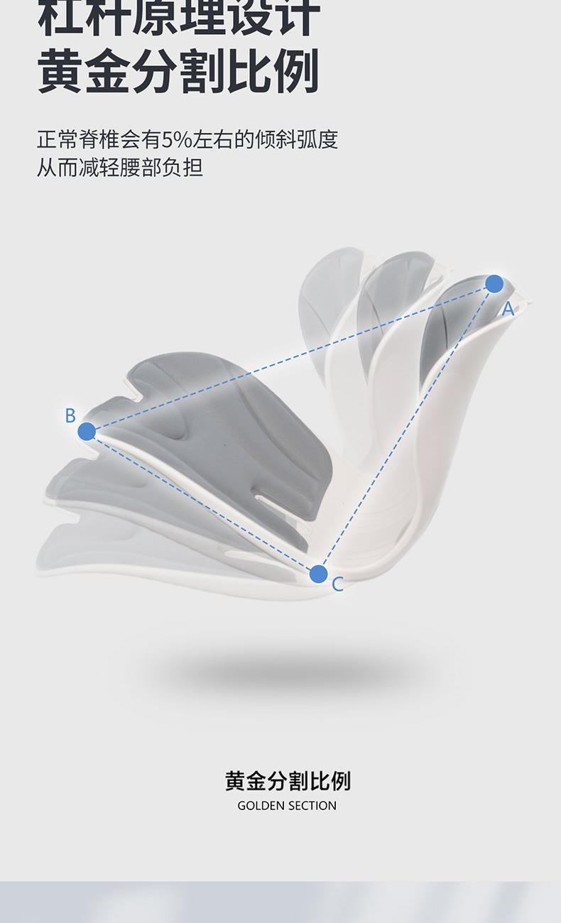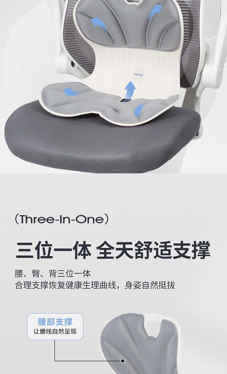 颜色:灰色 产品特点:①三位一体,全天舒适支撑 ②护脊舒腰,办公久坐不累 ③杠杆原理,黄金分割比例