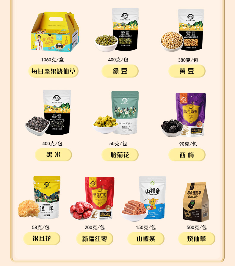 尺寸:280*280*300mm 天生好果每日坚果烧仙草1060克 天生好果胎菊花50克 天生好果绿豆400克 天生好果黄豆380克 天生好果黑米400克 天生好果西梅90克 天生好果银耳花58克 天生好果新疆红枣200克 天生好果山楂条150克 天生好果即食烧仙草500克