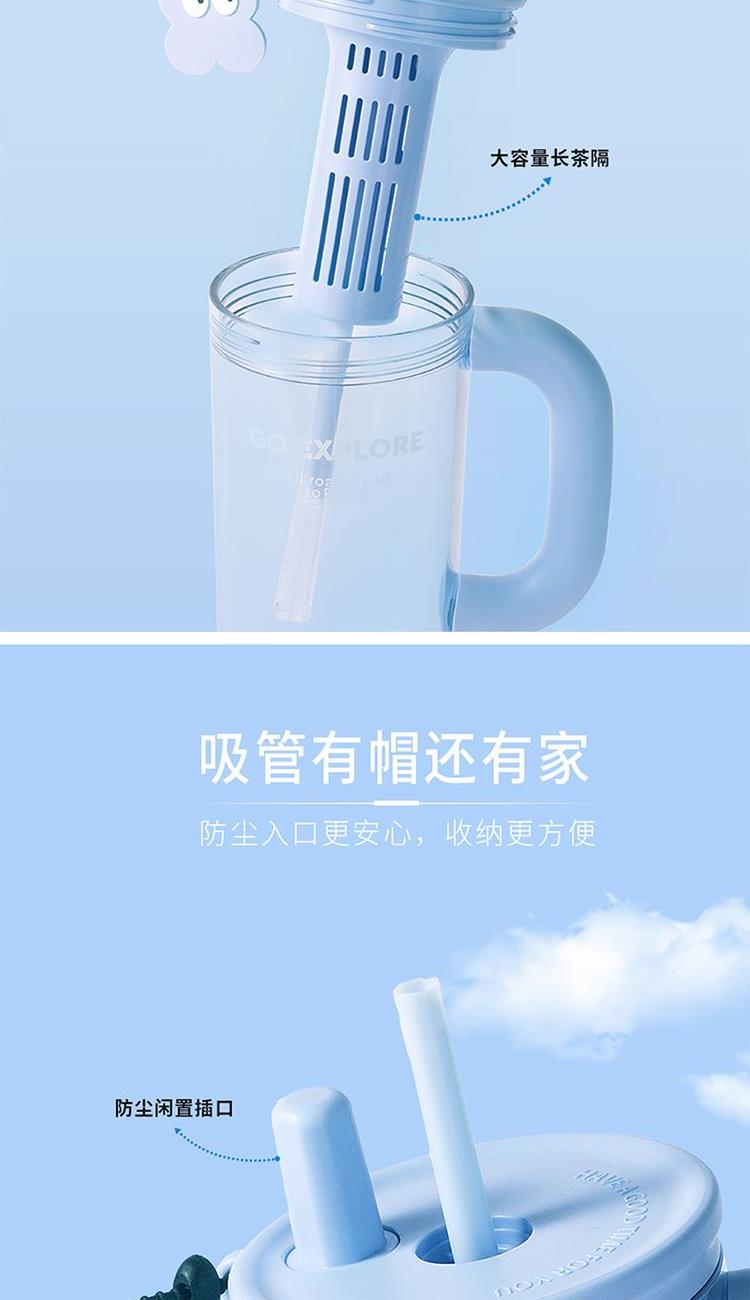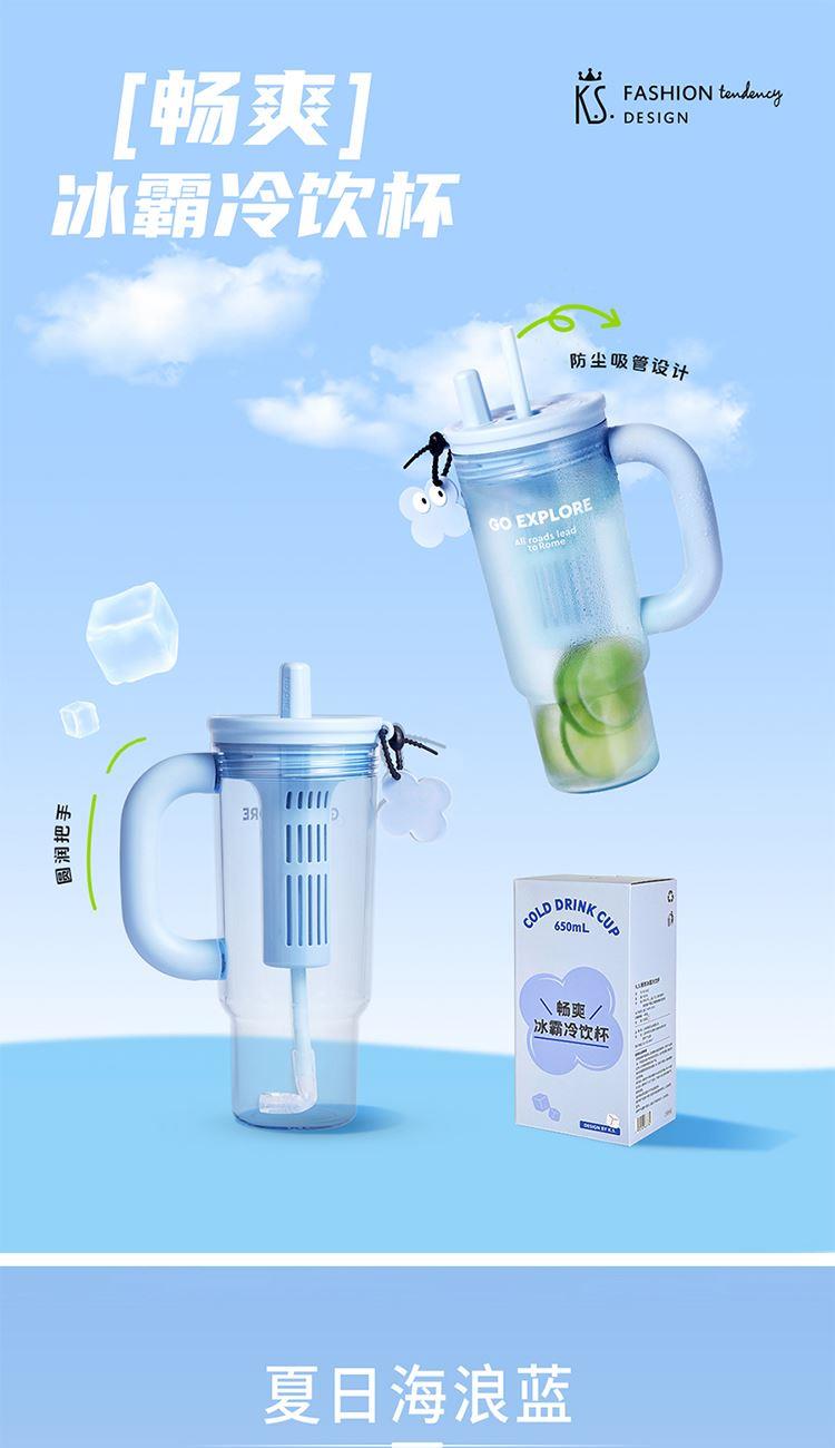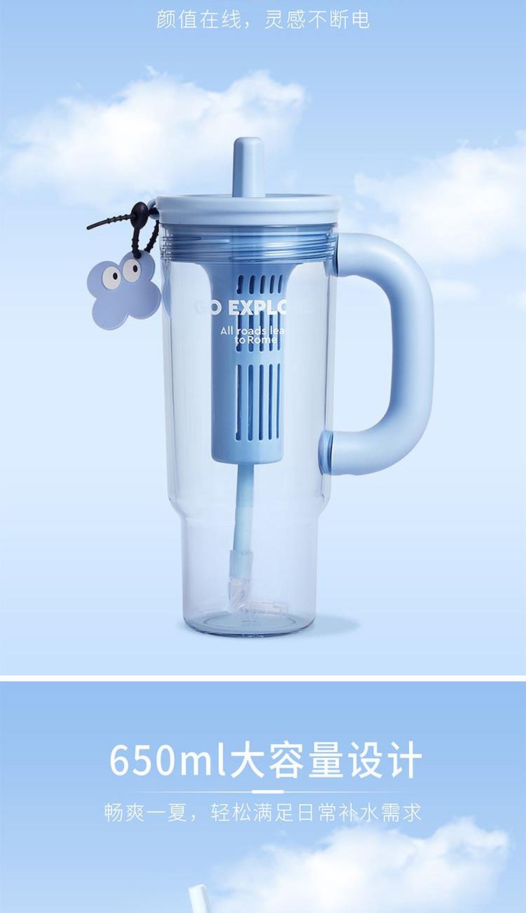 材质:杯体: PC 上盖、饮口:聚丙烯PP硅胶圈/甲基乙烯基硅橡胶混炼胶 规格:650ML 包装:彩盒 1.650ml大容量: 畅饮更尽兴,夏日补水/冷饮一杯搞定。 2.人体工学把手设计: 握持稳固舒适,单手操作更轻松。 3.专属吸管收纳帽: 饮用畅快,收纳卫生便捷。 4.可拆卸茶仓: 轻松泡制果茶/花茶,清爽方便。