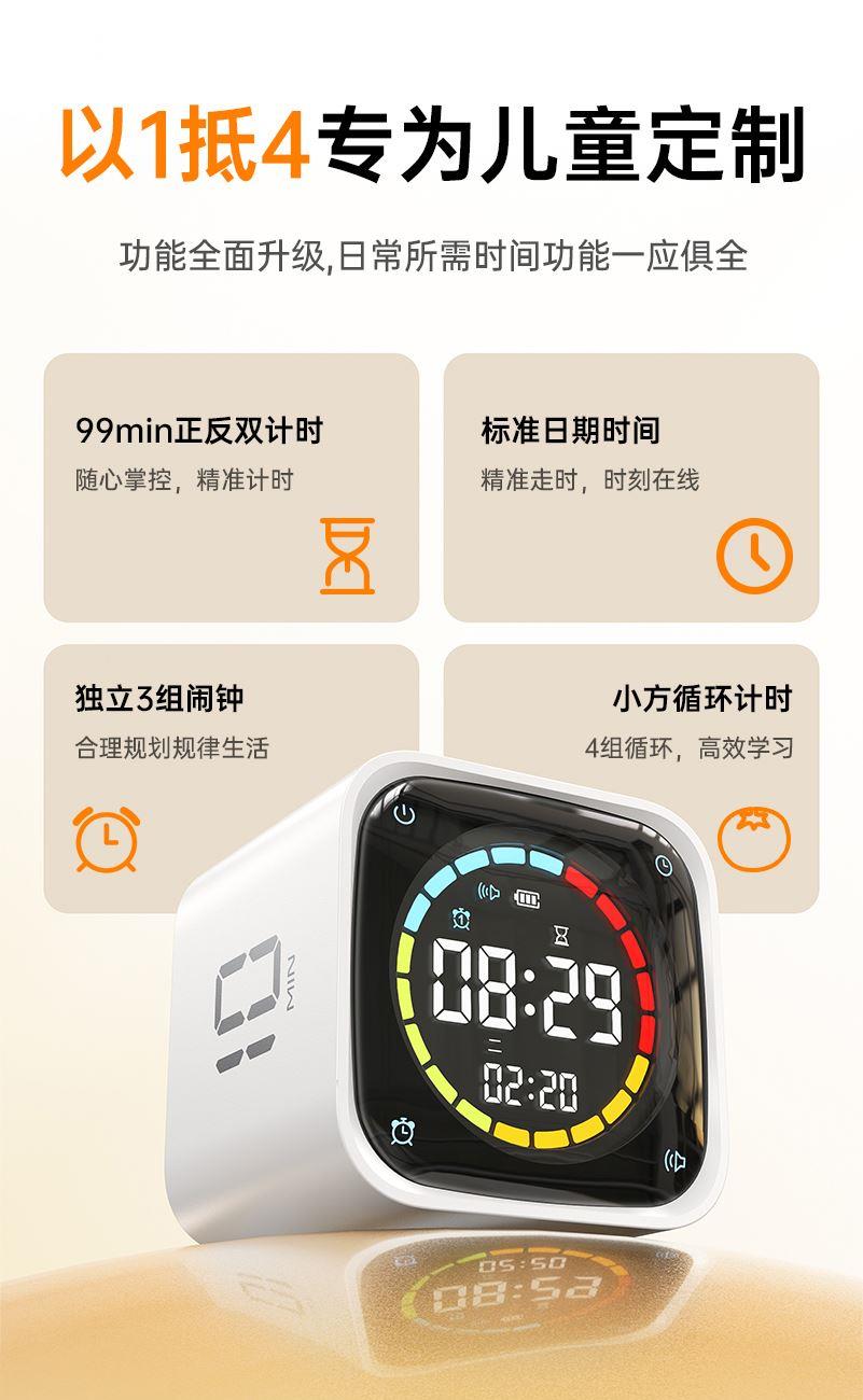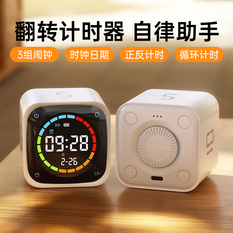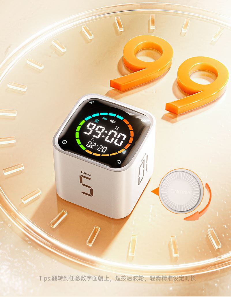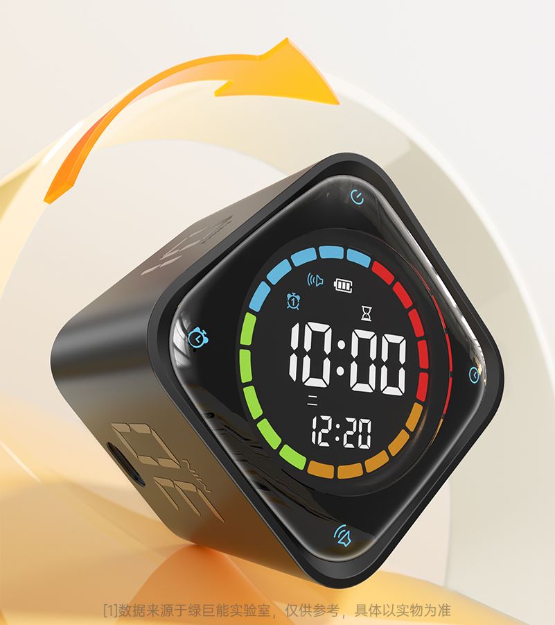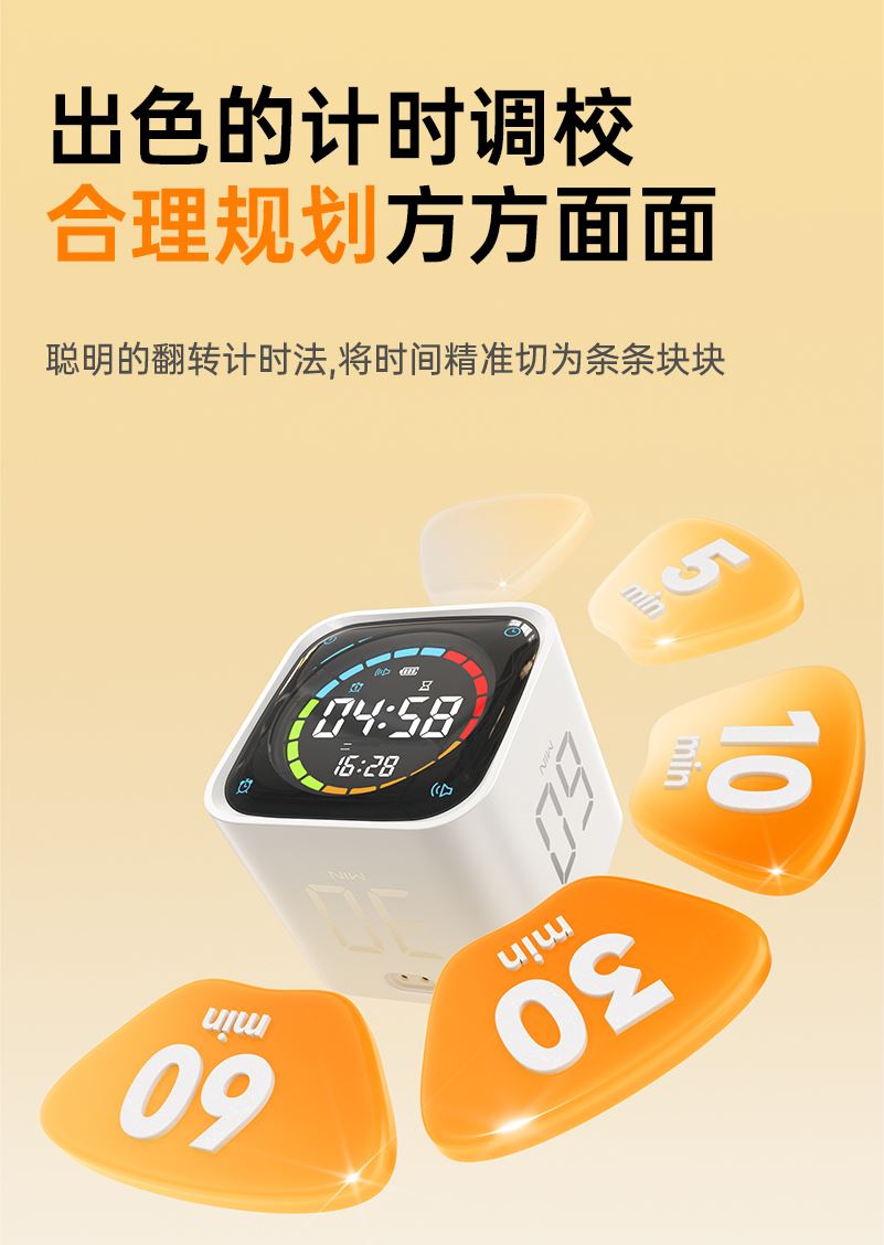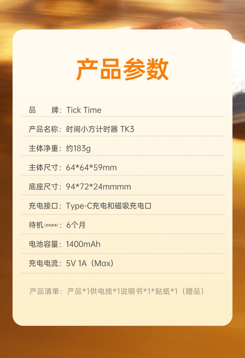 产品:时间小方计时器TK3 主体净重:约183g,底座净重:约56g 主体尺寸:64*64*59mm 底座尺寸:94*72*24mmmm 充电接口:Type-C充电和磁吸充电口 待机(机状态):6个月 电池容量:1400mAh 充电电流:5V1A(Max) 自律计时器 四维时间管理 一翻双用:翻转秒切正反双计时(作业/运动/兴趣班) 三键闯关:3组闹钟规律作息(起床+学习+睡眠打卡)