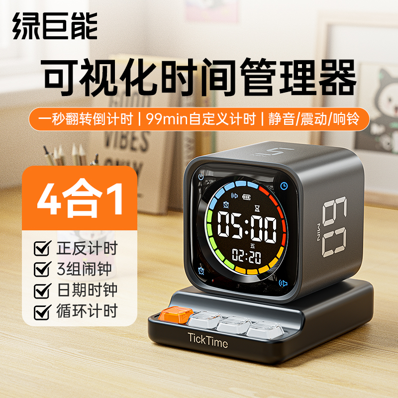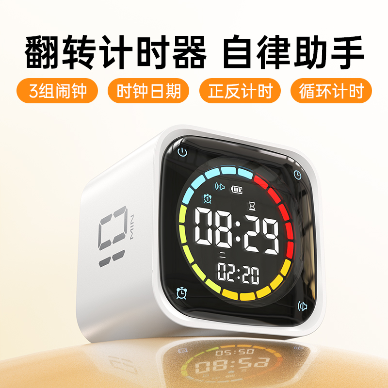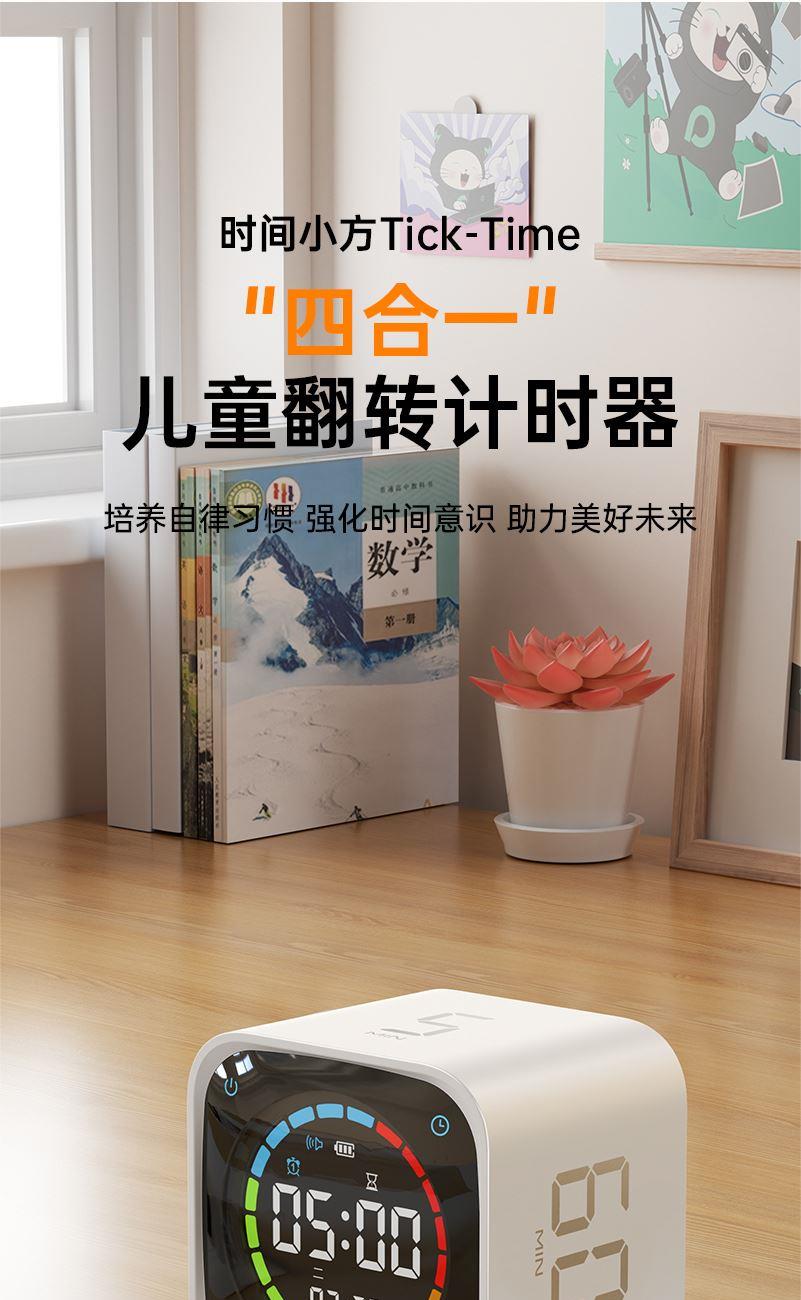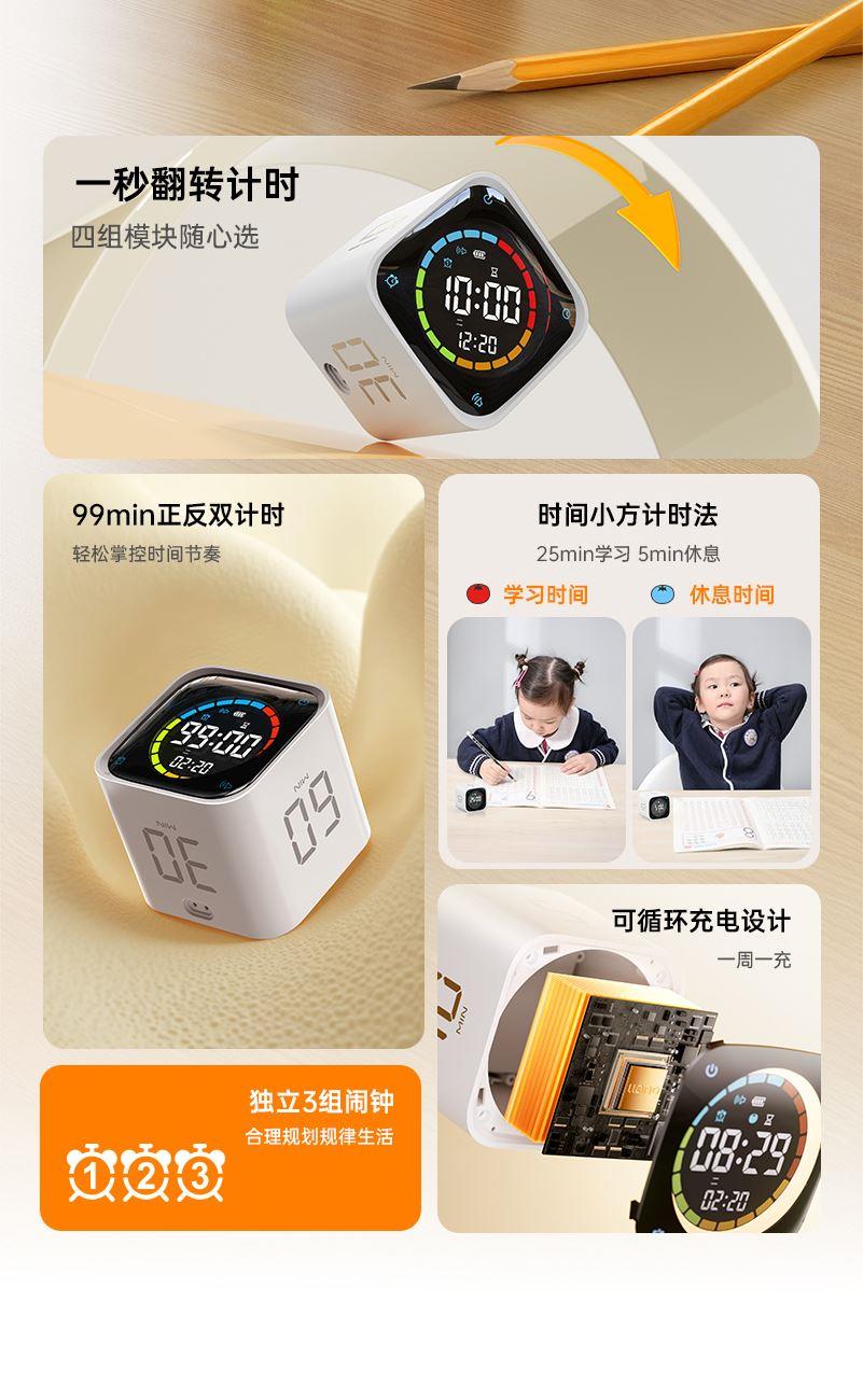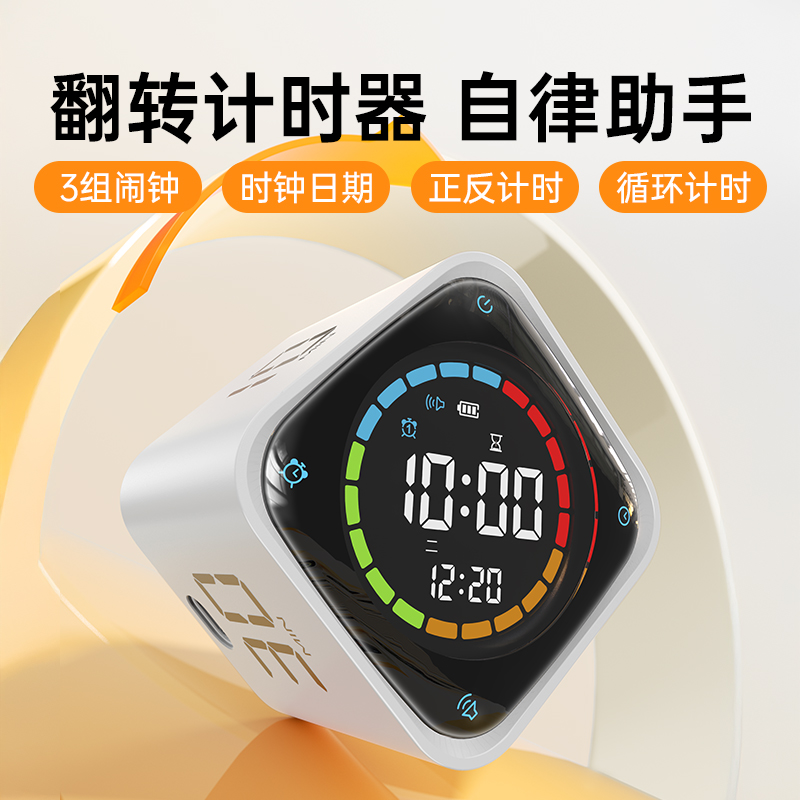产品:时间小方计时器TK3 主体净重:约183g,底座净重:约56g 主体尺寸:64*64*59mm 底座尺寸:94*72*24mmmm 充电接口:Type-C充电和磁吸充电口 待机(机状态):6个月 电池容量:1400mAh 充电电流:5V1A(Max) 自律计时器 四维时间管理 一翻双用:翻转秒切正反双计时(作业/运动/兴趣班) 三键闯关:3组闹钟规律作息(起床+学习+睡眠打卡)