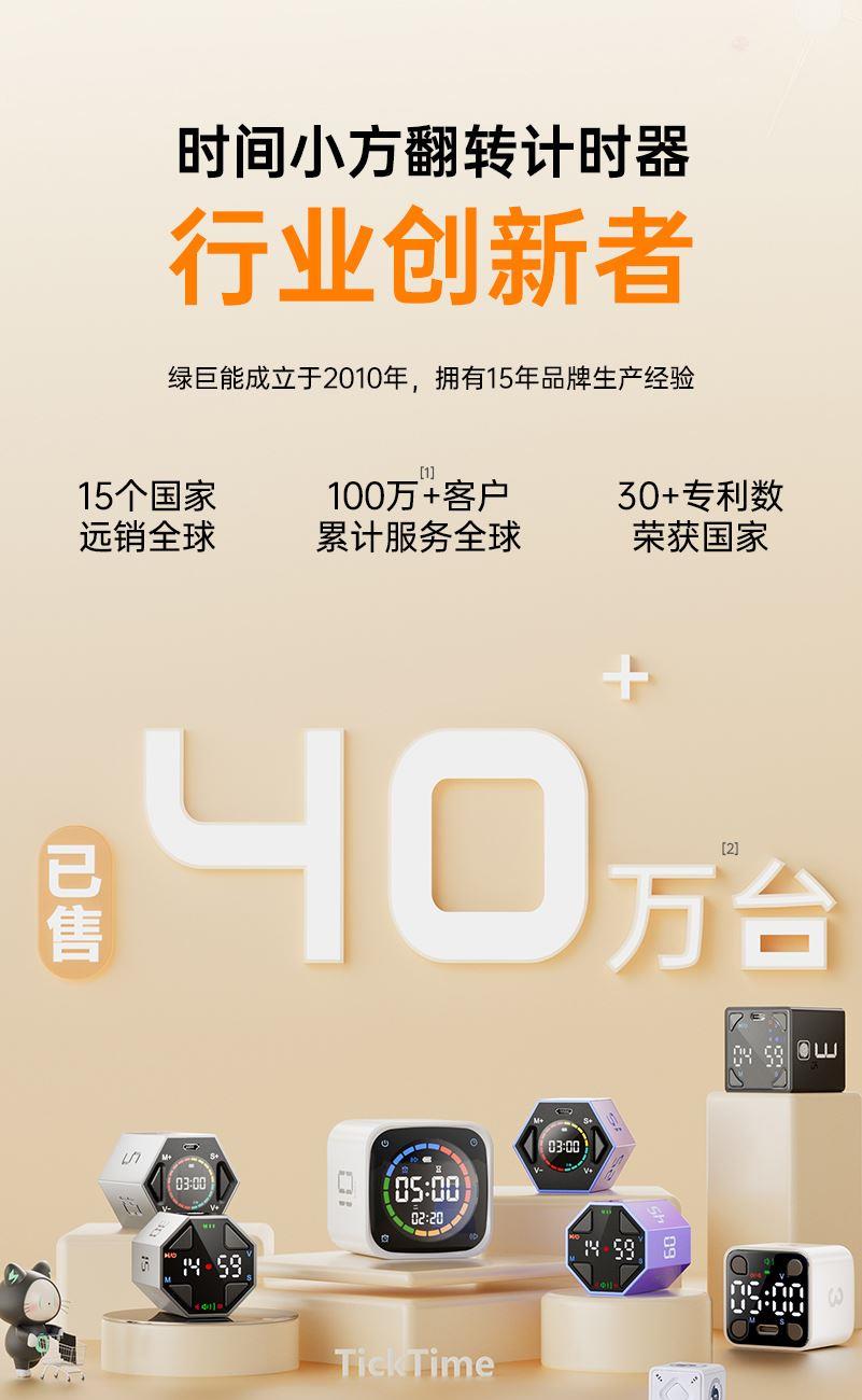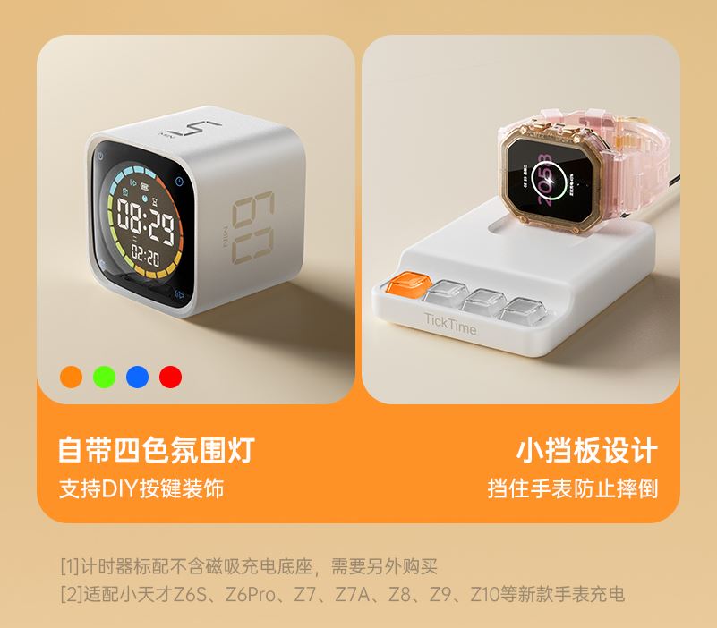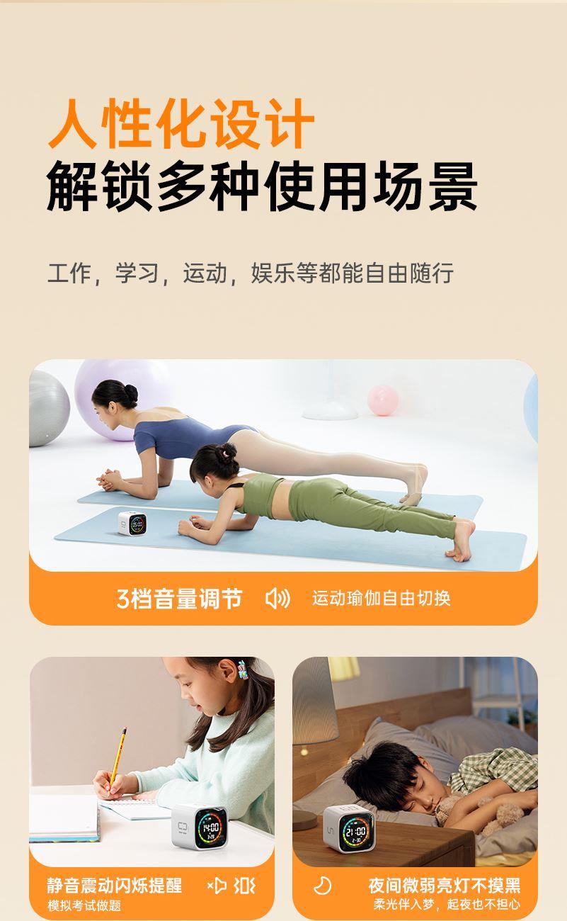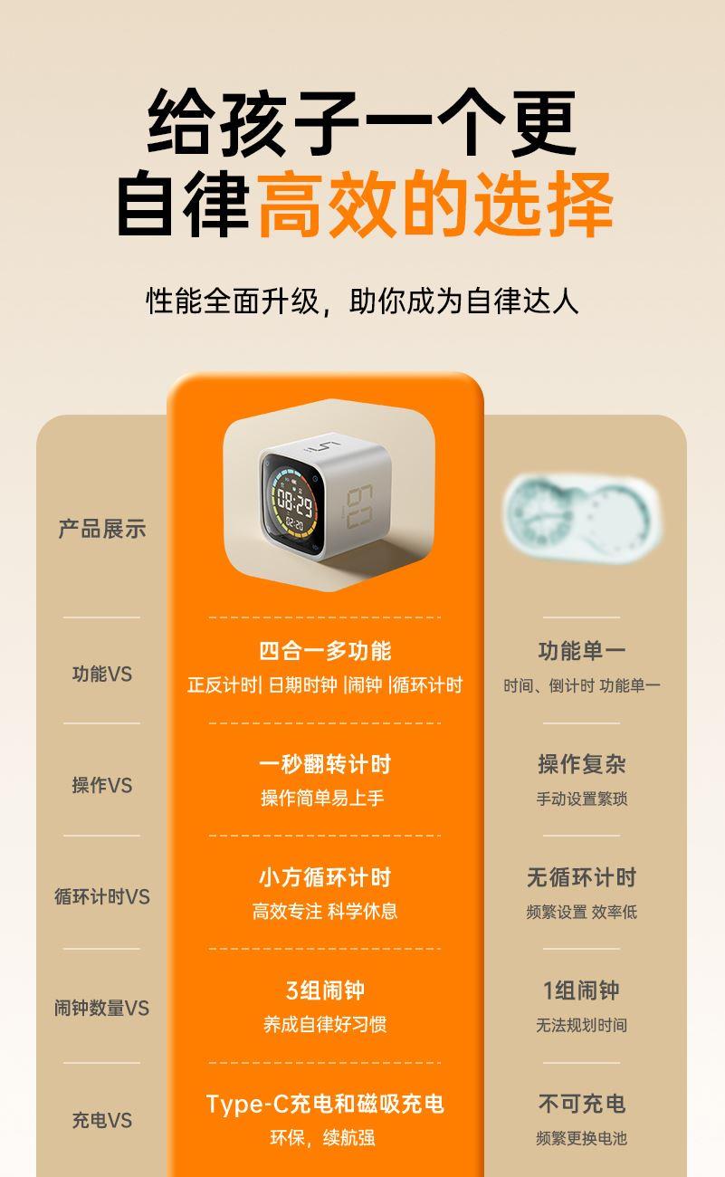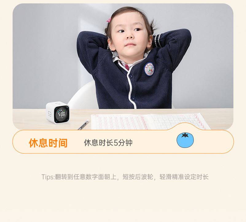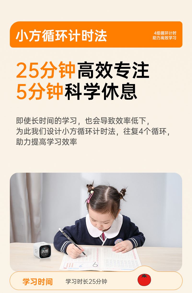 产品:时间小方计时器TK3 主体净重:约183g,底座净重:约56g 主体尺寸:64*64*59mm 底座尺寸:94*72*24mmmm 充电接口:Type-C充电和磁吸充电口 待机(机状态):6个月 电池容量:1400mAh 充电电流:5V1A(Max) 自律计时器 四维时间管理 一翻双用:翻转秒切正反双计时(作业/运动/兴趣班) 三键闯关:3组闹钟规律作息(起床+学习+睡眠打卡)