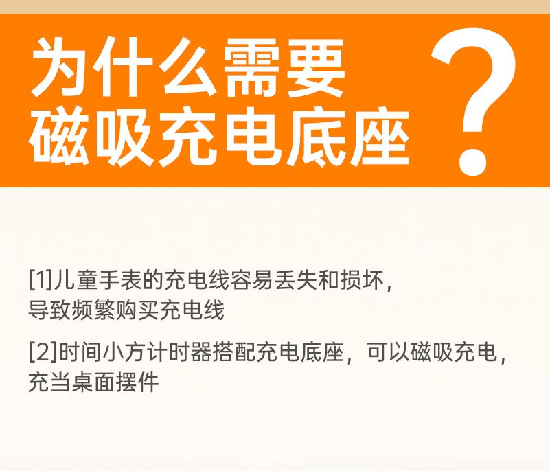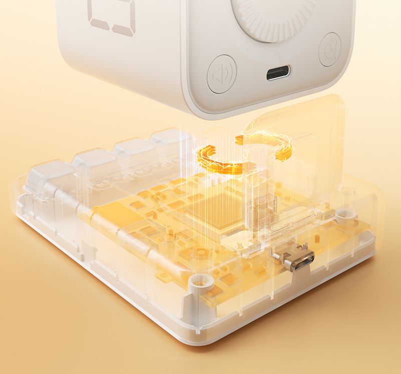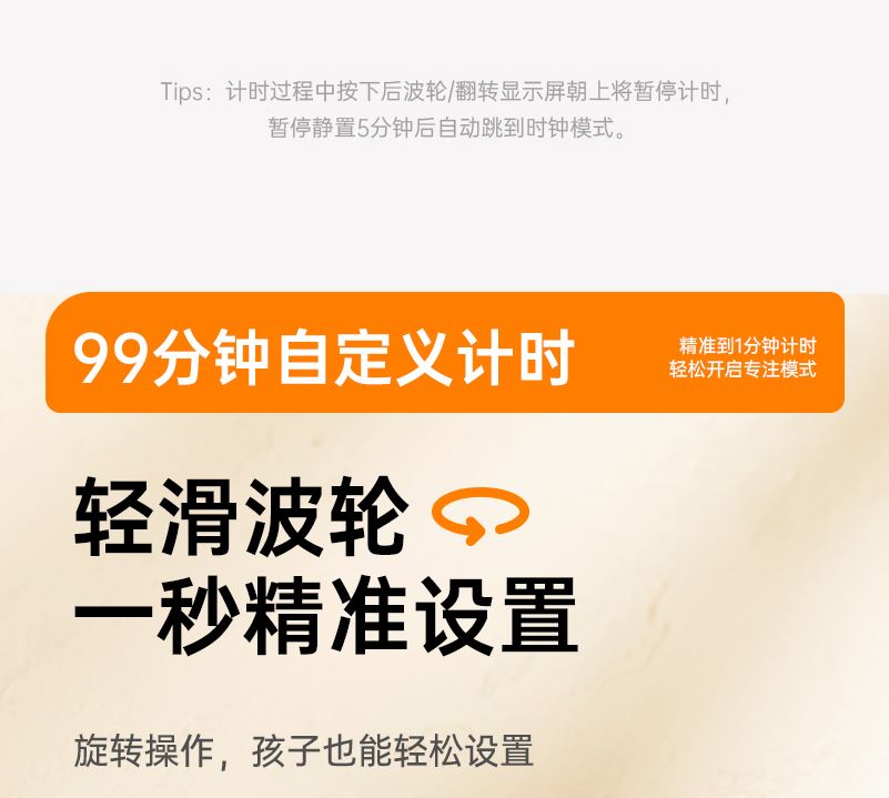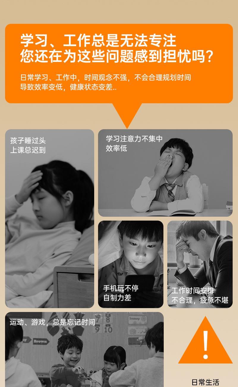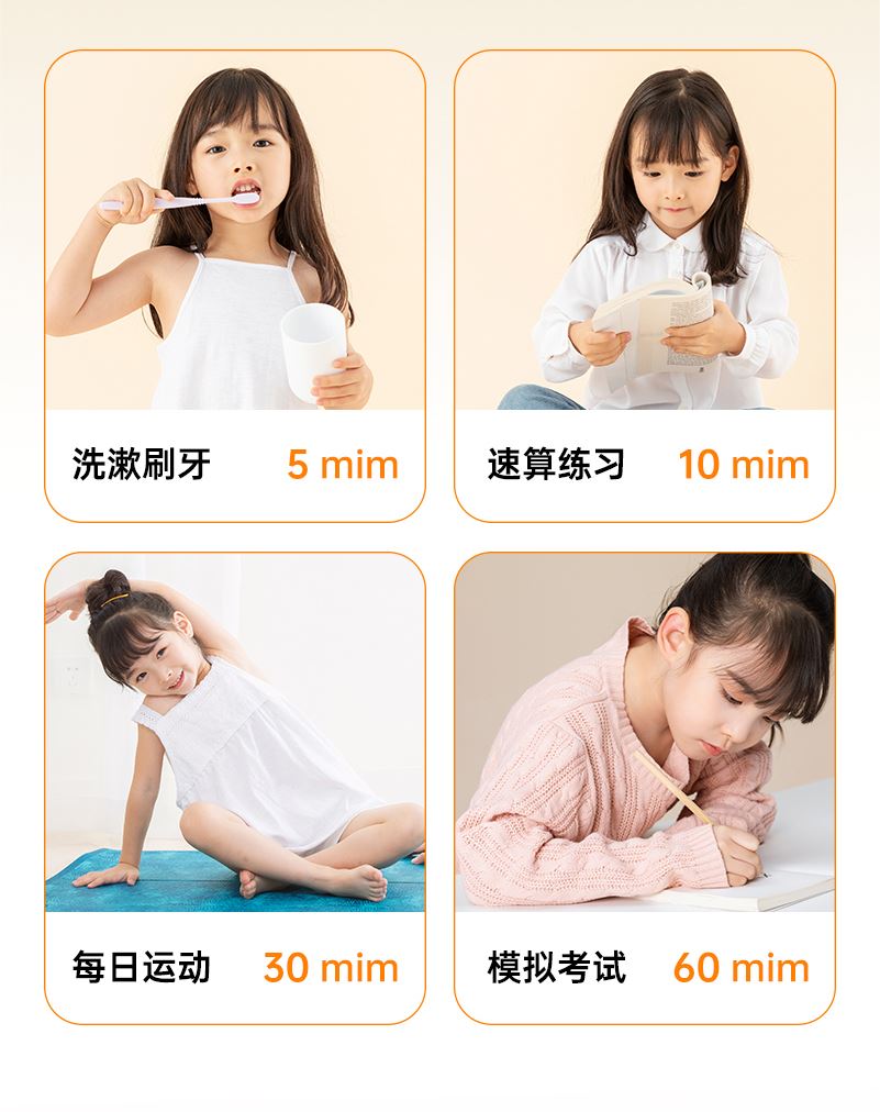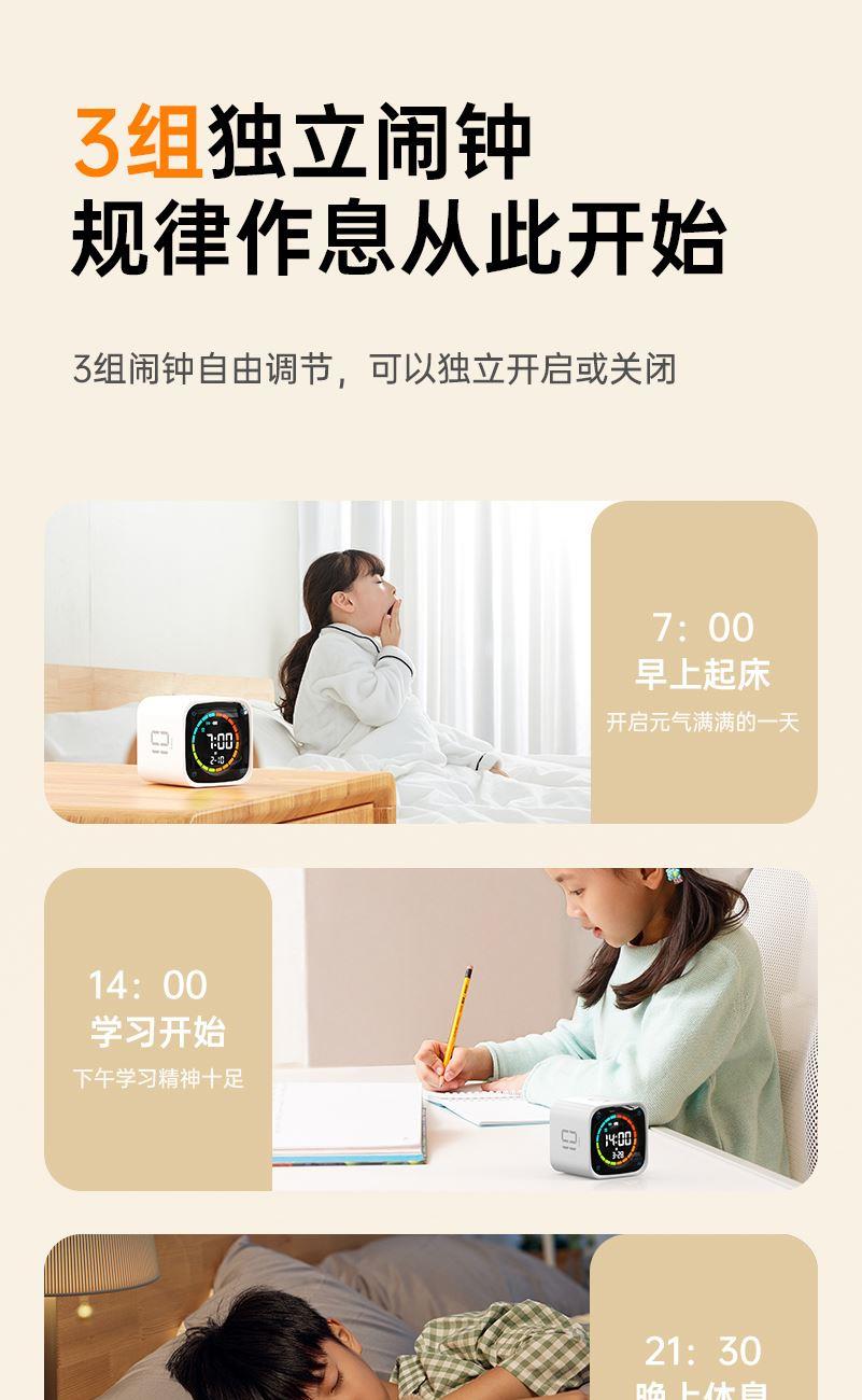 产品:时间小方计时器TK3 主体净重:约183g,底座净重:约56g 主体尺寸:64*64*59mm 底座尺寸:94*72*24mmmm 充电接口:Type-C充电和磁吸充电口 待机(机状态):6个月 电池容量:1400mAh 充电电流:5V1A(Max) 自律计时器 四维时间管理 一翻双用:翻转秒切正反双计时(作业/运动/兴趣班) 三键闯关:3组闹钟规律作息(起床+学习+睡眠打卡)