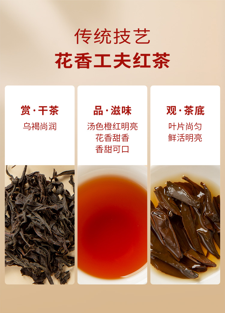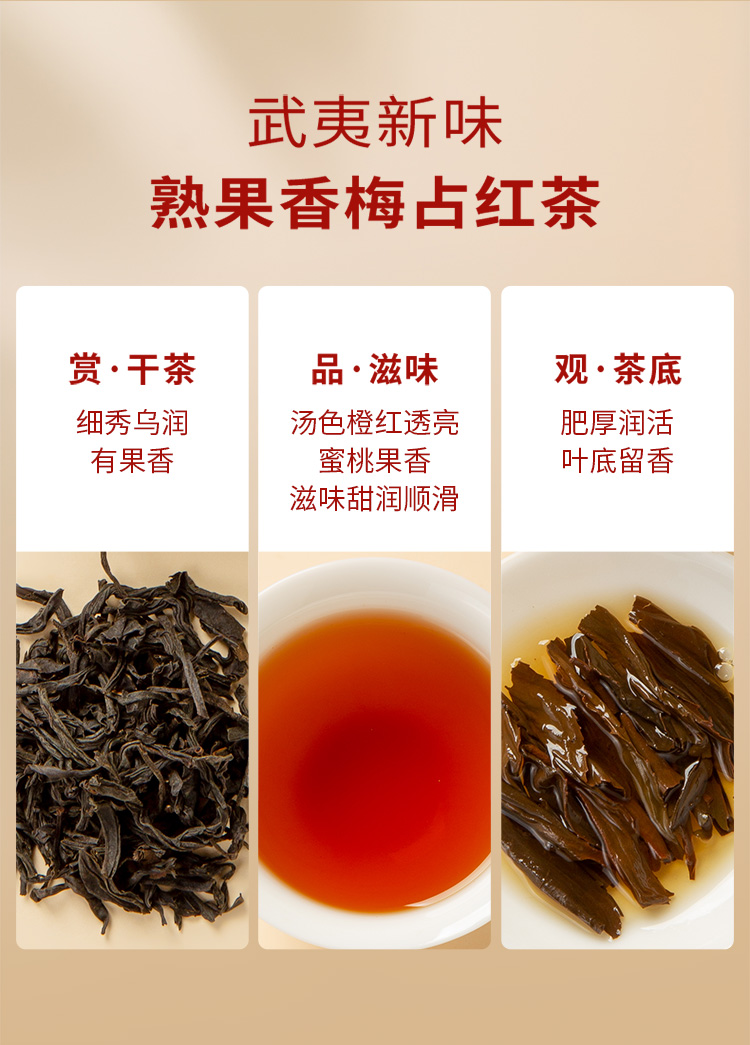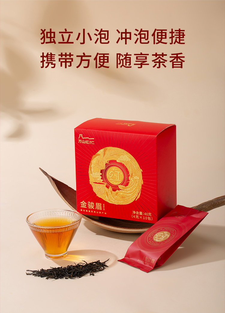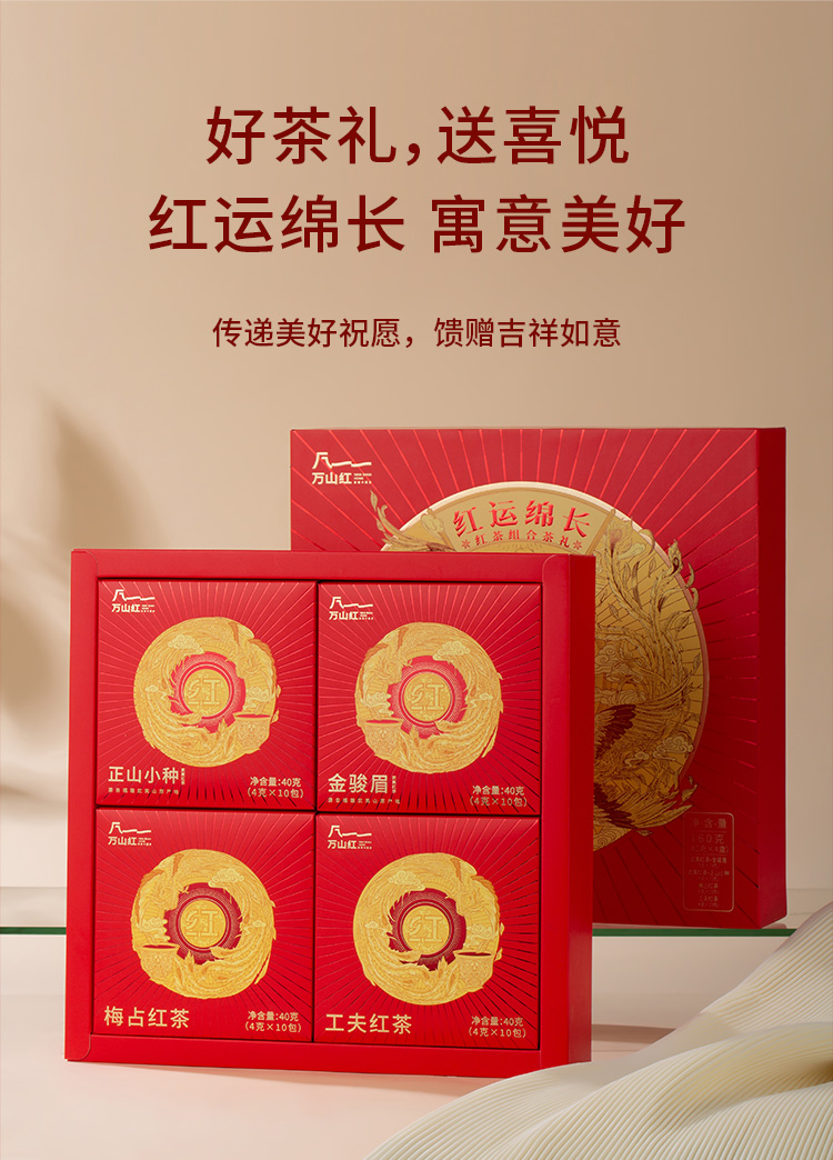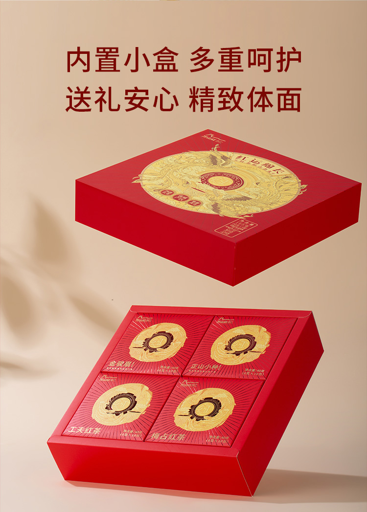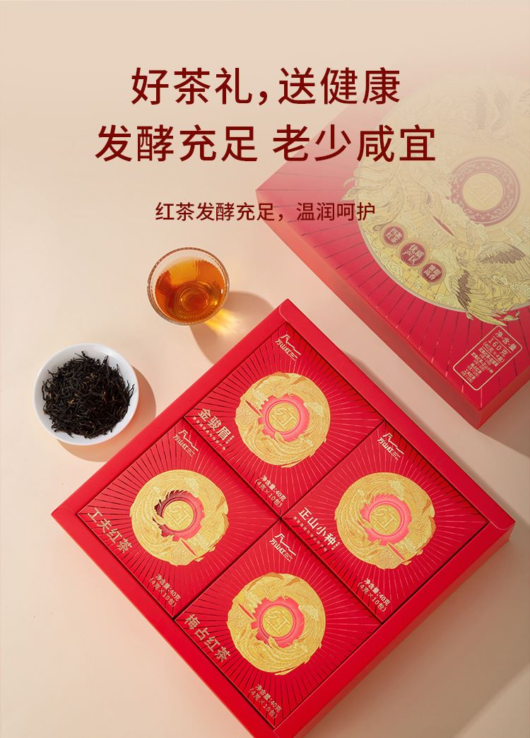 【包装尺寸】27*27*7cm 【净 含 量】160克 (金骏眉4克*10包+正山小种4克*10包+梅占红茶4克*10包+工夫红茶4克*10包) 【保 质 期】36个月 【包装】精装礼盒装 【储藏条件】防潮湿,防异味,避光直射