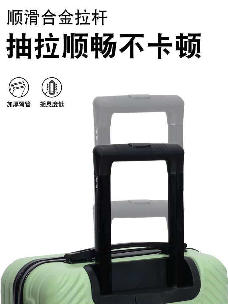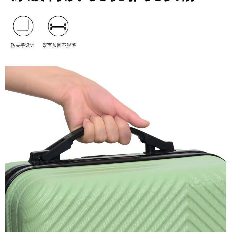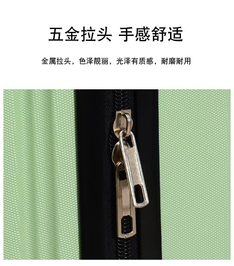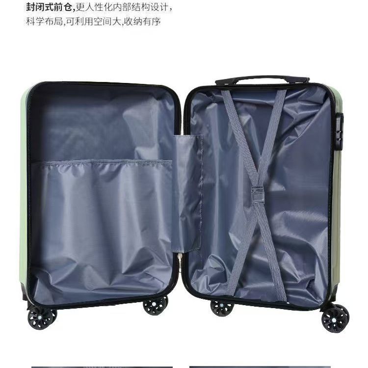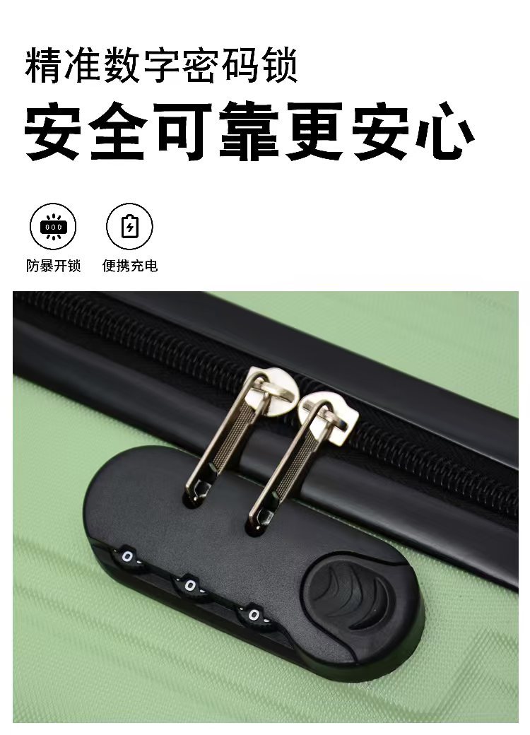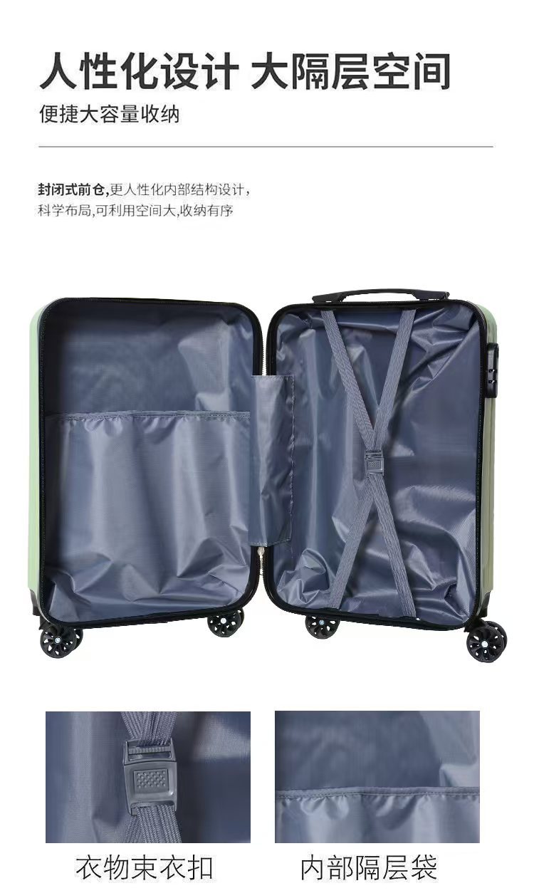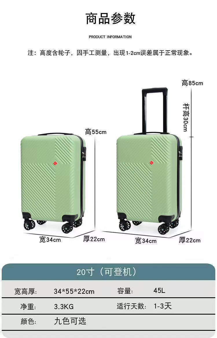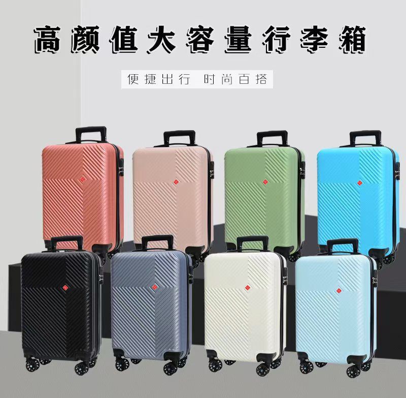 货号: 7917 规格:50*36*23cm 颜色:蓝色/黑色/粉色/绿色/玫瑰金 ★主面料:ABS+PC,里料:涤纶 ★时尚的外观设计,拉杆箱一体密码锁,方便更加保障您的行李安全 ★ABS+PC材质,牢固、轻便,为您的出行省力, ★专业的内部隔层设计,方便您放置您的出行衣物和物品清晰 ★360度旋转静音轮,保障拉杆箱可以往任意方向行进