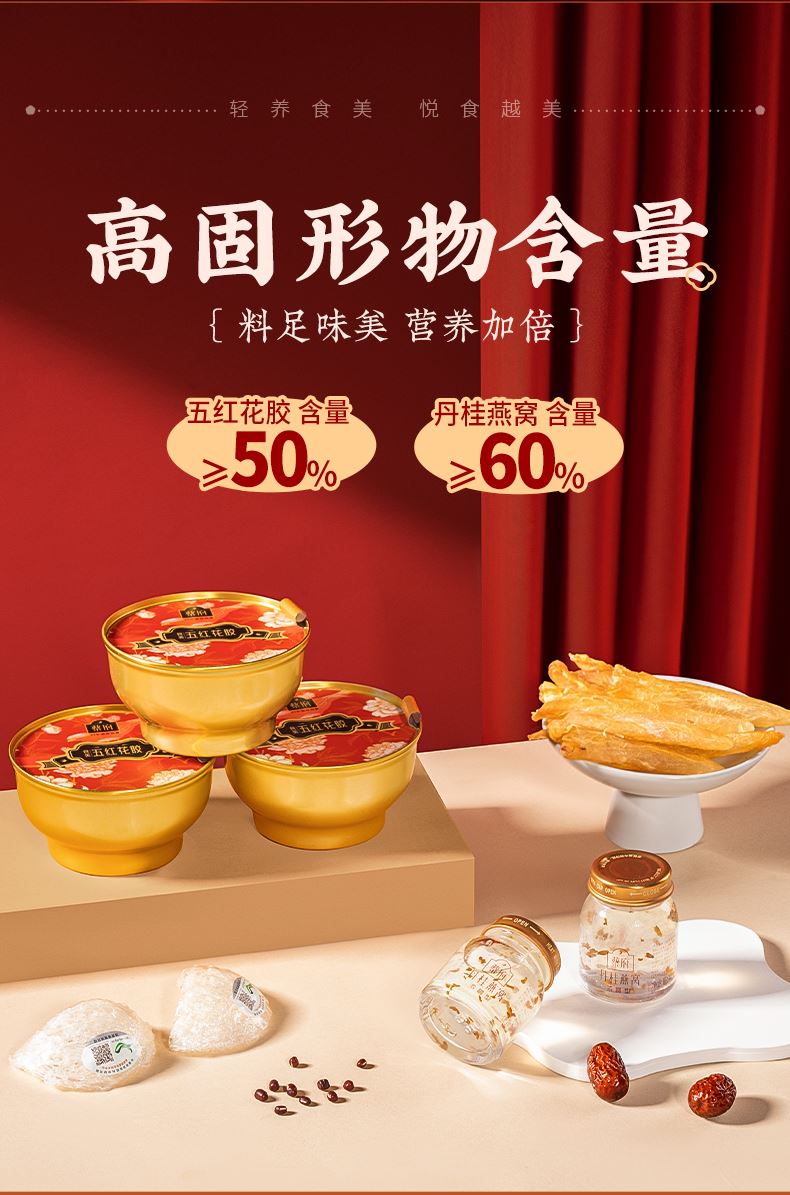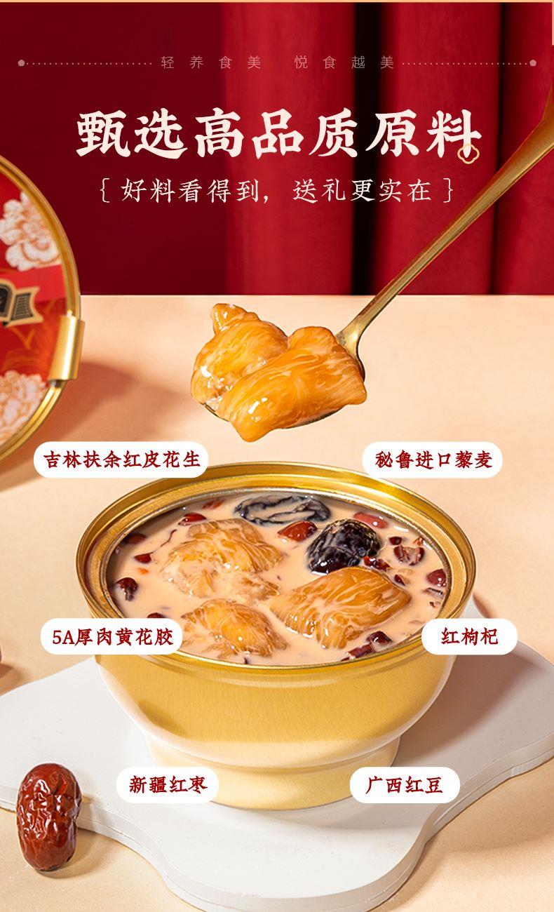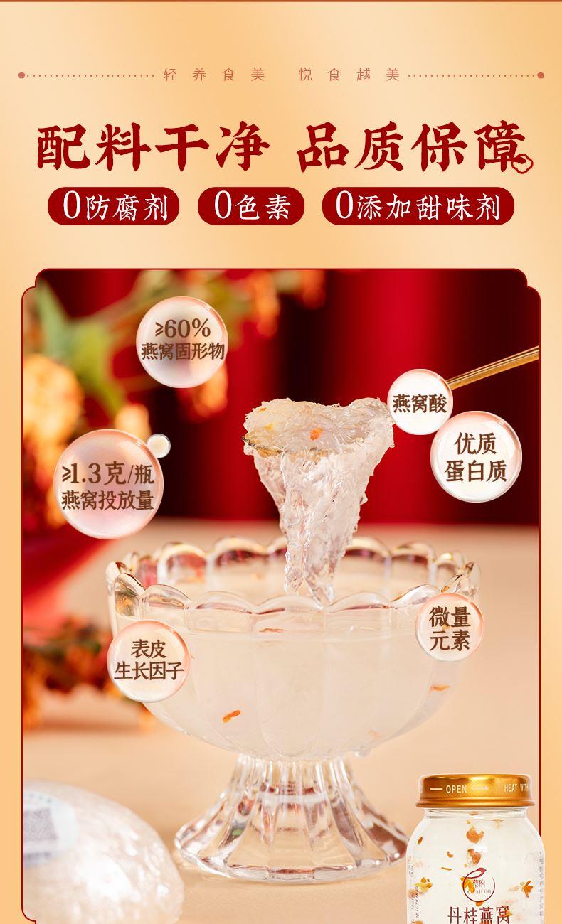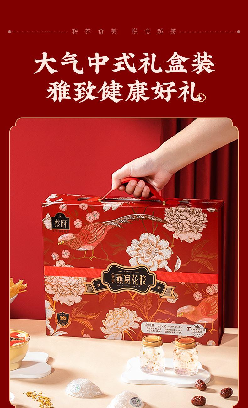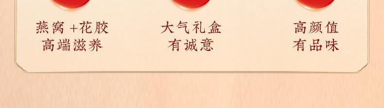规格:1.24kg(丹桂燕窝40g*6瓶+五红花胶250g*4碗) 单品尺寸:35*28*8cm 燕窝+花胶组合礼盒,轻奢礼盒,优雅精致,超高性价比礼盒,适合自购食用或不同人群送礼需求; 内含丹桂燕窝6瓶,五红花胶4份,十全十美寓意; 丹桂燕窝:精选马来红树林燕盏炖煮,每瓶净含量40克,干燕窝投放量1.3克,固形物含量≥60%; 五红花胶:精选黄花胶精炖,每碗净含量250克,花胶含量约70克+,固形物含量≥50%; 燕窝+花胶,多元化食材搭配,营养结构更完善; 121℃商业无菌工艺,10万级无菌净化车间,精工锁鲜炖煮; 开盖即食,省时省力又省心。