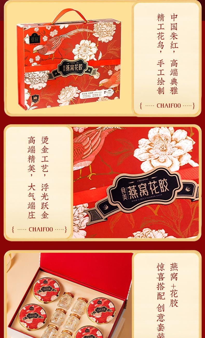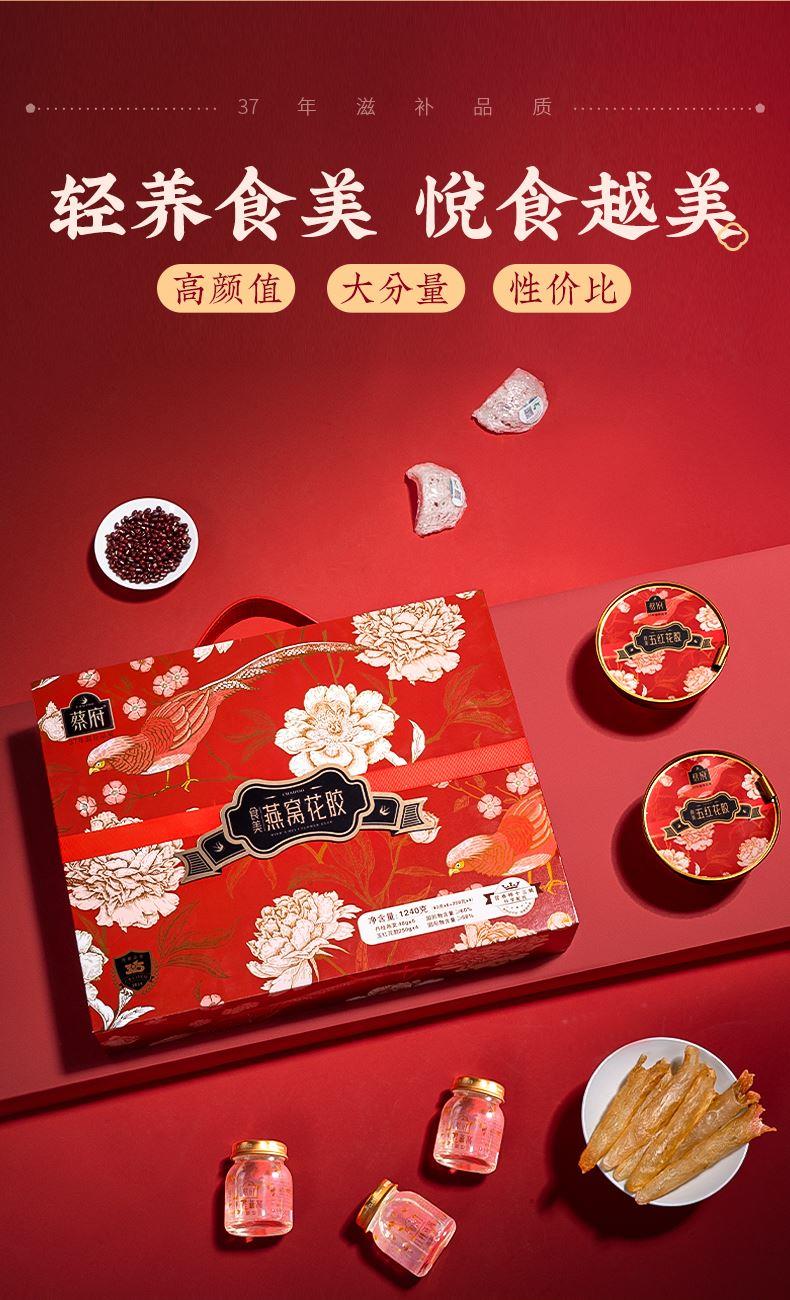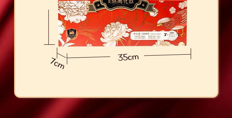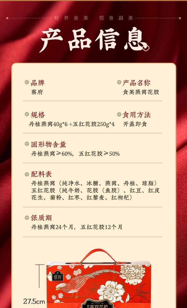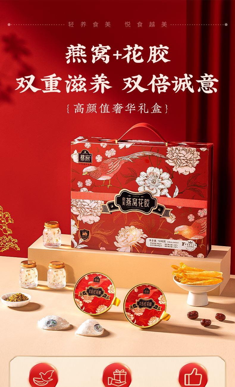 规格:1.24kg(丹桂燕窝40g*6瓶+五红花胶250g*4碗) 单品尺寸:35*28*8cm 燕窝+花胶组合礼盒,轻奢礼盒,优雅精致,超高性价比礼盒,适合自购食用或不同人群送礼需求; 内含丹桂燕窝6瓶,五红花胶4份,十全十美寓意; 丹桂燕窝:精选马来红树林燕盏炖煮,每瓶净含量40克,干燕窝投放量1.3克,固形物含量≥60%; 五红花胶:精选黄花胶精炖,每碗净含量250克,花胶含量约70克+,固形物含量≥50%; 燕窝+花胶,多元化食材搭配,营养结构更完善; 121℃商业无菌工艺,10万级无菌净化车间,精工锁鲜炖煮; 开盖即食,省时省力又省心。