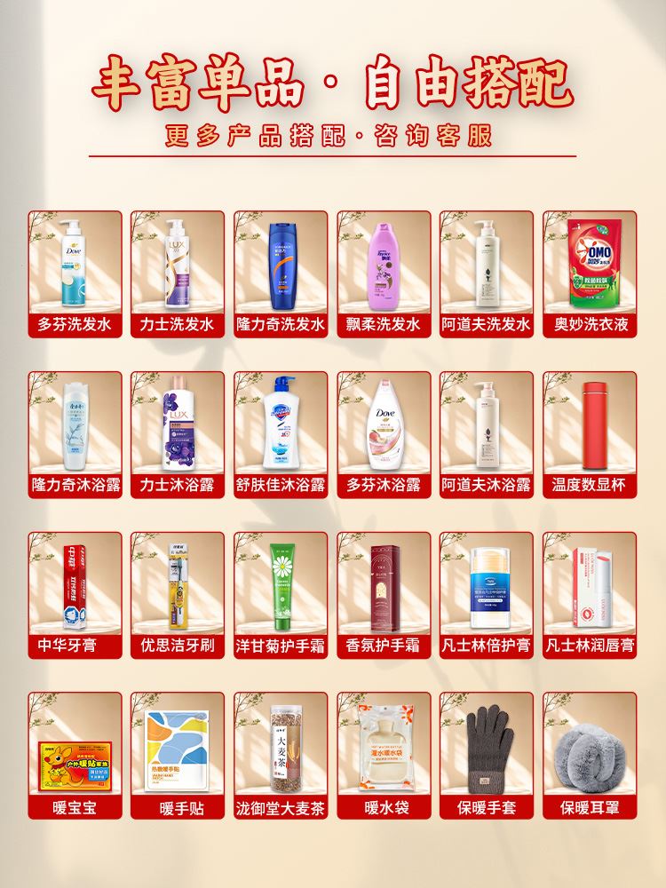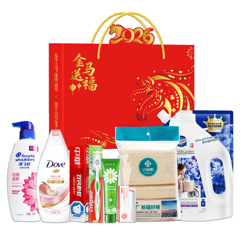 礼盒尺寸:32*8.5*24.5cm 包装尺寸:66* 46.5*51 CM 产品配置:(香型随机) 海飞丝洗发水300ml 多芬沐浴露300ml 中华牙膏90g 高露洁牙刷 洁丽雅毛巾(69*33cm) 凡士林润唇膏2.7g 洋甘菊护手霜75g 蔬果园洗衣液500g 精美礼盒