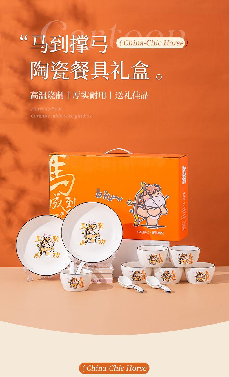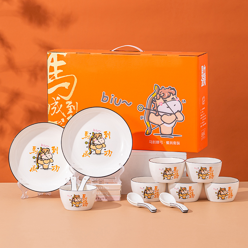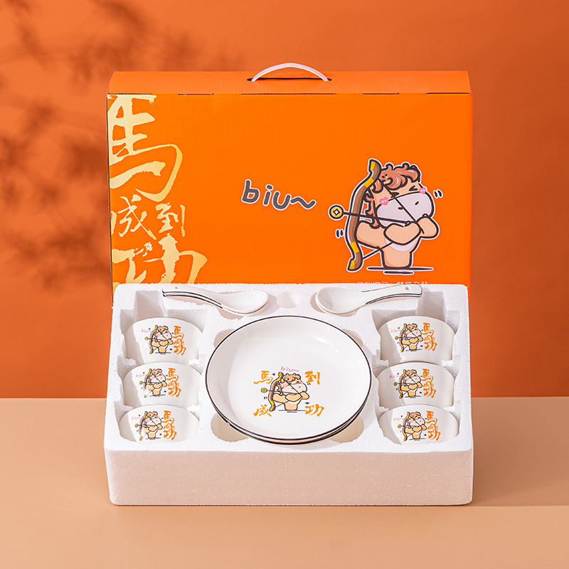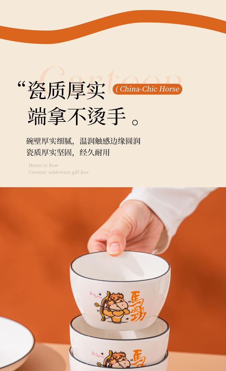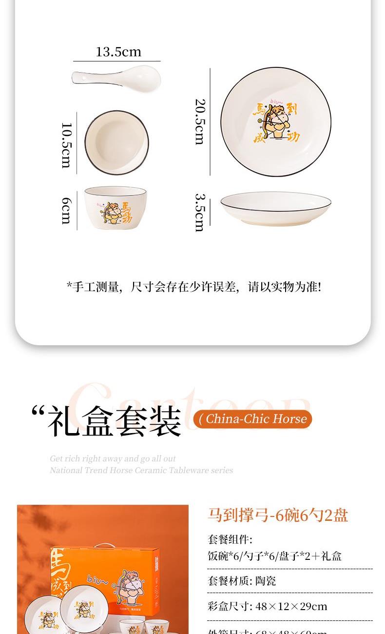 产品组成:整套=6碗6勺2盘 产品材质:强化瓷 产品规格:陶瓷碗=口径10.5cm,高度6cm;盘子直径20.5cm, 高3.5cm;三弯勺=长13.5cm 彩盒尺寸:48×12×29cm 外箱毛重:27公斤 外箱尺寸:68×48×60cm ------------ 马到撑弓,事事成功 喜欢这种把祝福藏进小细节里的感觉!小马到撑弓的憨劲,小萌马攥着劲拉弓的样子,连箭尖都像带着“能成”的底气。加上“马到撑弓 事事成功”这八个字,不管是贴在心里当念想,还是说给身边人听,都像在说“别怕用力,你想成的事,都会顺着这股劲成了”,简单却特别戳心。新的一年都能跟着这股攒劲的劲儿,件件成、事事顺。