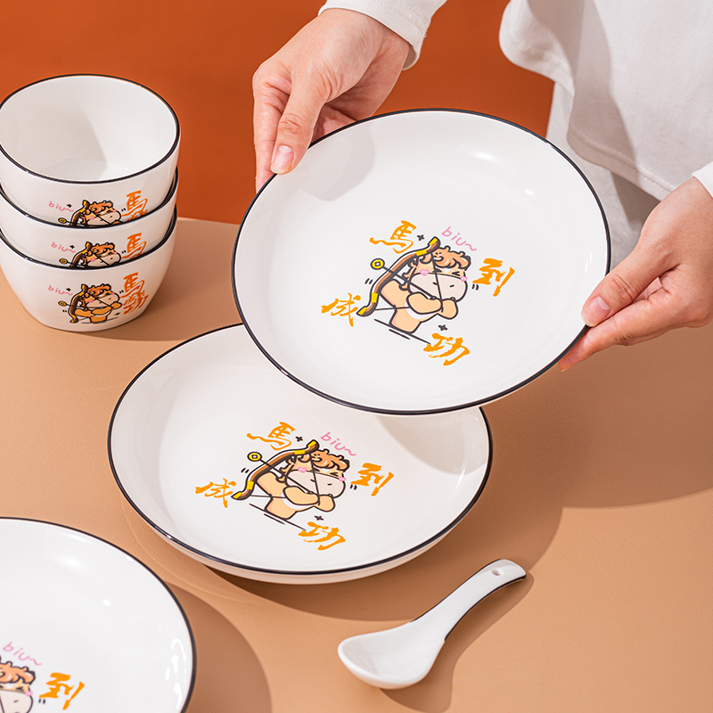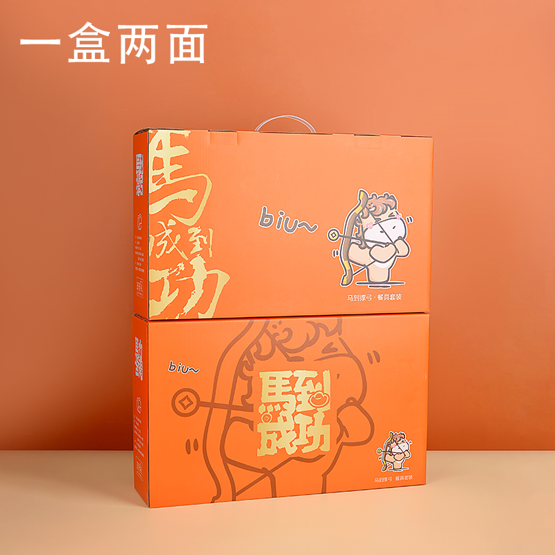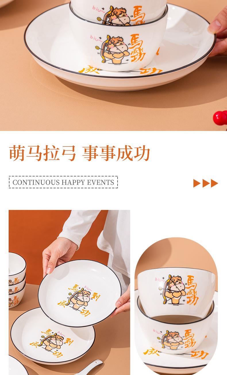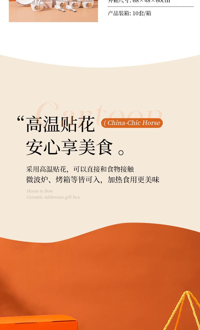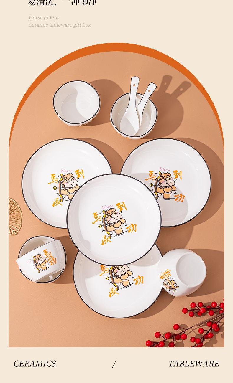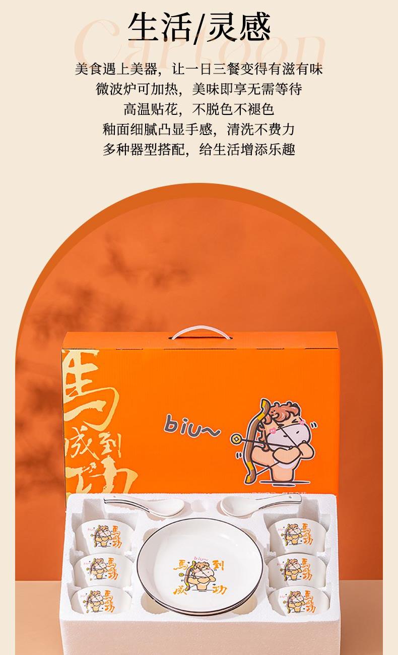 产品组成:整套=6碗6勺2盘 产品材质:强化瓷 产品规格:陶瓷碗=口径10.5cm,高度6cm;盘子直径20.5cm, 高3.5cm;三弯勺=长13.5cm 彩盒尺寸:48×12×29cm 外箱毛重:27公斤 外箱尺寸:68×48×60cm ------------ 马到撑弓,事事成功 喜欢这种把祝福藏进小细节里的感觉!小马到撑弓的憨劲,小萌马攥着劲拉弓的样子,连箭尖都像带着“能成”的底气。加上“马到撑弓 事事成功”这八个字,不管是贴在心里当念想,还是说给身边人听,都像在说“别怕用力,你想成的事,都会顺着这股劲成了”,简单却特别戳心。新的一年都能跟着这股攒劲的劲儿,件件成、事事顺。