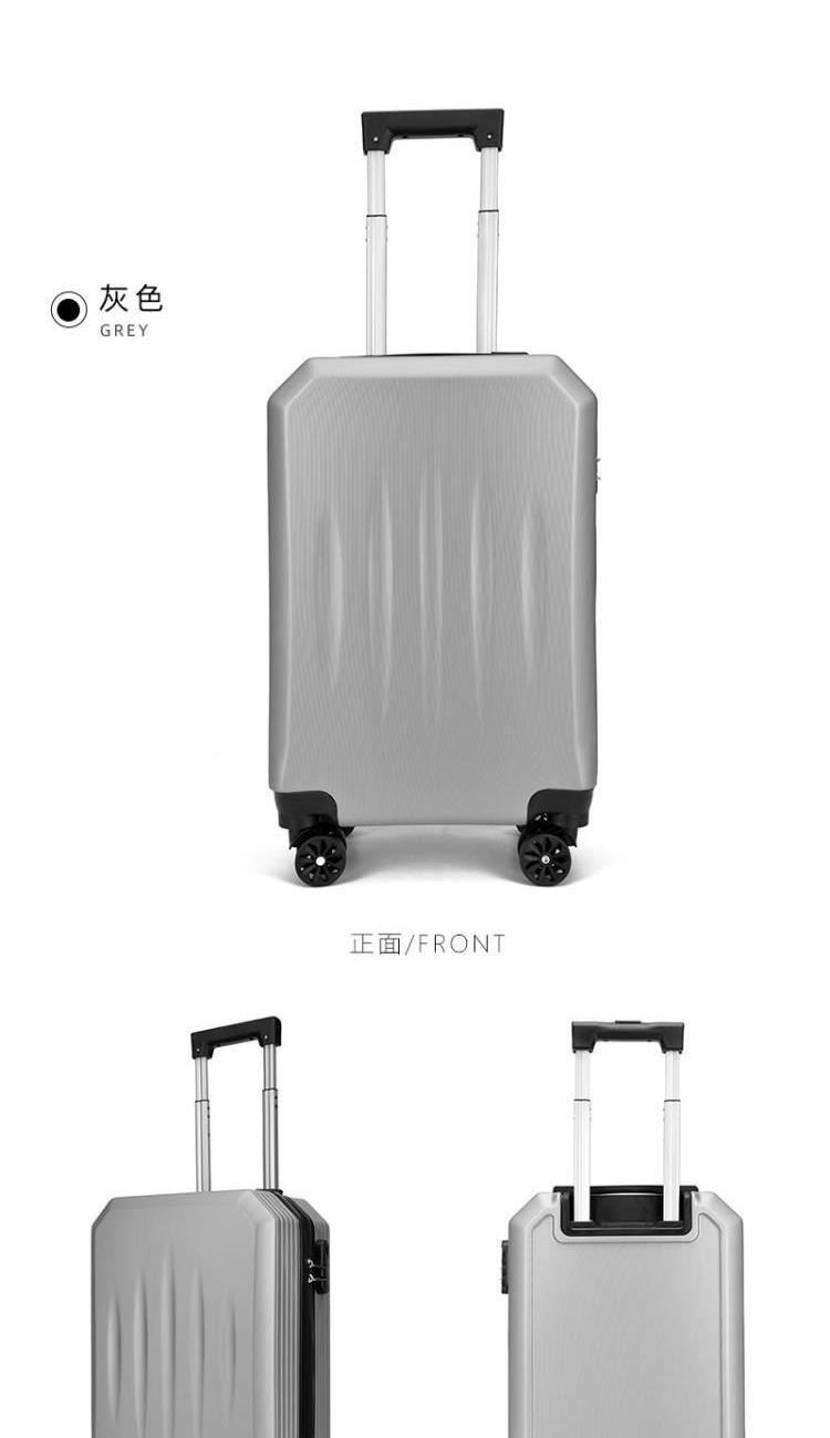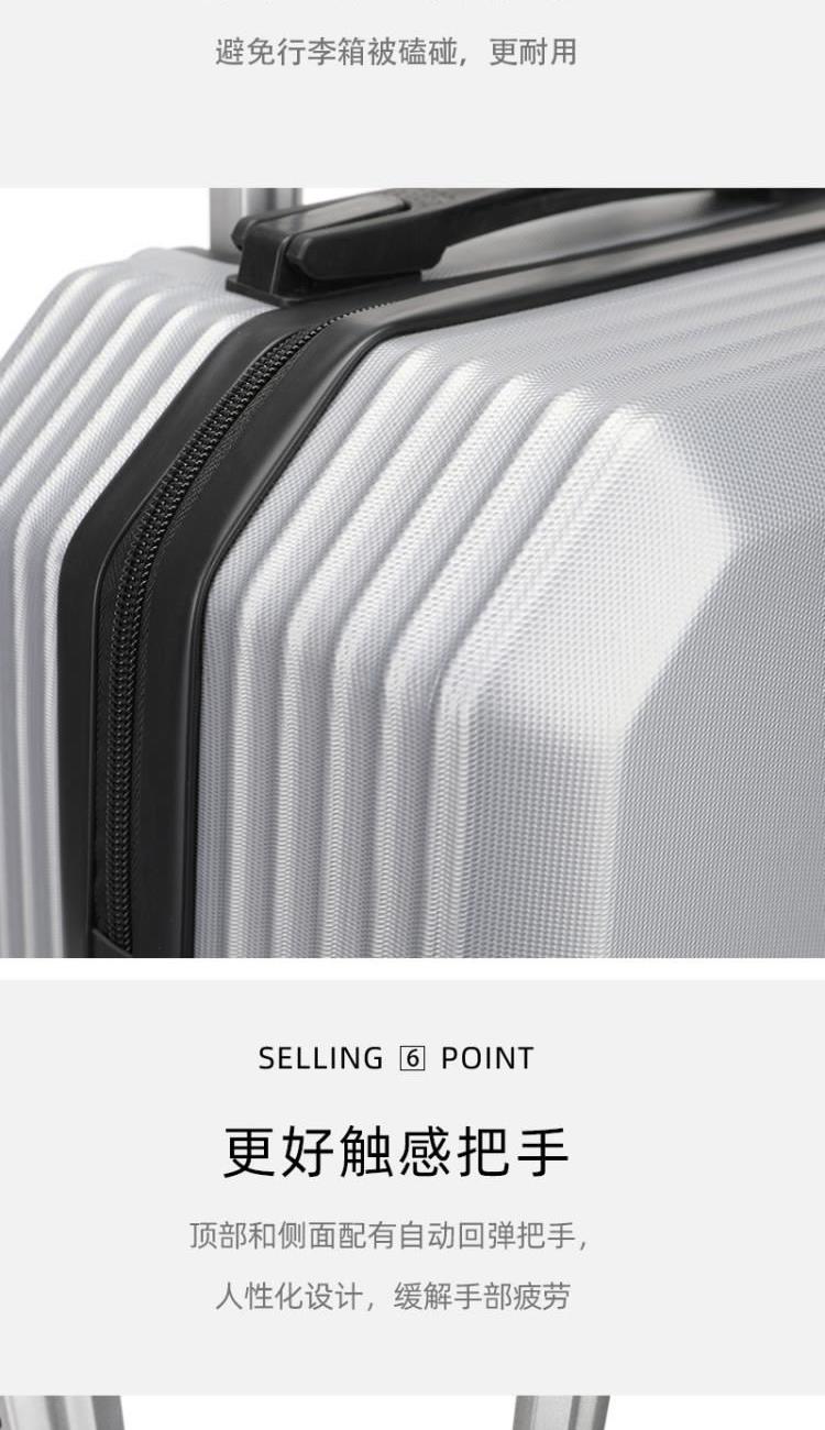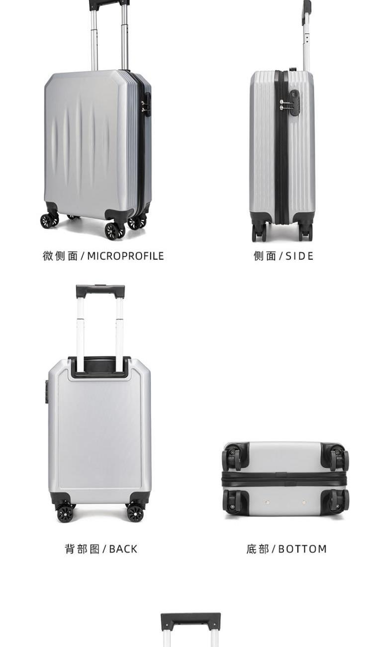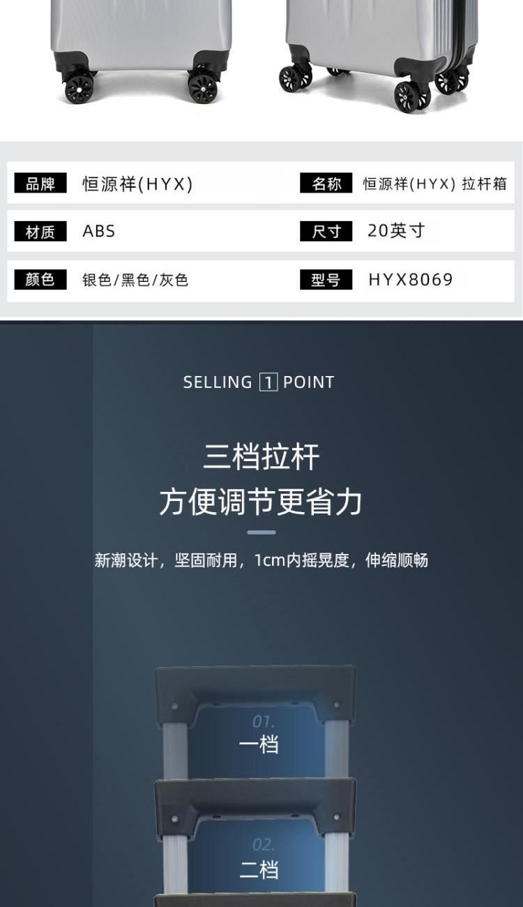 型号:HYX8069 颜色:黑色/银色 材质:ABS 规格:20英寸 净重:2.5kg 卖点:简约格调,轻松收纳,畅快出行; 德国拜耳PC材质,质地轻盈,高耐热、抗冲击、阻燃、刚硬、柔韧(可踩、摔不变形),犹如护盾般保护着箱内物品; 耐用塑胶提手,柔软触感,温柔接触; 360°万向四轮静音轮,32万米负重测试; 优质合金加厚航空级抗压拉杆; 通过拉杆震荡、翻滚撞击、负重角轮耐久度、防锈、防水等各项测试。