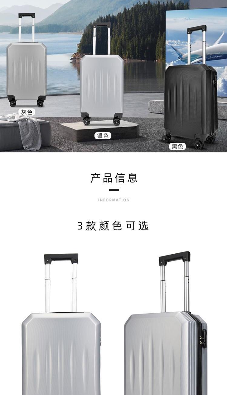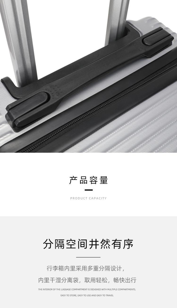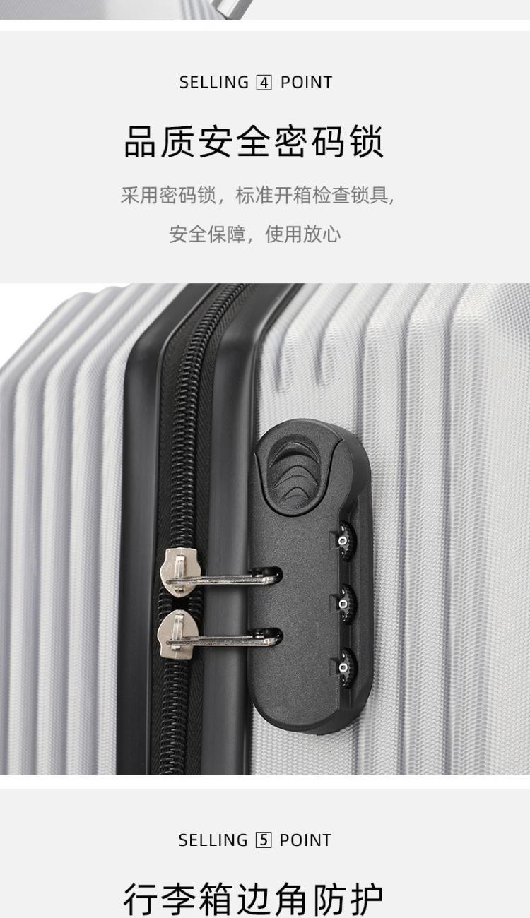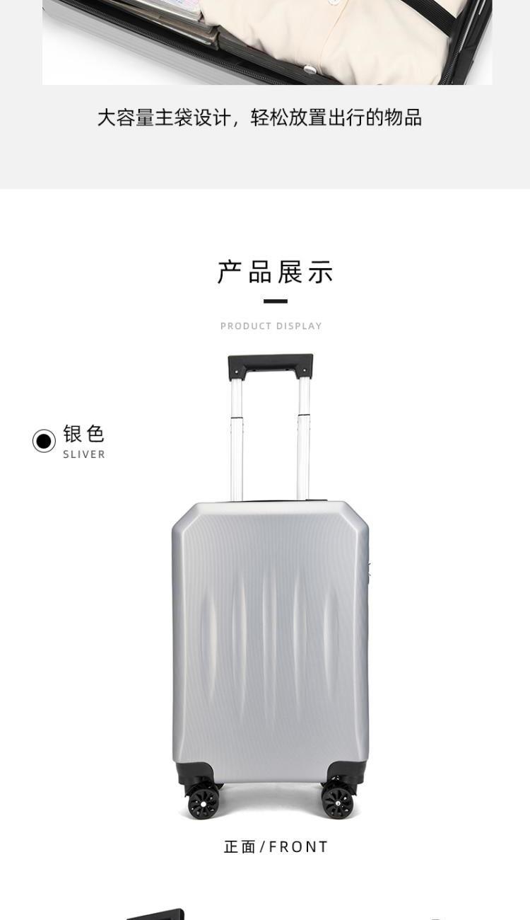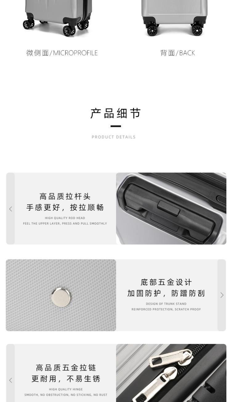 型号:HYX8069 颜色:黑色/银色 材质:ABS 规格:20英寸 净重:2.5kg 卖点:简约格调,轻松收纳,畅快出行; 德国拜耳PC材质,质地轻盈,高耐热、抗冲击、阻燃、刚硬、柔韧(可踩、摔不变形),犹如护盾般保护着箱内物品; 耐用塑胶提手,柔软触感,温柔接触; 360°万向四轮静音轮,32万米负重测试; 优质合金加厚航空级抗压拉杆; 通过拉杆震荡、翻滚撞击、负重角轮耐久度、防锈、防水等各项测试。