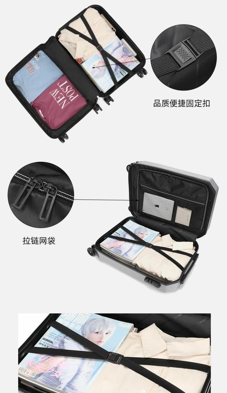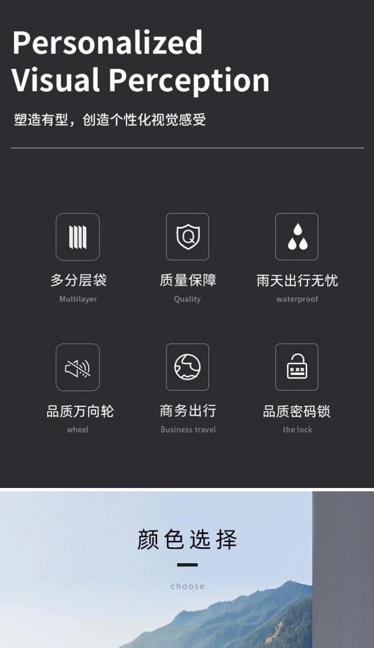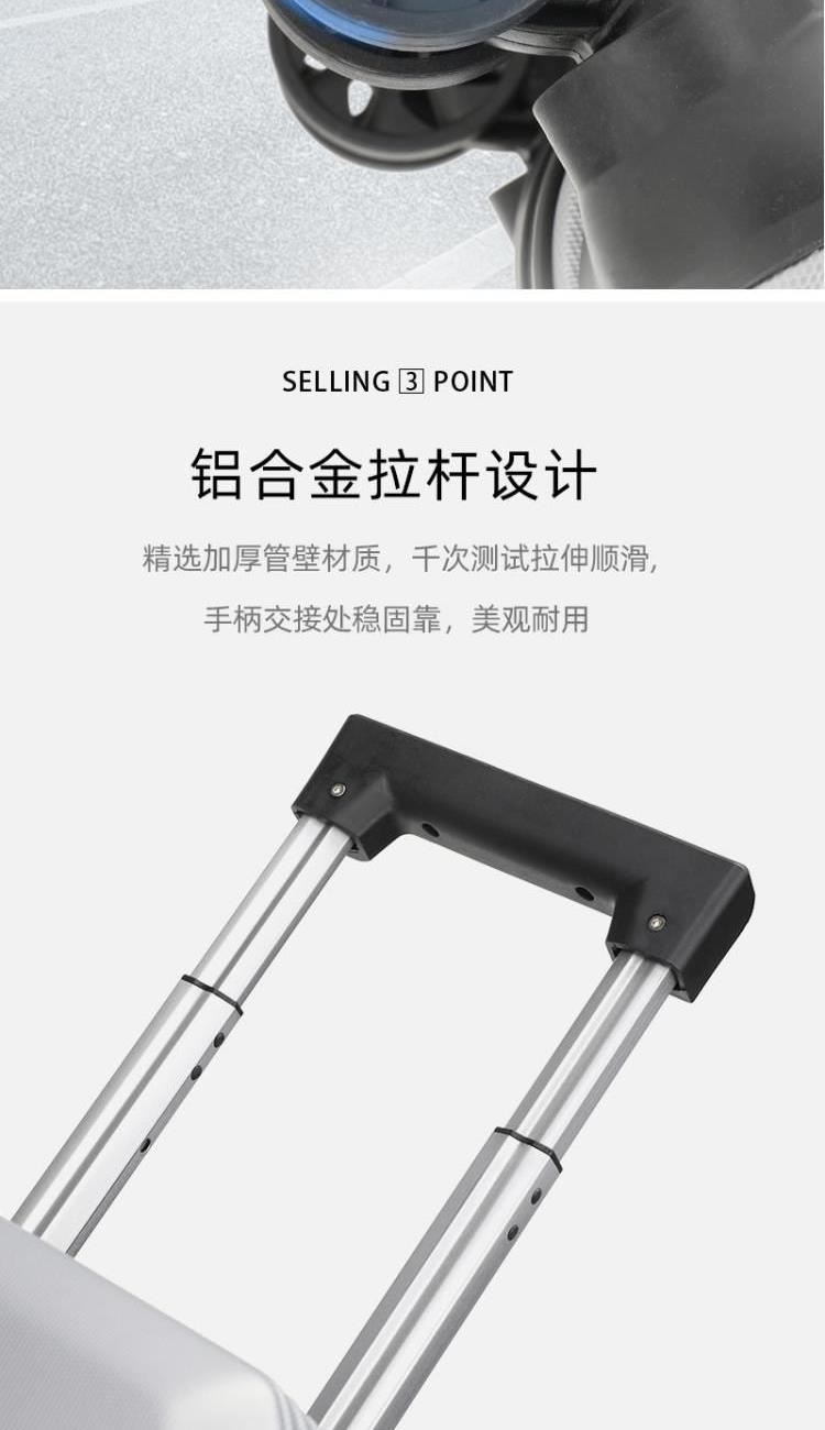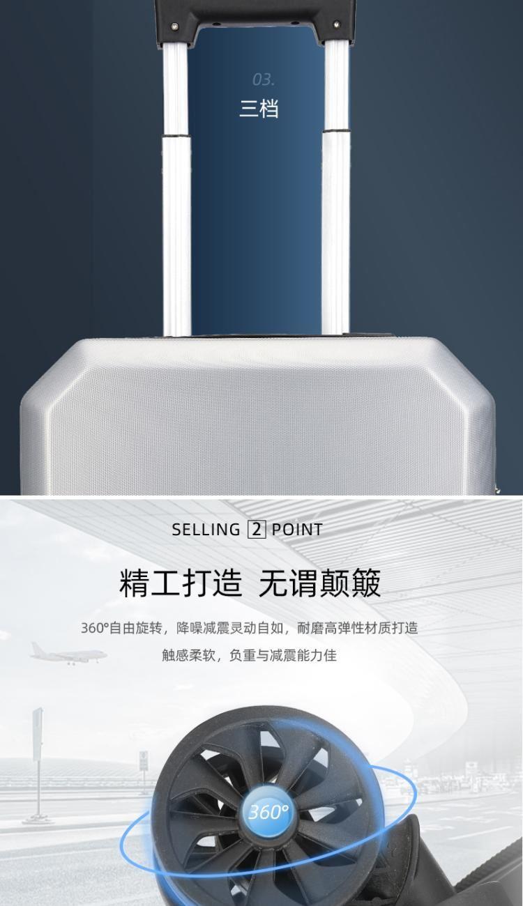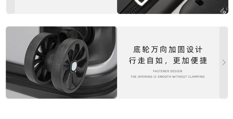 型号:HYX8069 颜色:黑色/银色 材质:ABS 规格:20英寸 净重:2.5kg 卖点:简约格调,轻松收纳,畅快出行; 德国拜耳PC材质,质地轻盈,高耐热、抗冲击、阻燃、刚硬、柔韧(可踩、摔不变形),犹如护盾般保护着箱内物品; 耐用塑胶提手,柔软触感,温柔接触; 360°万向四轮静音轮,32万米负重测试; 优质合金加厚航空级抗压拉杆; 通过拉杆震荡、翻滚撞击、负重角轮耐久度、防锈、防水等各项测试。