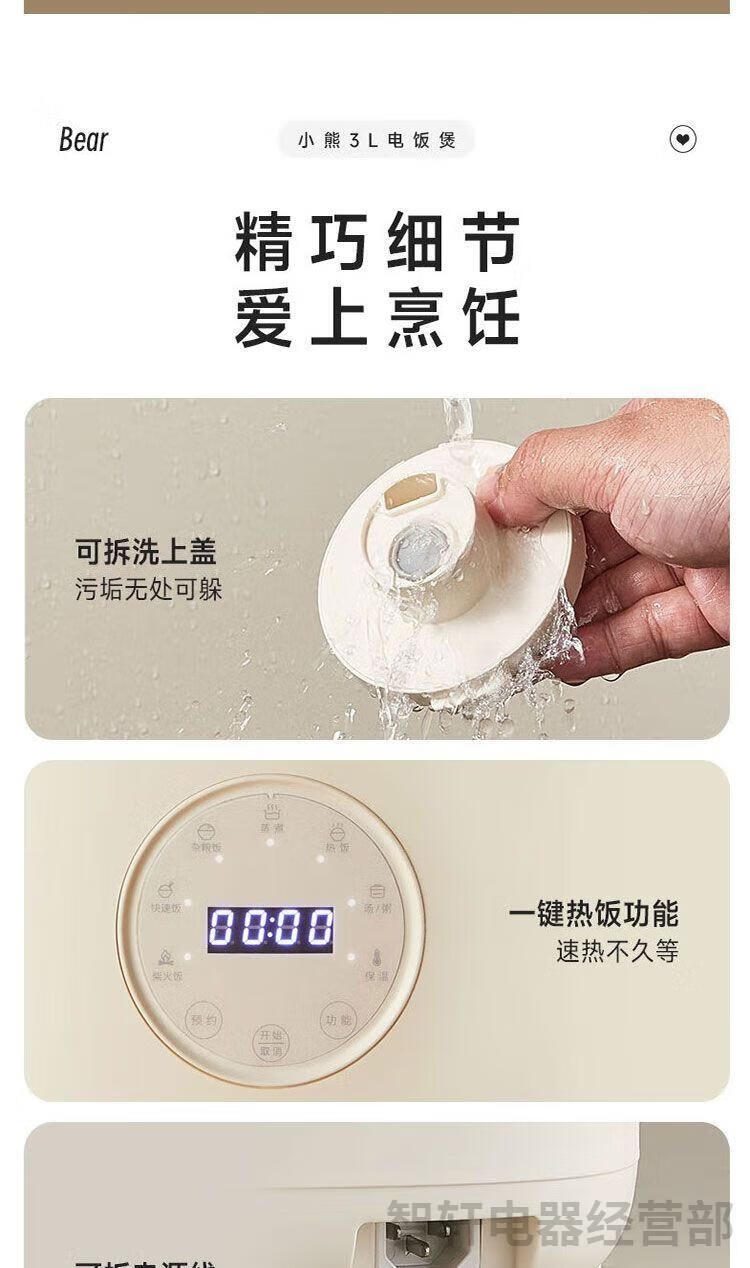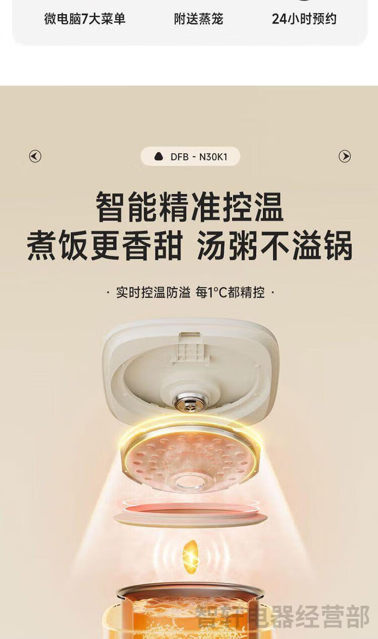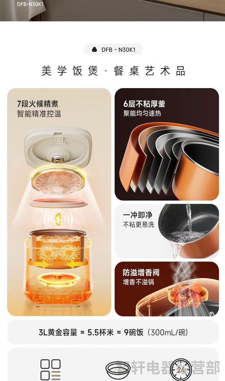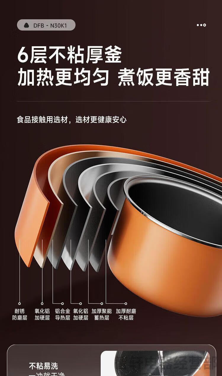 1、6层不粘厚釜加热更均匀 煮饭更香甜 2、不粘易洗一冲就干净 3、专研防溢增香阀 4、饭汤粥都会做,全程无需看管 5、24小时长预约 6、可拆洗上盖污垢无处可躲